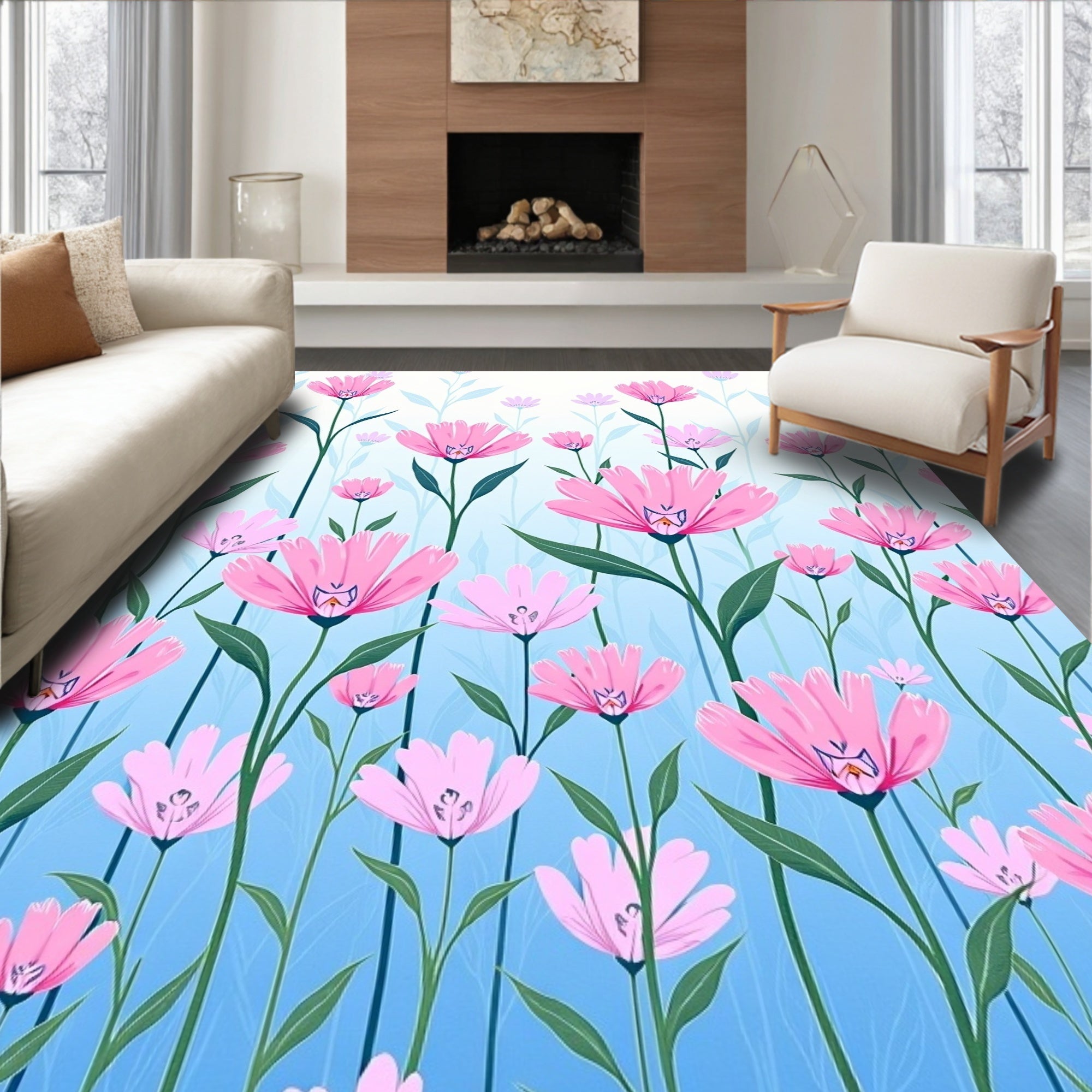 Flatwoven High Traffic Area Rug, Whimsical Garden Botanical Meadow Illustration Arrangement, Non Slip, Stain Resistant, Washable Area Rugs for Living Room, Bedroom (Pink) Overview: