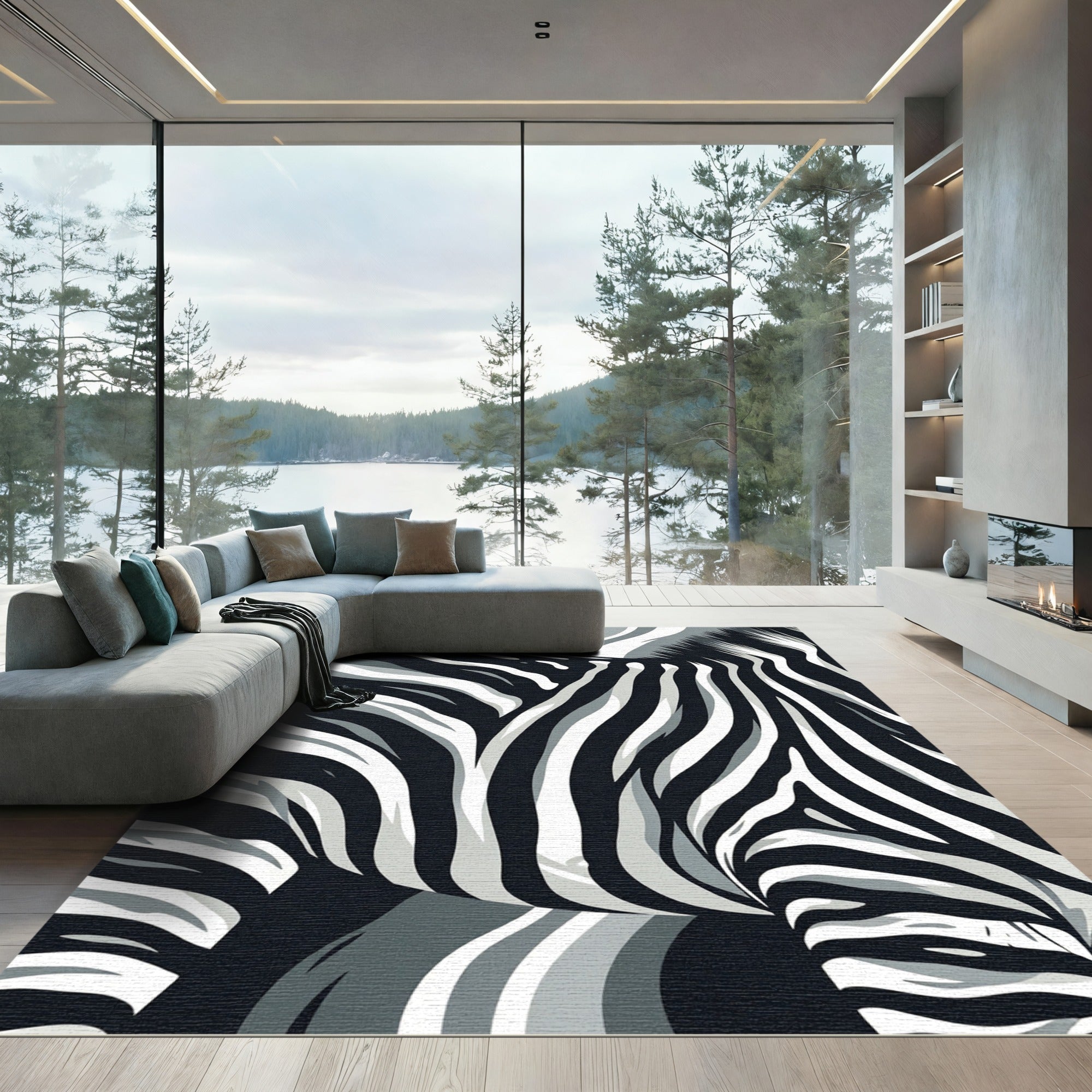 Elevate your space with this striking modern area rug, featuring a bold, abstract interpretation of organic zebra stripes. The high-contrast black, white, and charcoal palette creates an immediate focal point, perfectly suited for a sophisticated living room or a high-impact hallway. Crafted to handle the demands of active households, this durable design offers incredible longevity without sacrificing style. Maintenance is effortless, as the low pile is fully machine washable for quick refreshing. Committed to your home’s well-being, every piece is certified OEKO-TEX Standard 100, ensuring it is free from harmful substances. Available in diverse sizes, this piece seamlessly blends functional ease with contemporary, high-fashion impact.