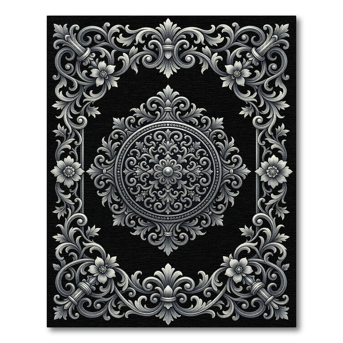Rooted in the grand tradition of European baroque mastery, this design evokes the intricate ironwork of Parisian balconies and the hallowed stone carvings of Renaissance cathedrals. It is a visual dialogue between the stark, void-black base and the luminous, silver-toned relief, recalling the light-catching quality of sterling silverware against dark velvet. This is the Neo-Gothic revival for the contemporary home, bridging the gap between old-world opulence and current architectural minimalism. Step onto this scene, and the floor transforms from a simple surface into a structured landscape—rooms deepen, shadows find elegance, and the atmosphere shifts toward a quiet, regal stillness. It is crafted for the seeker of depth, the heart-led homebuilder who understands that luxury is found in the interplay of shadow and light. This is not just a floor covering—it is a foundation for living in reverence. Don't just decorate your space; anchor it.