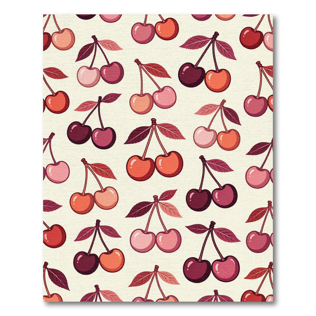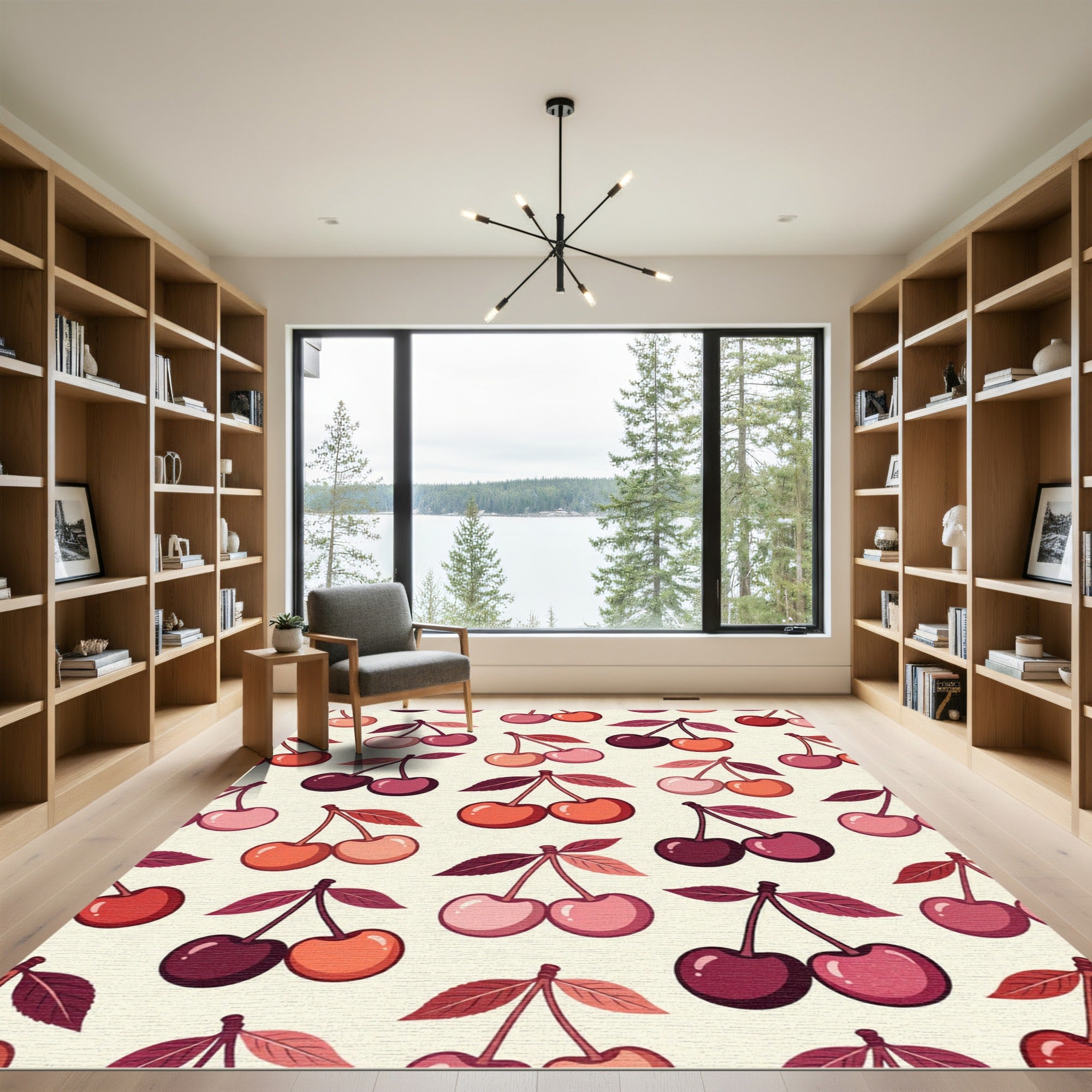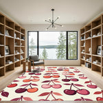 This design echoes the joyful exuberance of mid-century novelty prints and the cheerful optimism of retro roadside diners. Imagine the sun-drenched aesthetic of 1950s California leisure, where playful motifs adorned everything from kitchenware to car upholstery. These stylized cherries, bursting with color – a medley of blush pink, vibrant coral, and deep ruby – evoke a sense of sweet nostalgia and lighthearted fun. They aren't just fruit; they're symbols of summer's simple pleasures, rendered with a smooth, almost cartoonish charm. Placing this rug transforms a room, infusing it with an infectious sense of playfulness. Walls seem to smile, and the air feels lighter, brimming with a vintage, yet timeless, charm. It’s for the soul that finds happiness in the everyday, the individual who believes that even functional spaces should spark joy and conversation. This rug isn't merely a floor covering; it's an invitation to embrace life with a sweet, cheerful spirit, a vibrant reminder that joy can be found in the most delightful details.