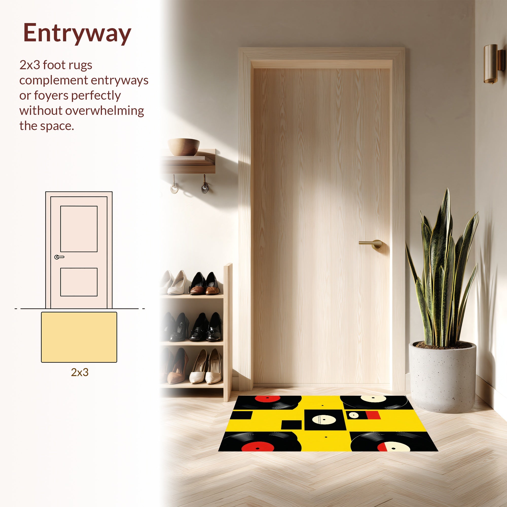 Flatwoven High Traffic Area Rug, Vinyl Record Accent, Non Slip, Stain Resistant, Washable Area Rugs for Living Room, Bedroom (Black) Overview:
