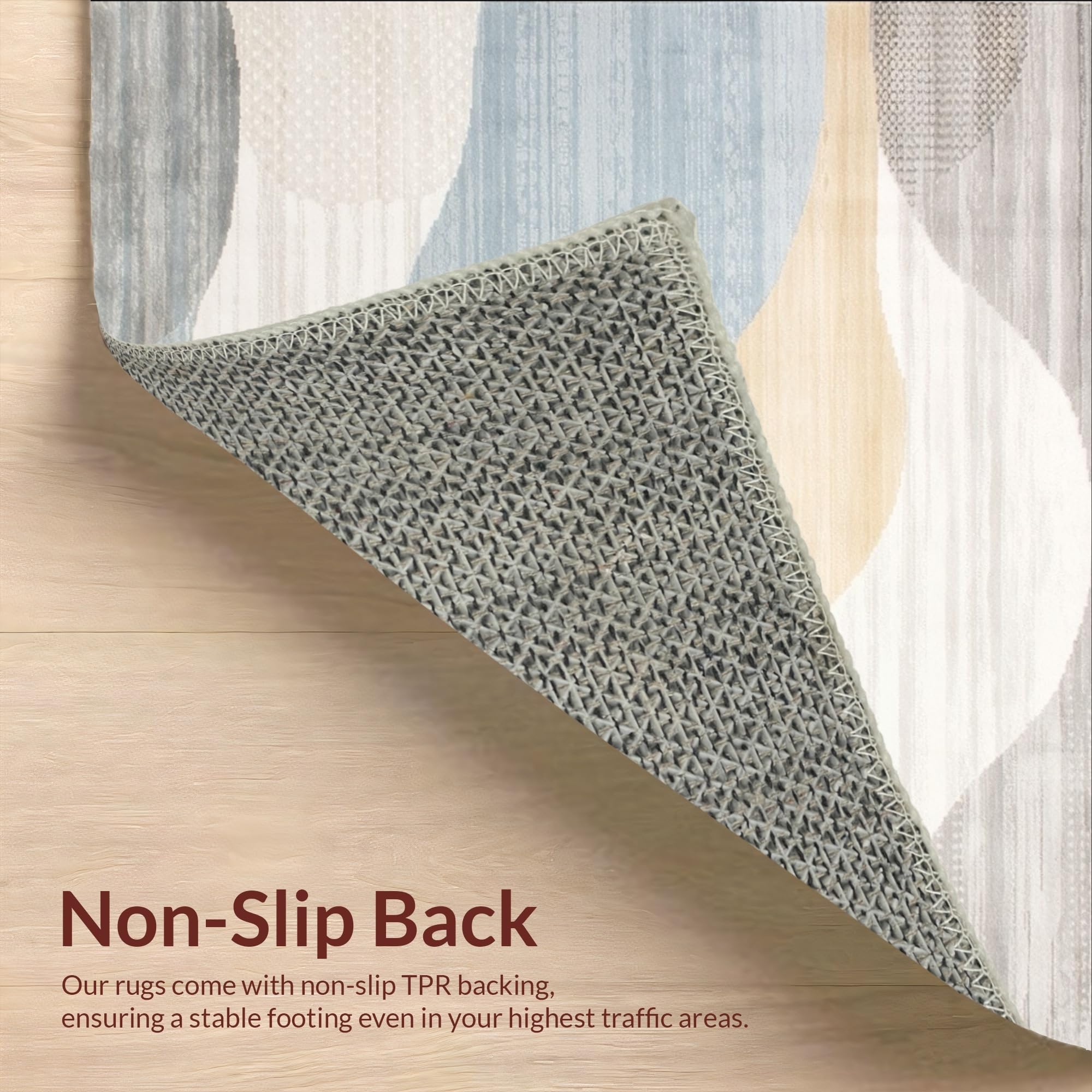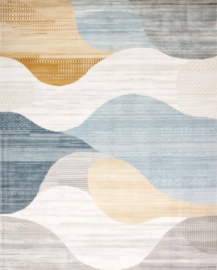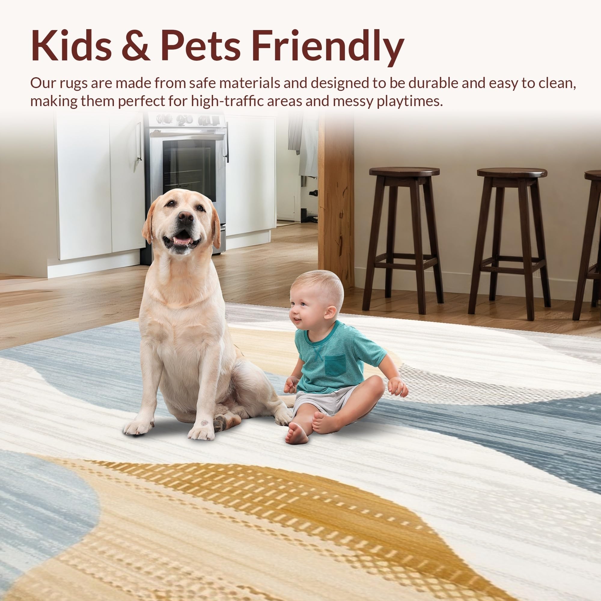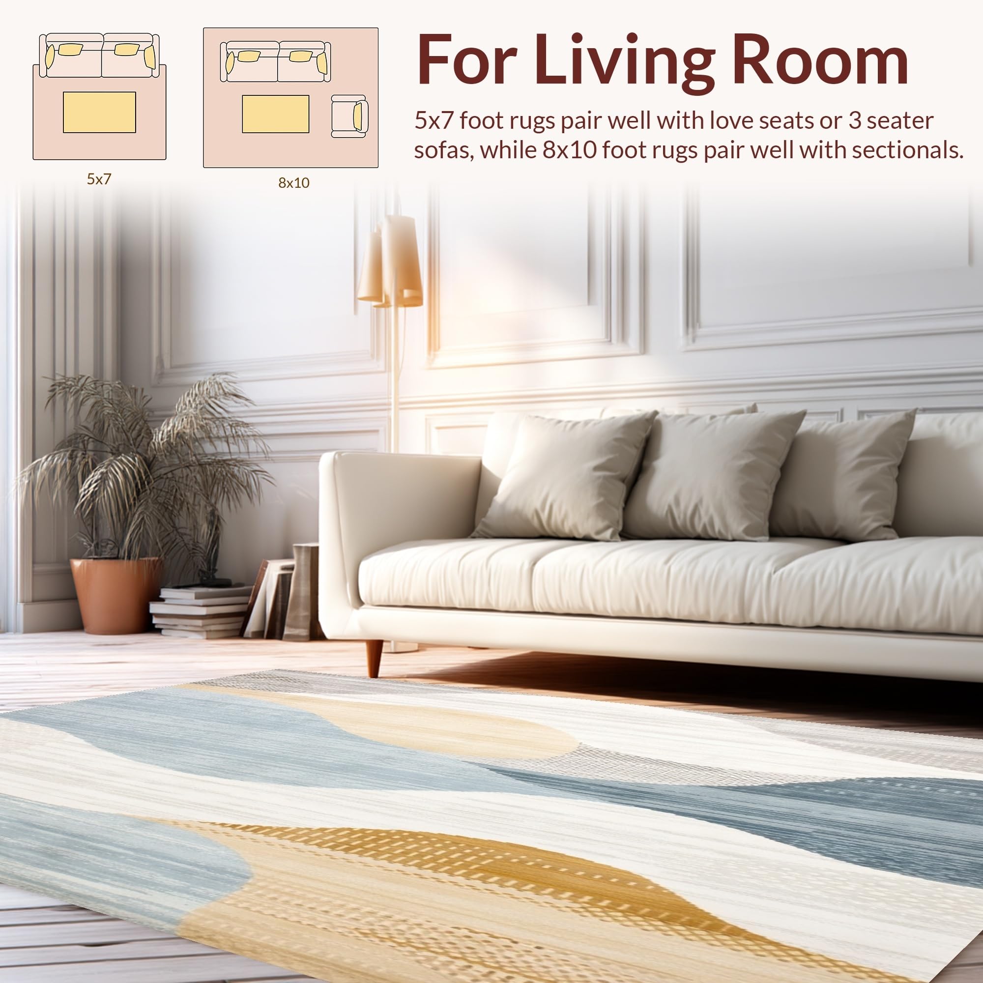 Ultra Soft Area Rug, Non Slip, Stain Resistant, Washable Area Rugs for Living Room, Bedroom, Abstract Contemporary with Layered Beige and Blue Geometric Waves(Beige) Overview: