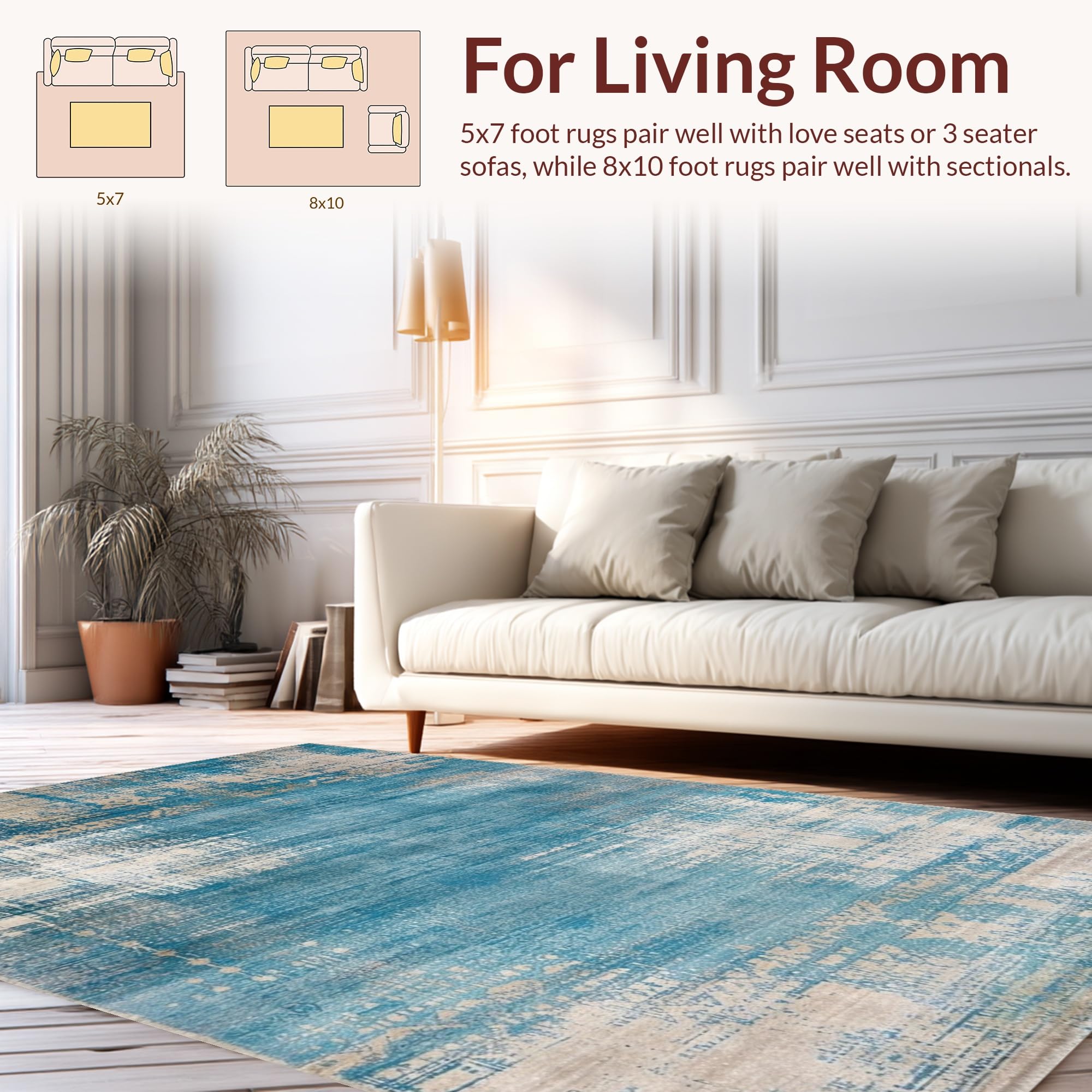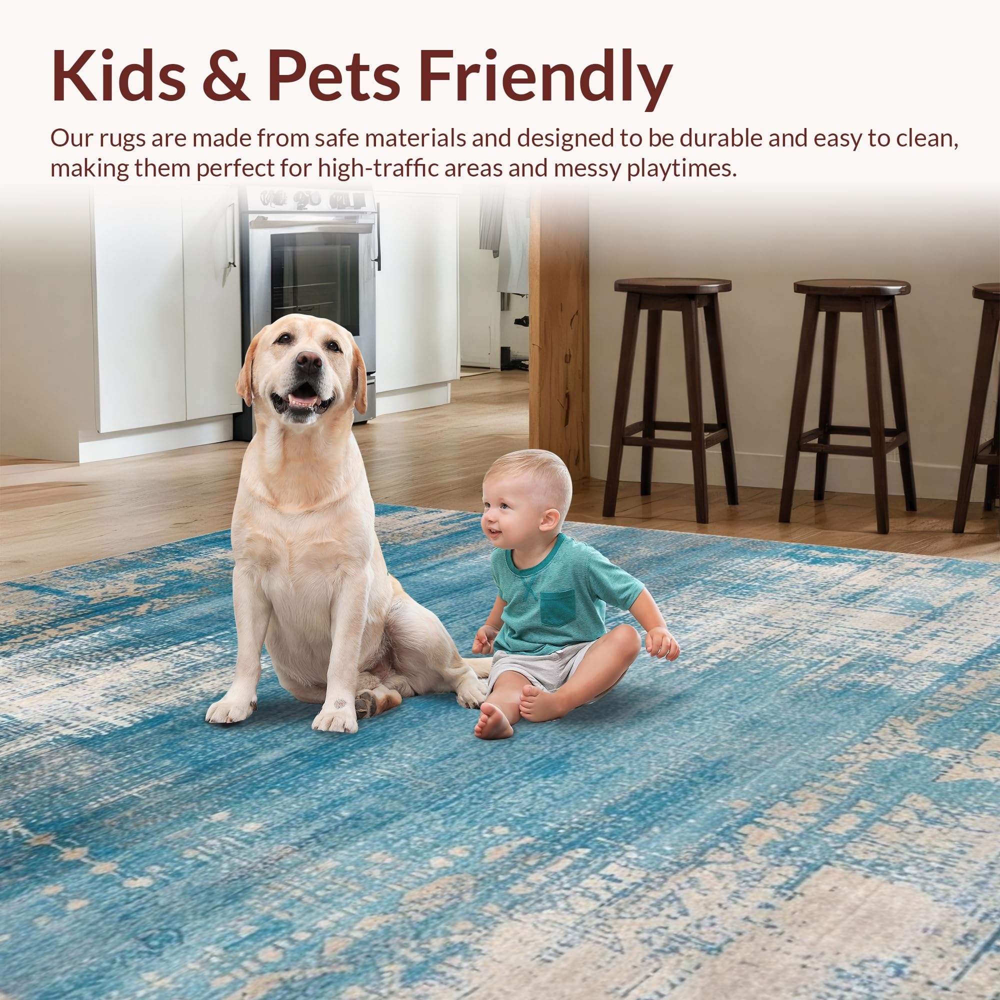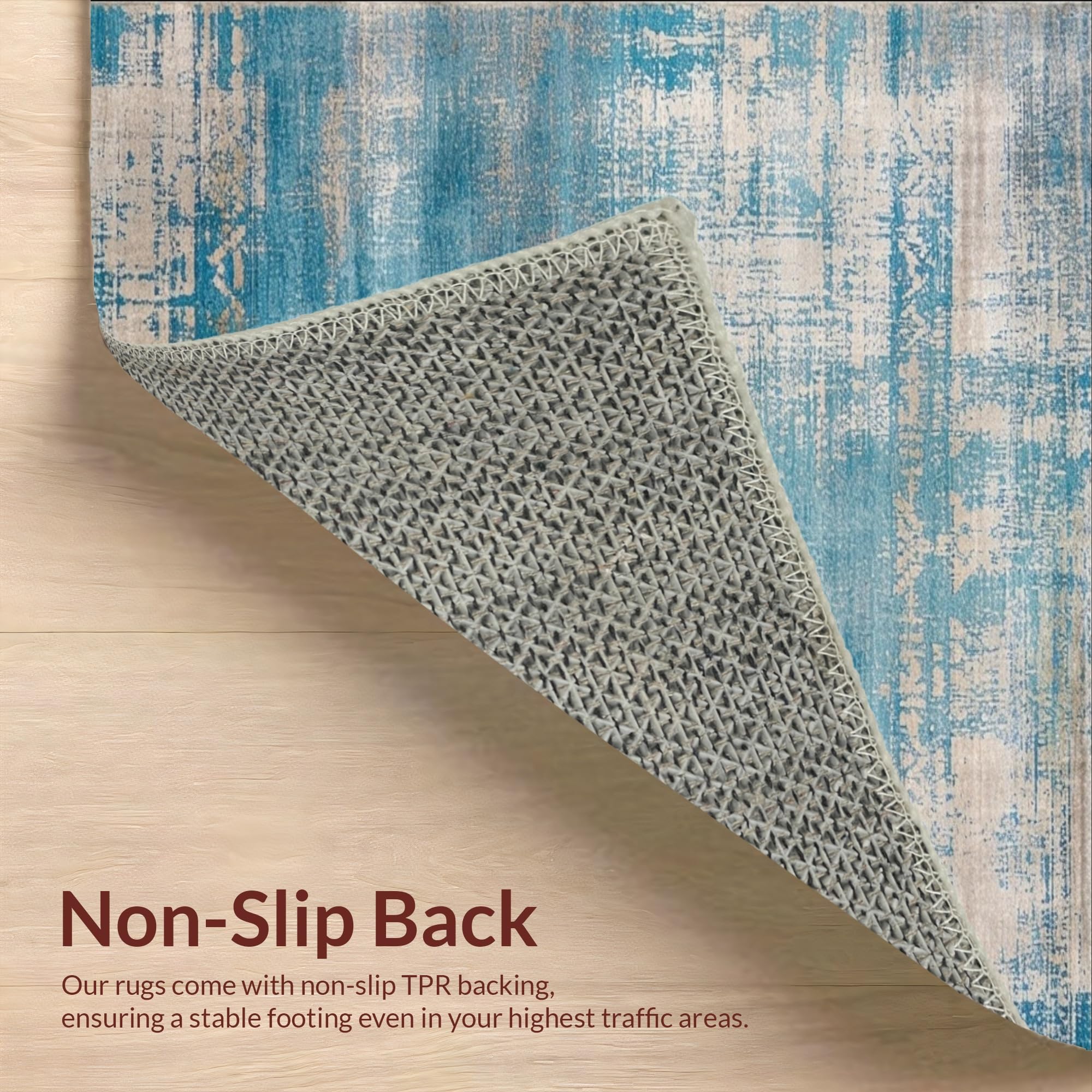 Ultra Soft Area Rug, Non Slip, Stain Resistant, Washable Area Rugs for Living Room, Bedroom, Abstract Distressed Area Over Dyed Vintage Beige Blue(Blue) Overview: