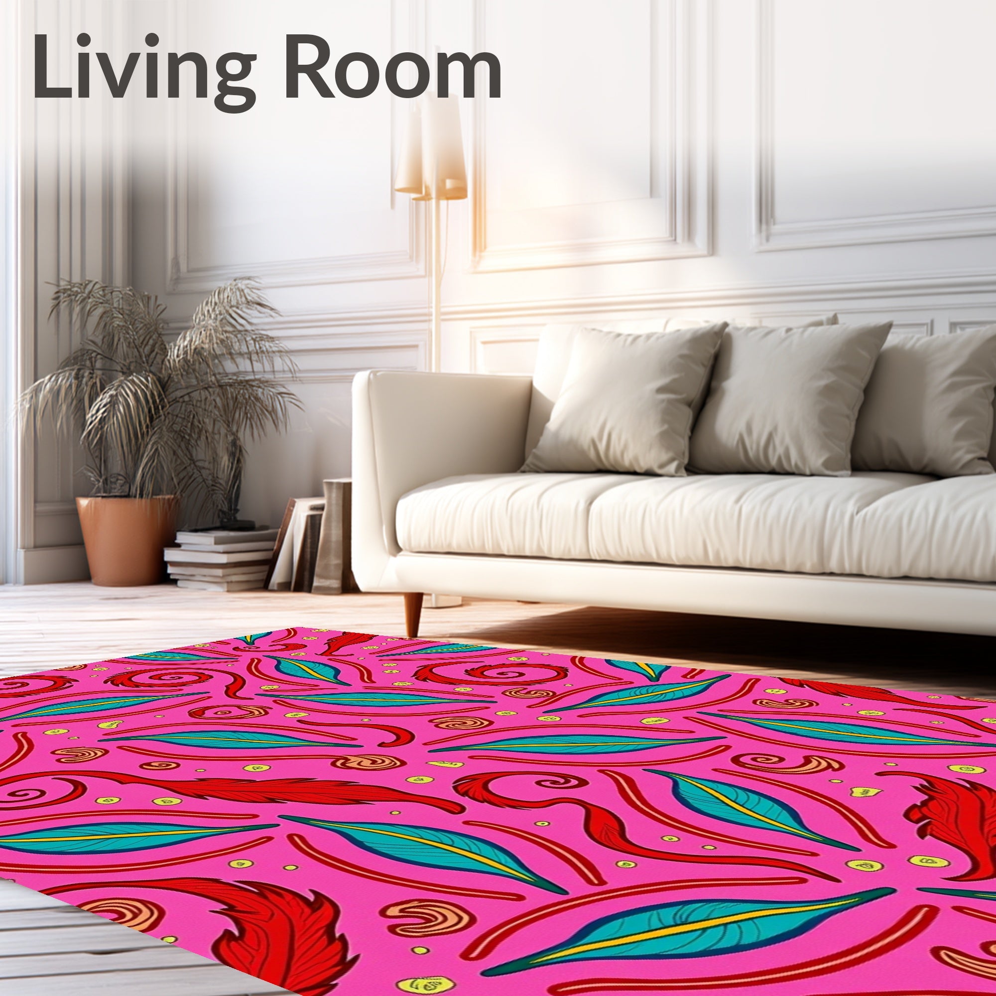 Flatwoven High Traffic Area Rug, Abstract Feathered Swirl with Lively Festive Accents, Non Slip, Stain Resistant, Washable Area Rugs for Living Room, Bedroom (Pink) Overview: