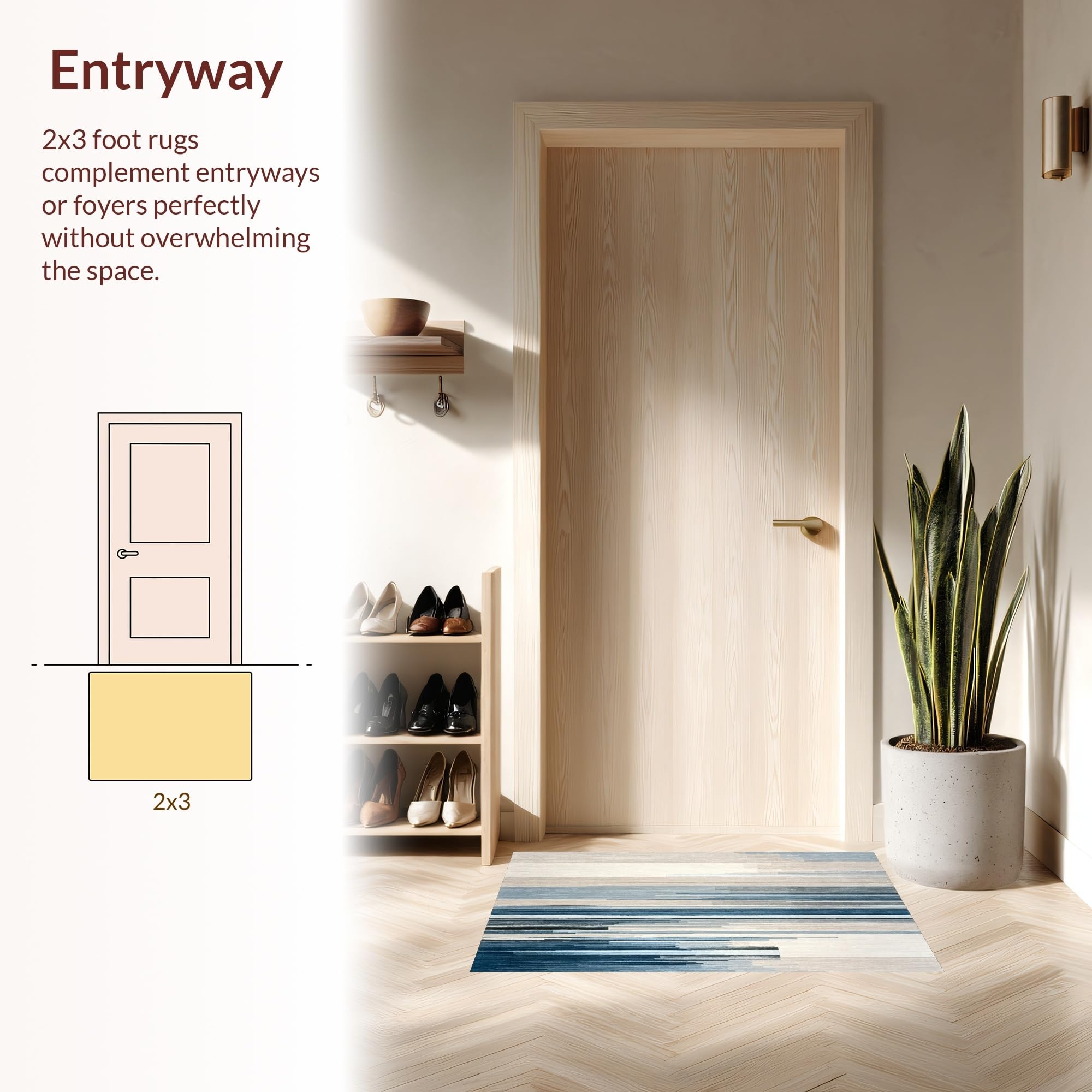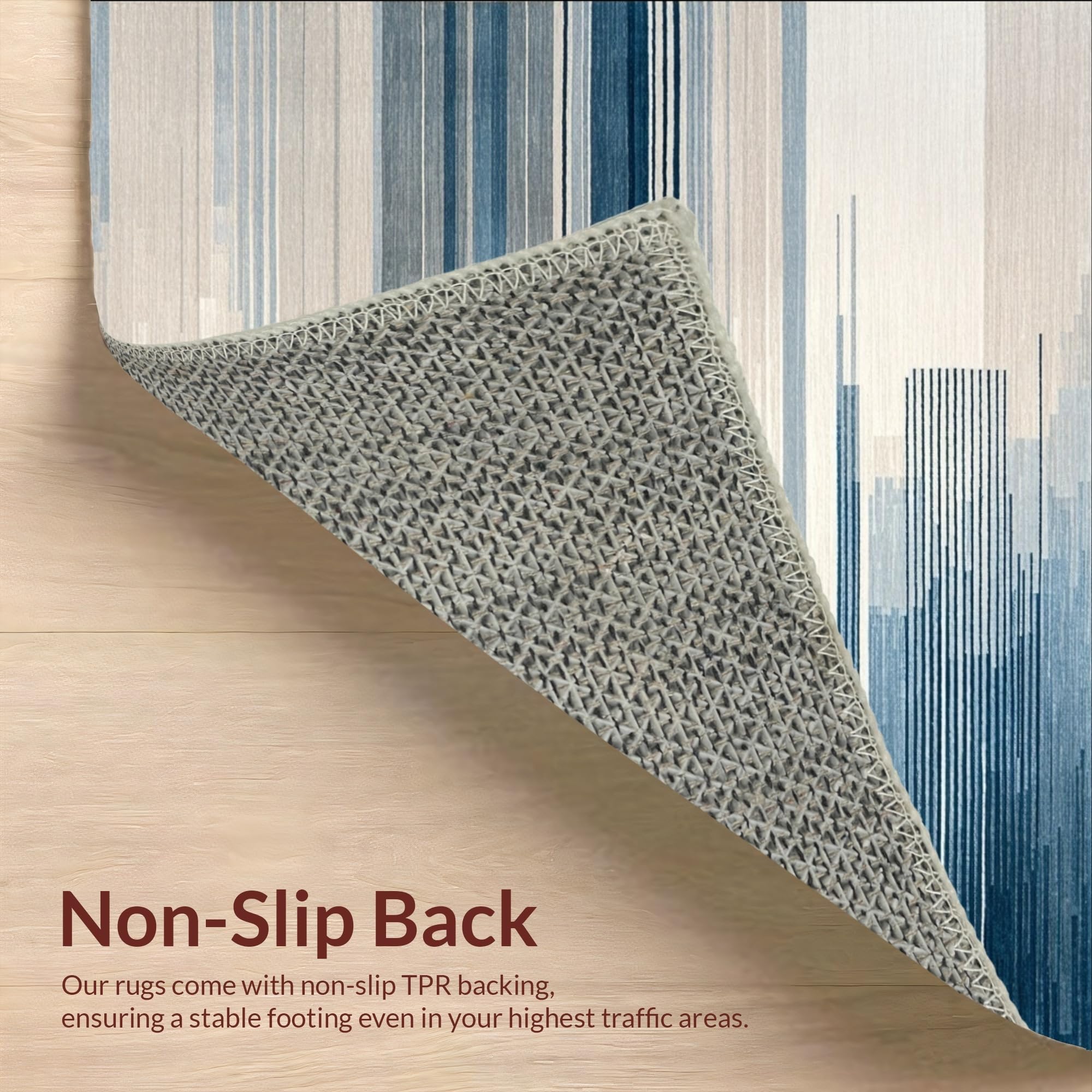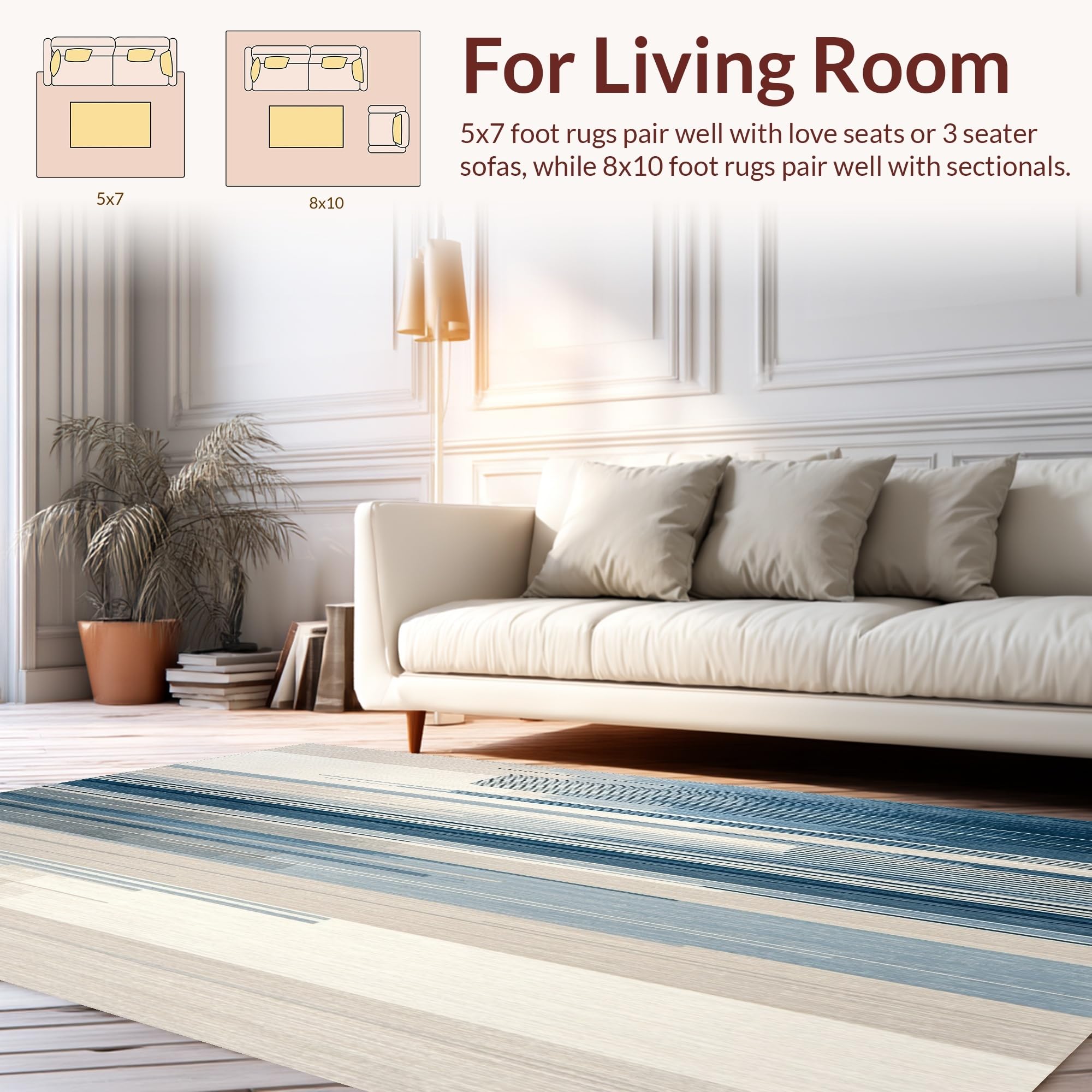 Ultra Soft Area Rug, Non Slip, Stain Resistant, Washable Area Rugs for Living Room, Bedroom, Abstract Fluid Stripe in Neutral Beige and Gray with Cool Blue Highlights(Beige) Overview: