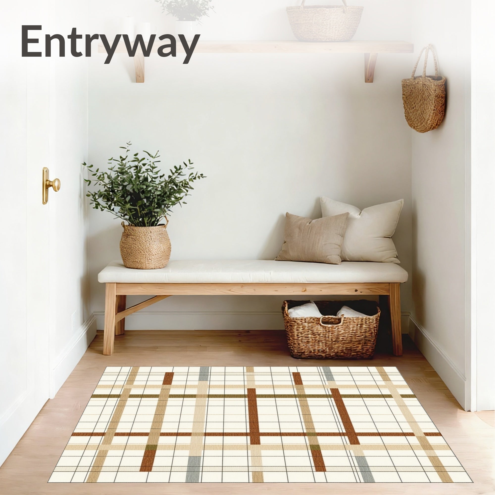 Ultra Soft Area Rug, Non Slip, Stain Resistant, Washable Area Rugs for Living Room, Bedroom, Abstract Geometric Area with Neutral Checkerboard and Linear Accents(Beige) Overview: