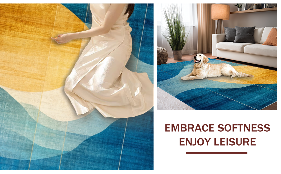 Ultra Soft Area Rug, Non Slip, Stain Resistant, Washable Area Rugs for Living Room, Bedroom, Abstract Horizon Rug with Blue Gold Ombre, Modern Geometric Linework(Blue) Overview: