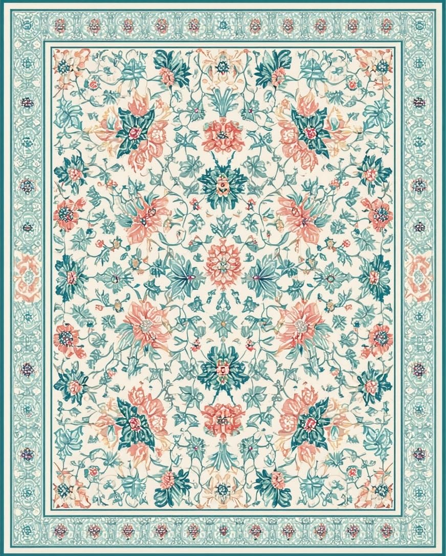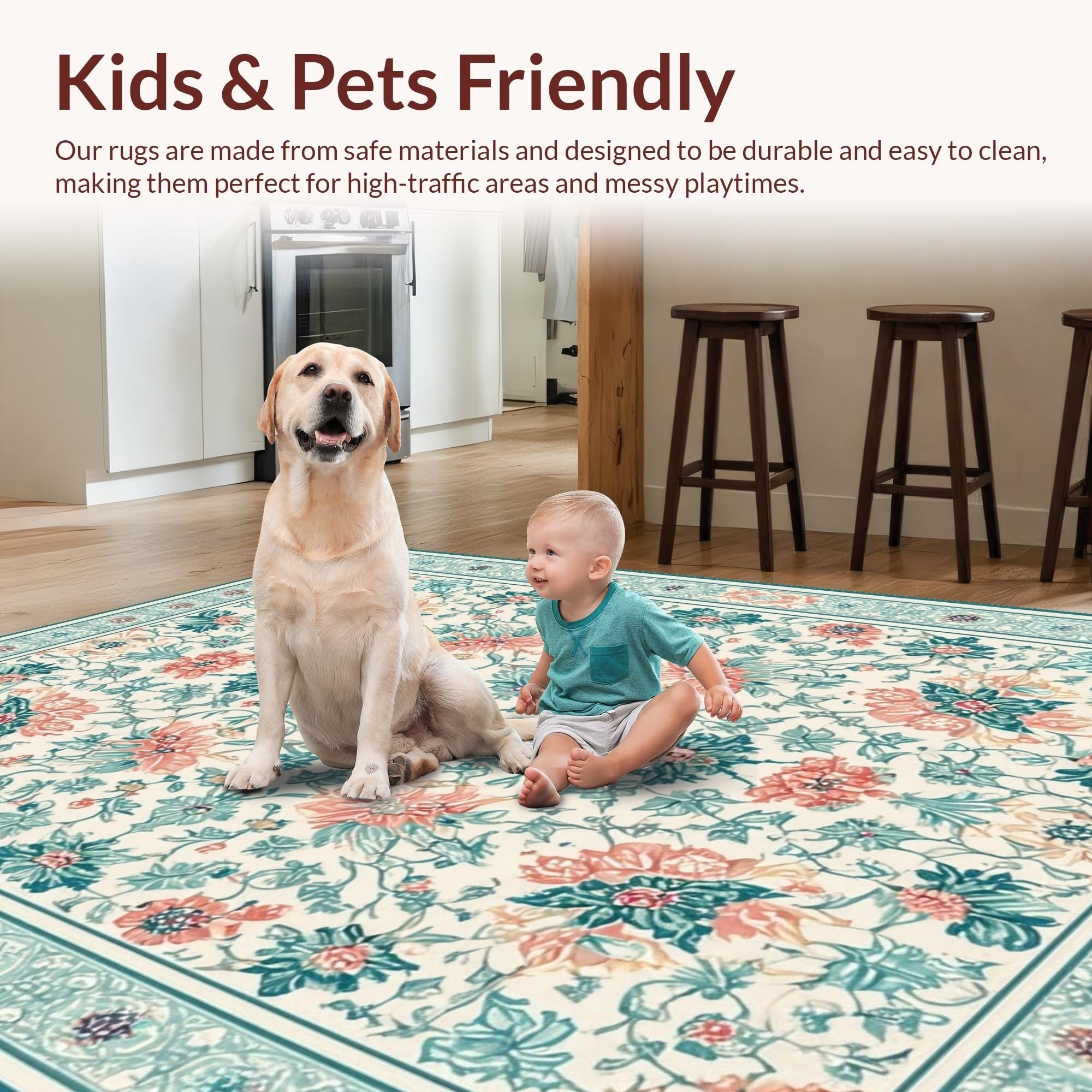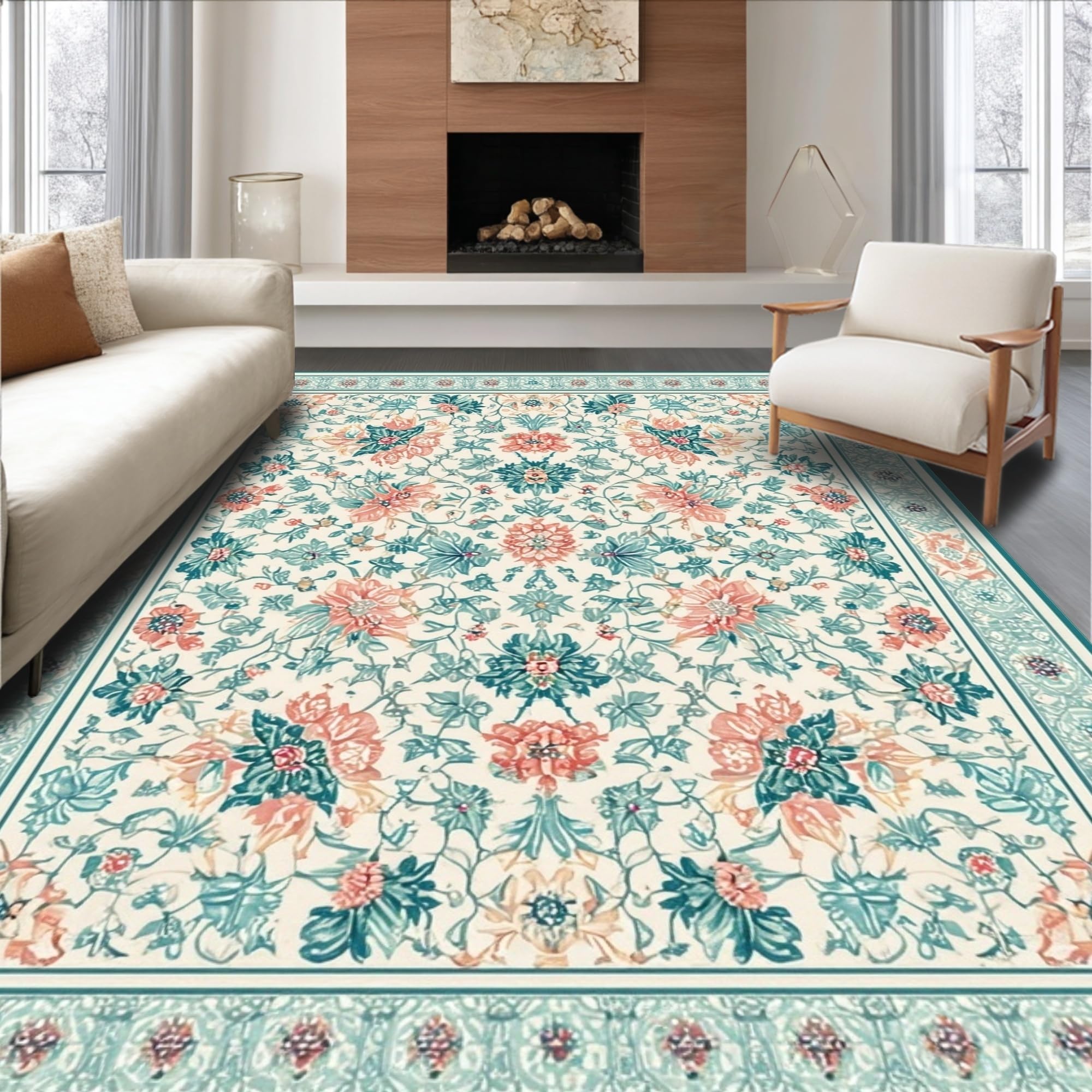 Ultra Soft Area Rug, Non Slip, Stain Resistant, Washable Area Rugs for Living Room, Bedroom, Aqua Bloom Rug Floral Tile Pattern with Peach Highlights(Beige) Overview: