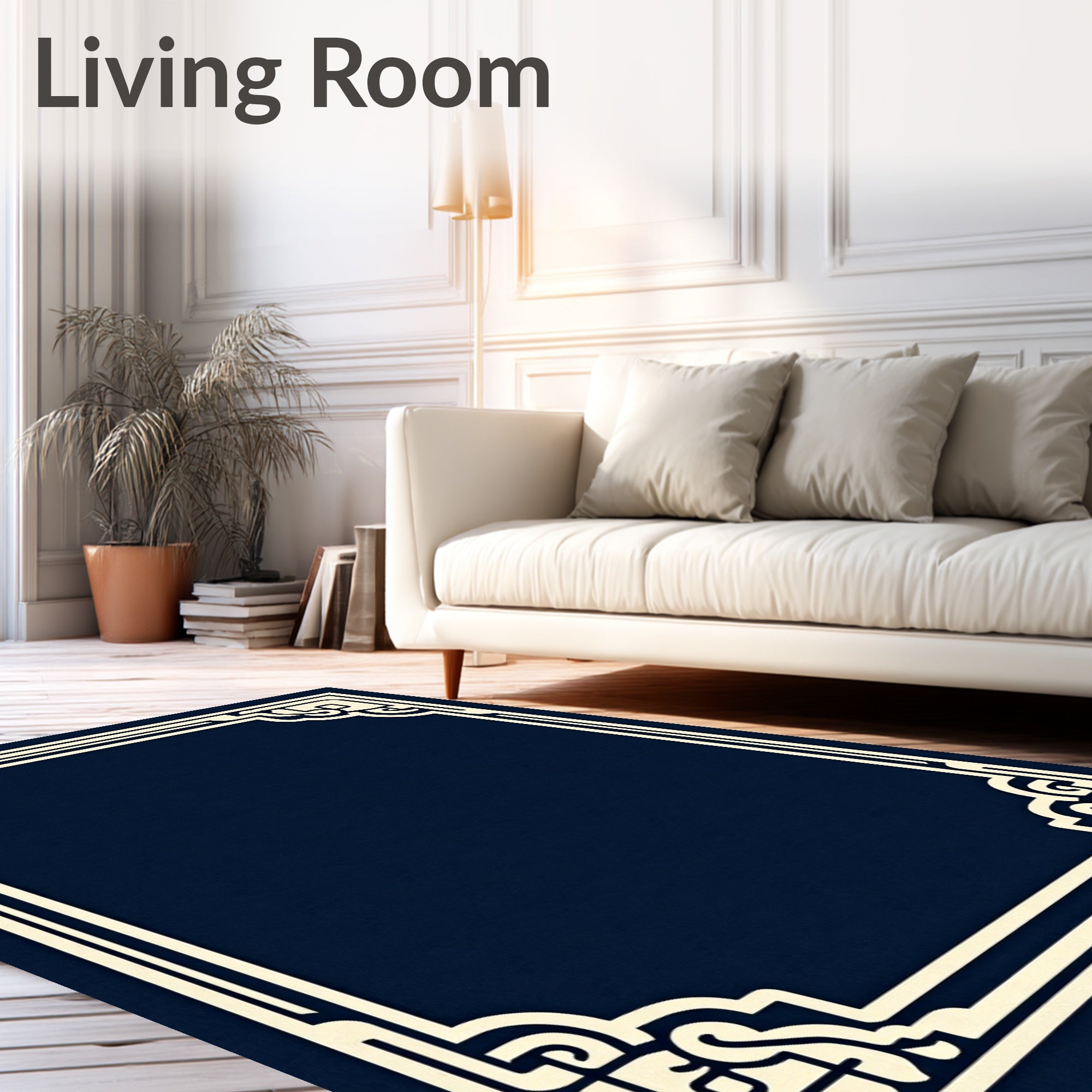 Ultra Soft Area Rug, Non Slip, Stain Resistant, Washable Area Rugs for Living Room, Bedroom, Art Inspired Interlocking Fretwork with Subtle Medallion Border(Blue) Overview: