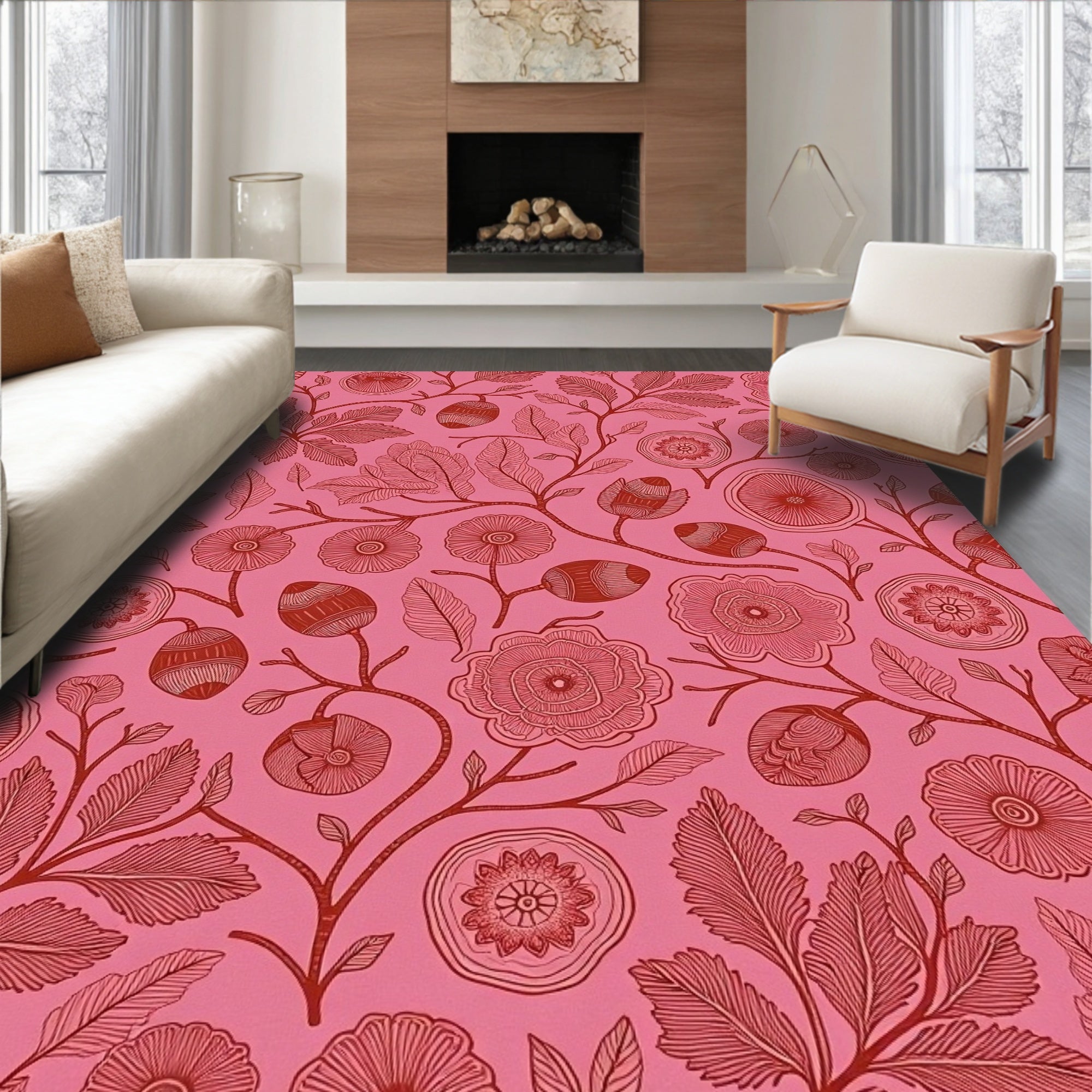 Flatwoven High Traffic Area Rug, Art Nouveau Forest Canopy with Flourishing Acorn Details, Non Slip, Stain Resistant, Washable Area Rugs for Living Room, Bedroom (Pink) Overview: