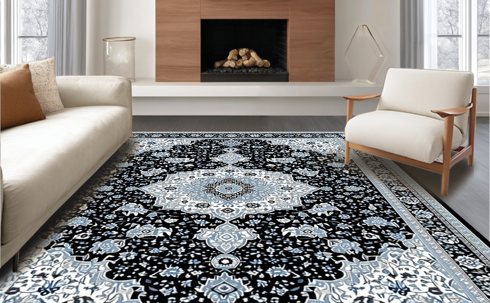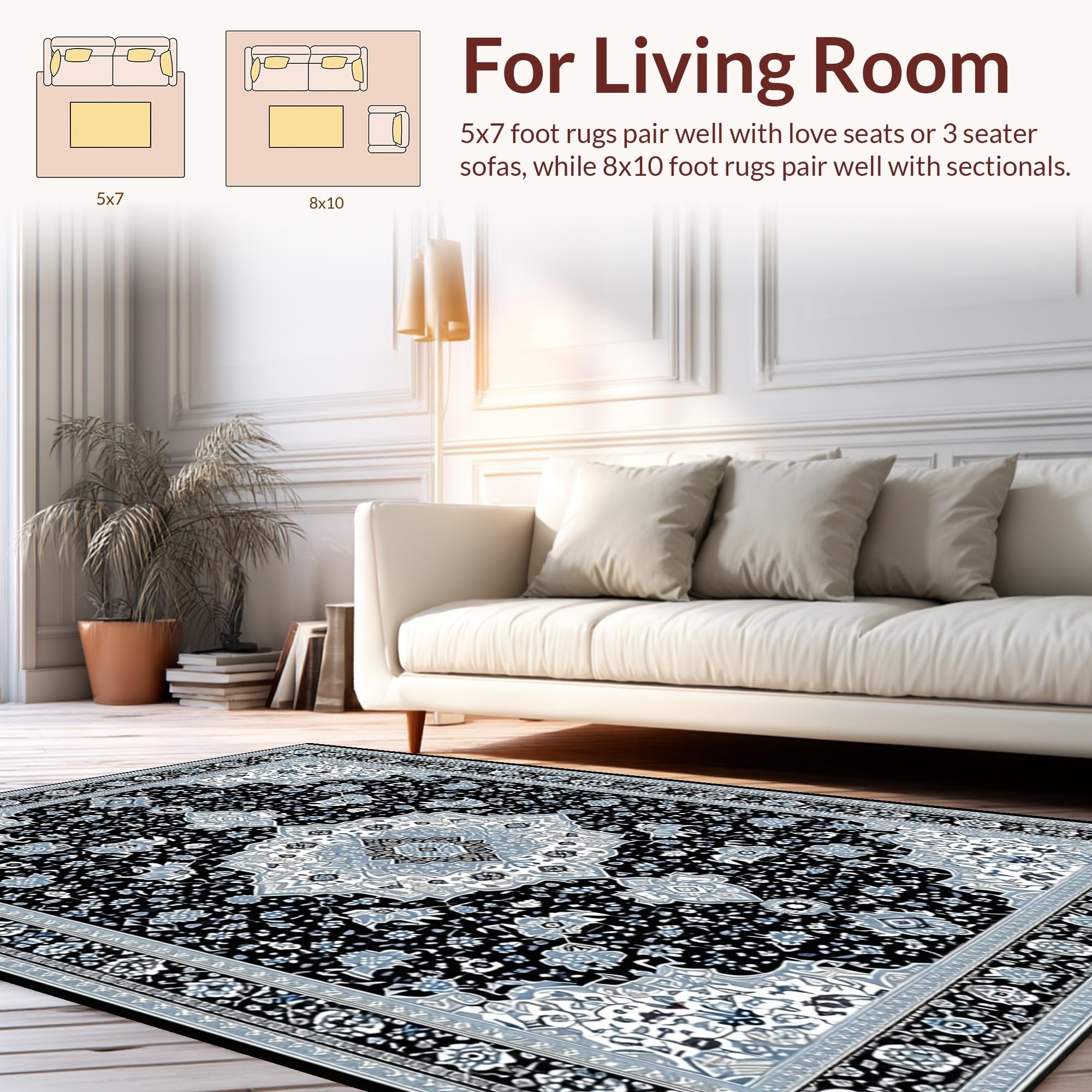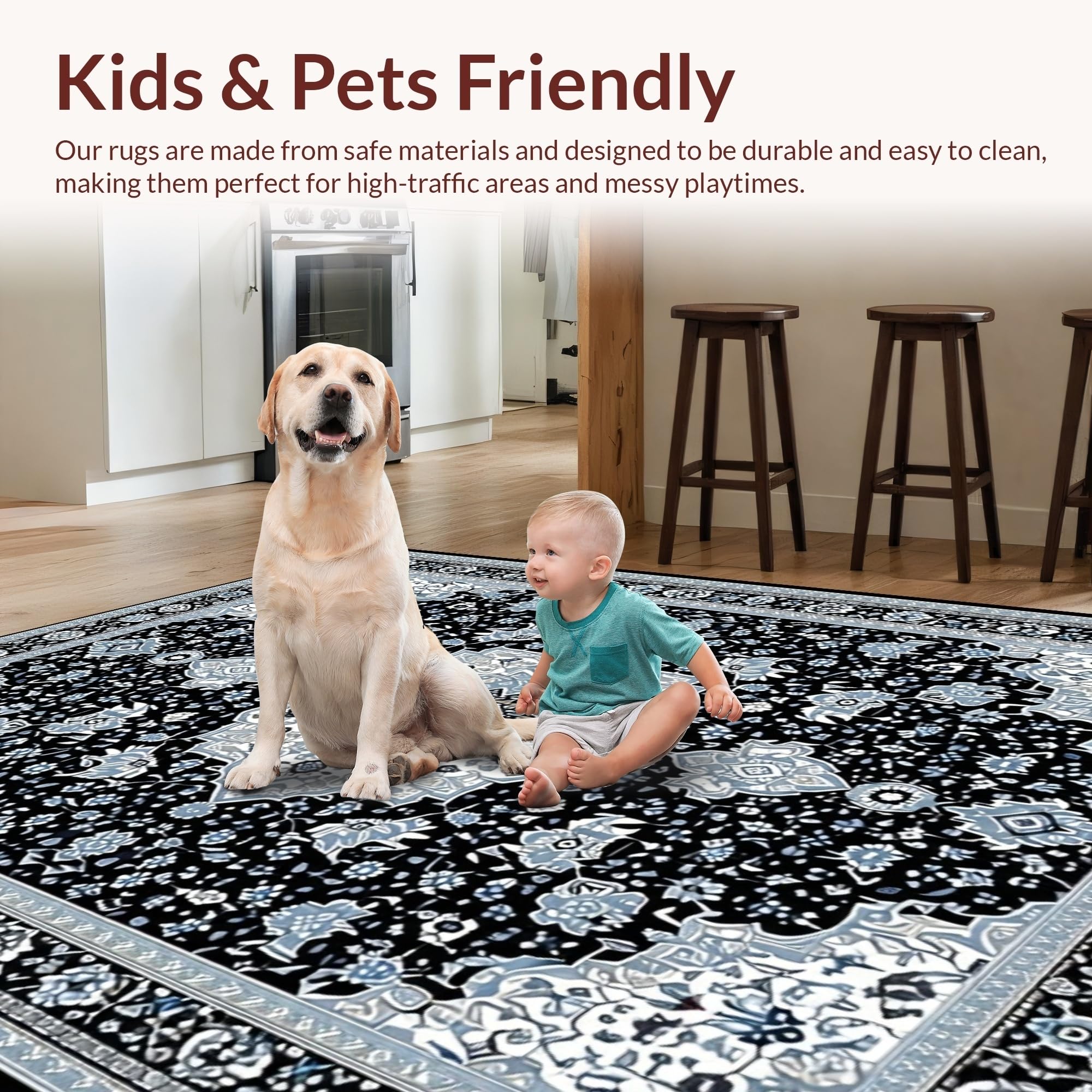 Ultra Soft Area Rug, Non Slip, Stain Resistant, Washable Area Rugs for Living Room, Bedroom, Artful Vintage Oriental Elegance(Black) Overview:
