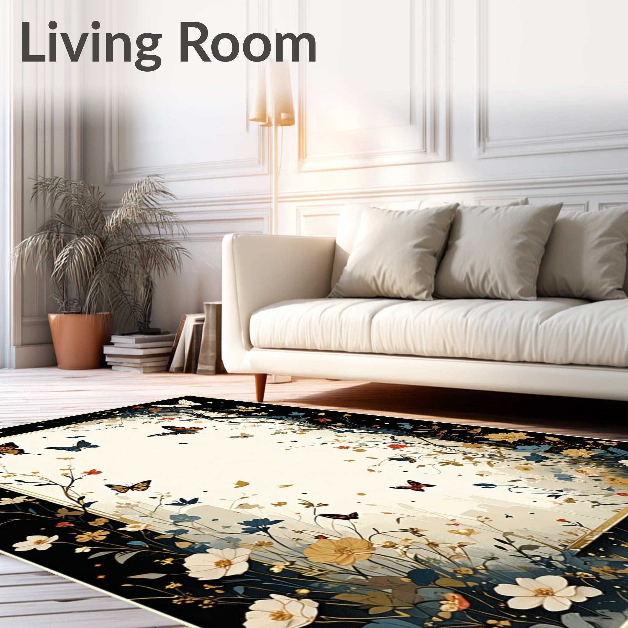 Flatwoven High Traffic Area Rug, Artisan Black Boho with Fantastical Botanical and Moth Accents, Non Slip, Stain Resistant, Washable Area Rugs for Living Room, Bedroom (Ivory) Overview:
