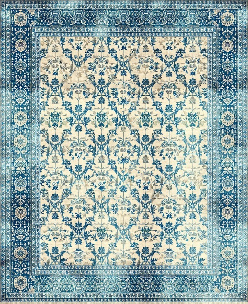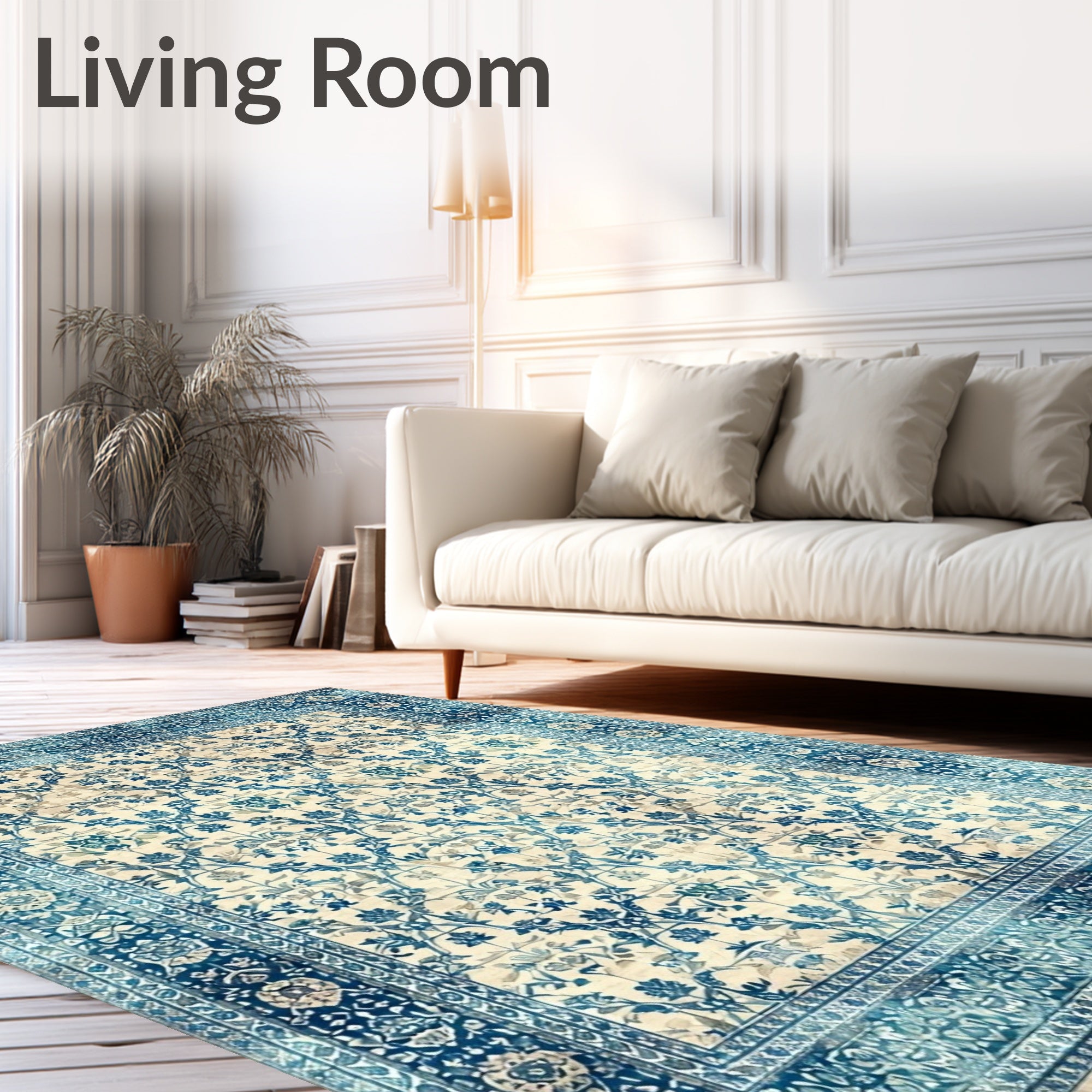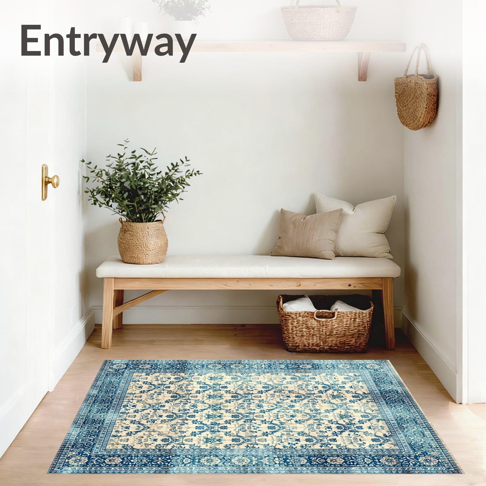 Ultra Soft Area Rug, Non Slip, Stain Resistant, Washable Area Rugs for Living Room, Bedroom, Artisan Distressed Blue Beige Latticework Vintage Botanical(Beige) Overview: