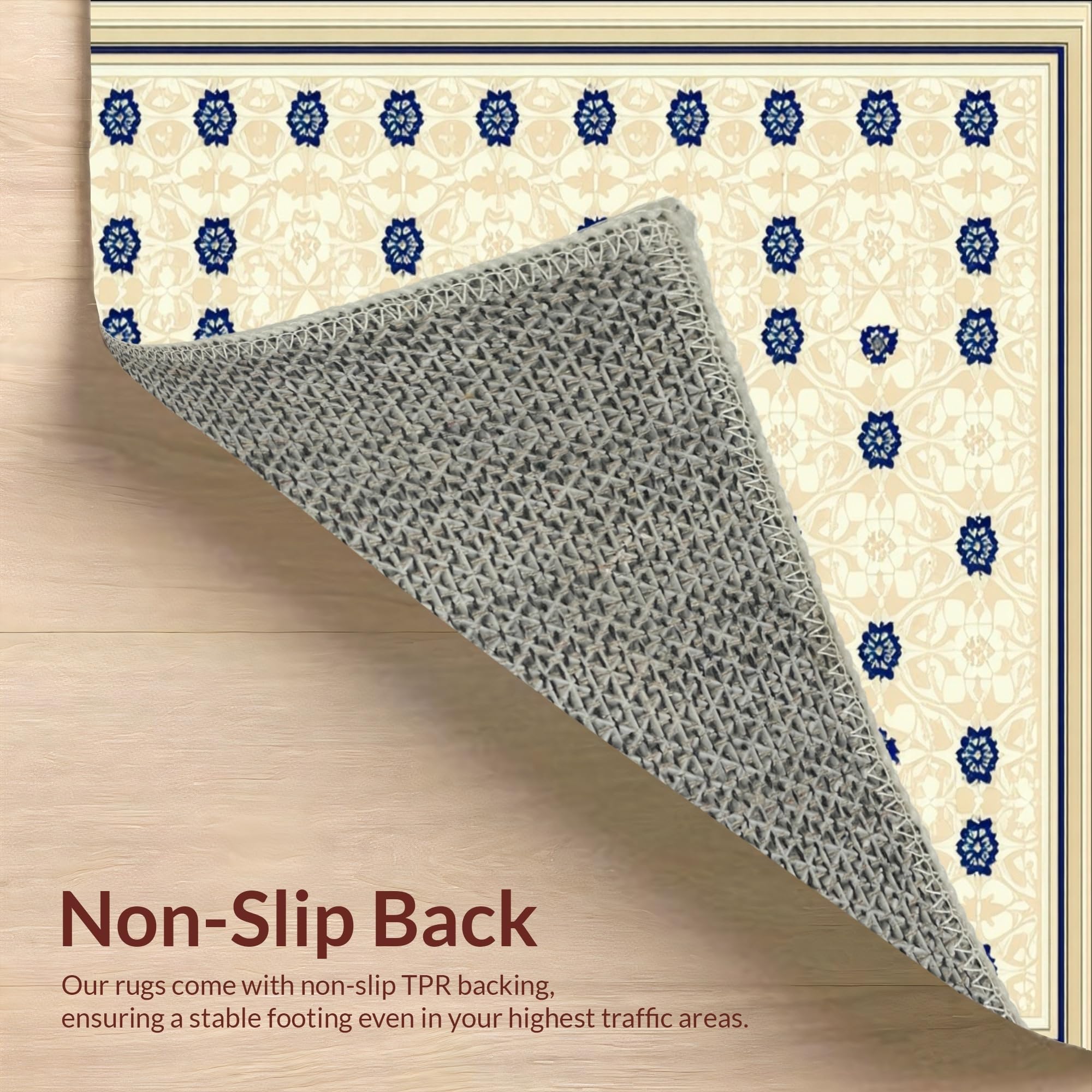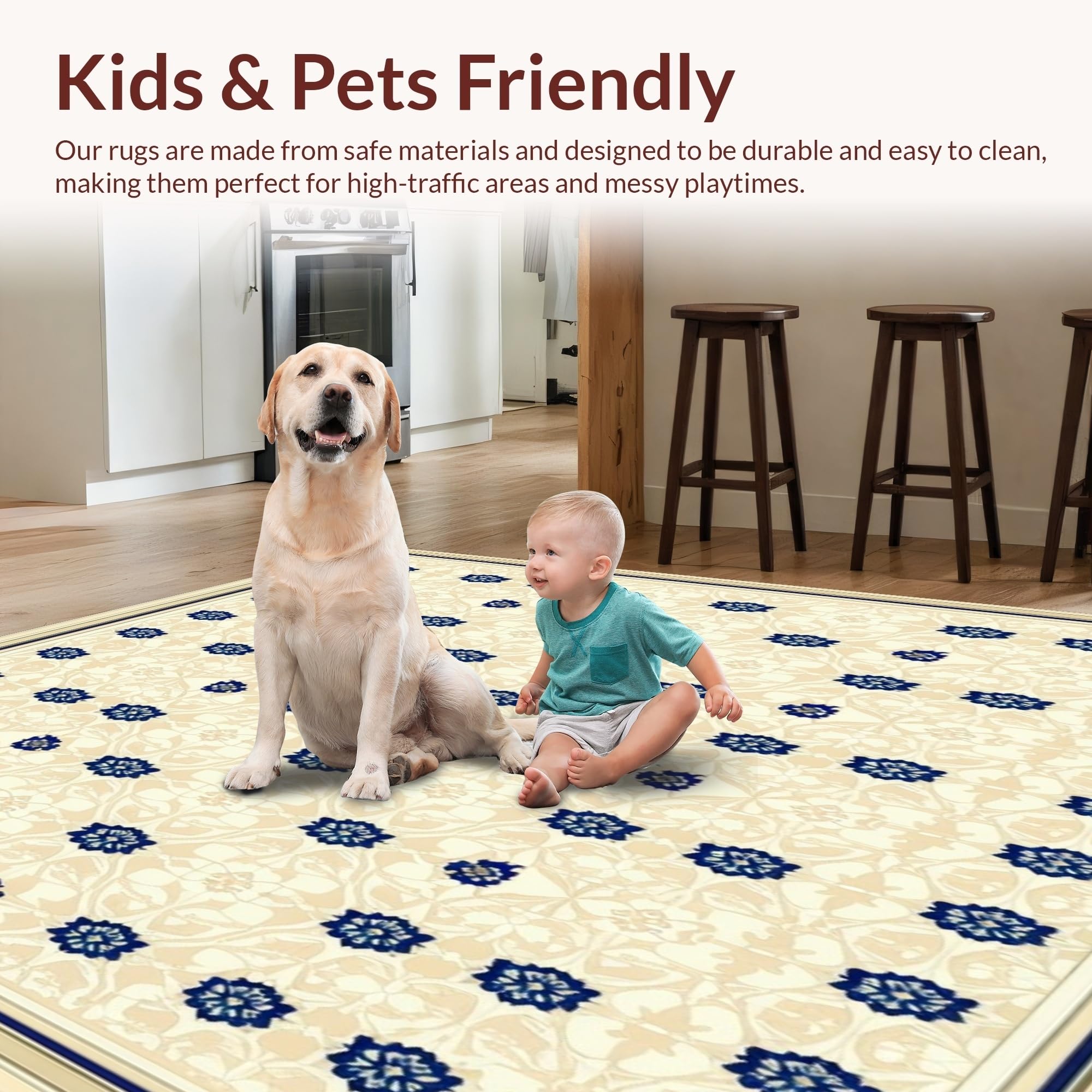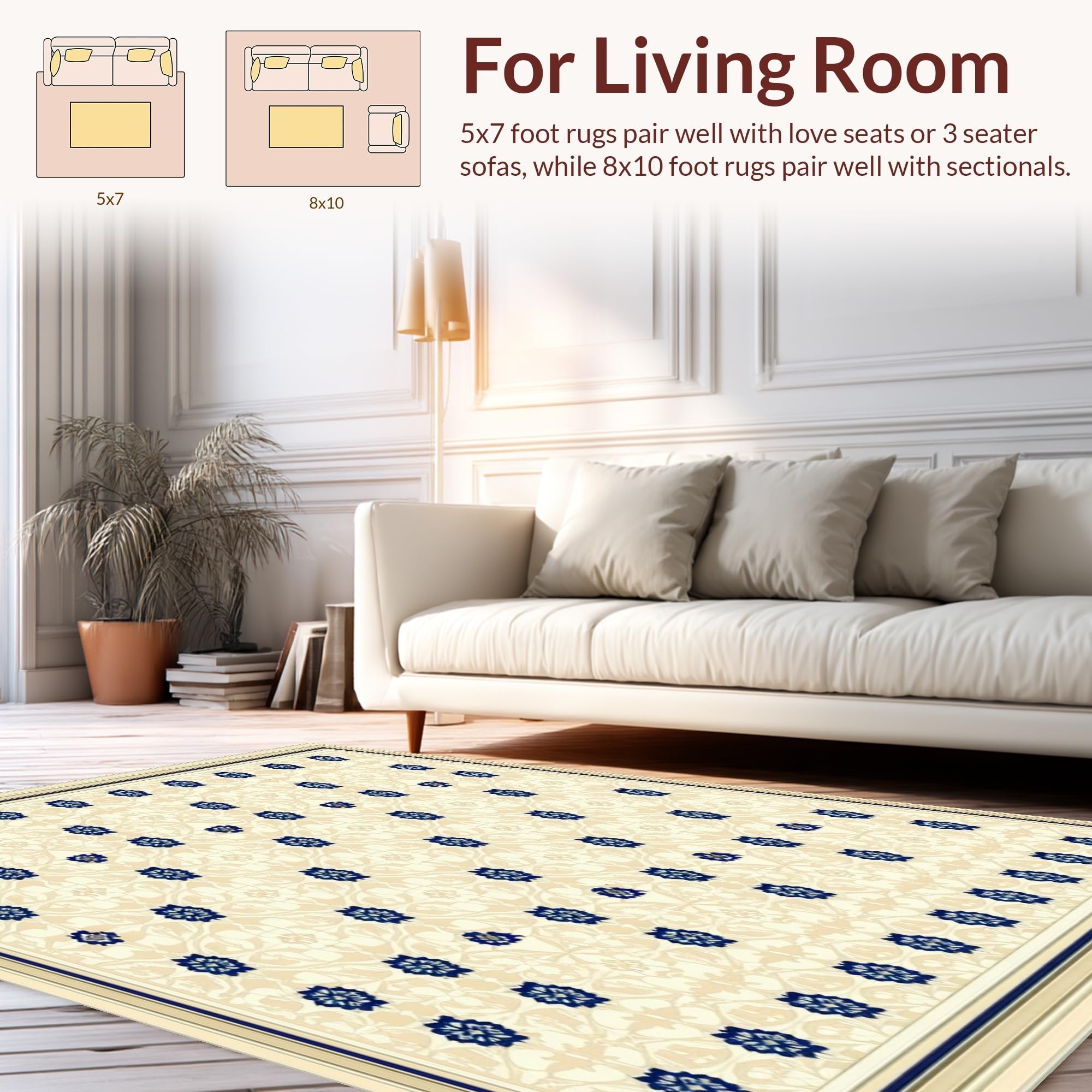 Ultra Soft Area Rug, Non Slip, Stain Resistant, Washable Area Rugs for Living Room, Bedroom, Artisan Filigree Area Featuring Classic Lattice and Blue Floral Accents(Beige) Overview: