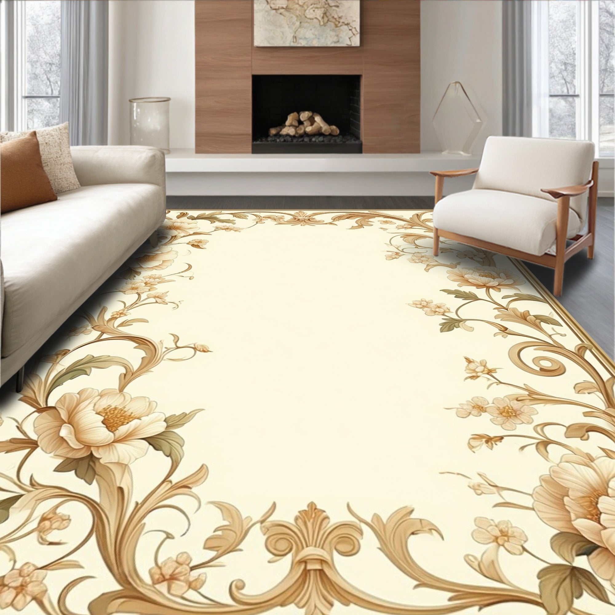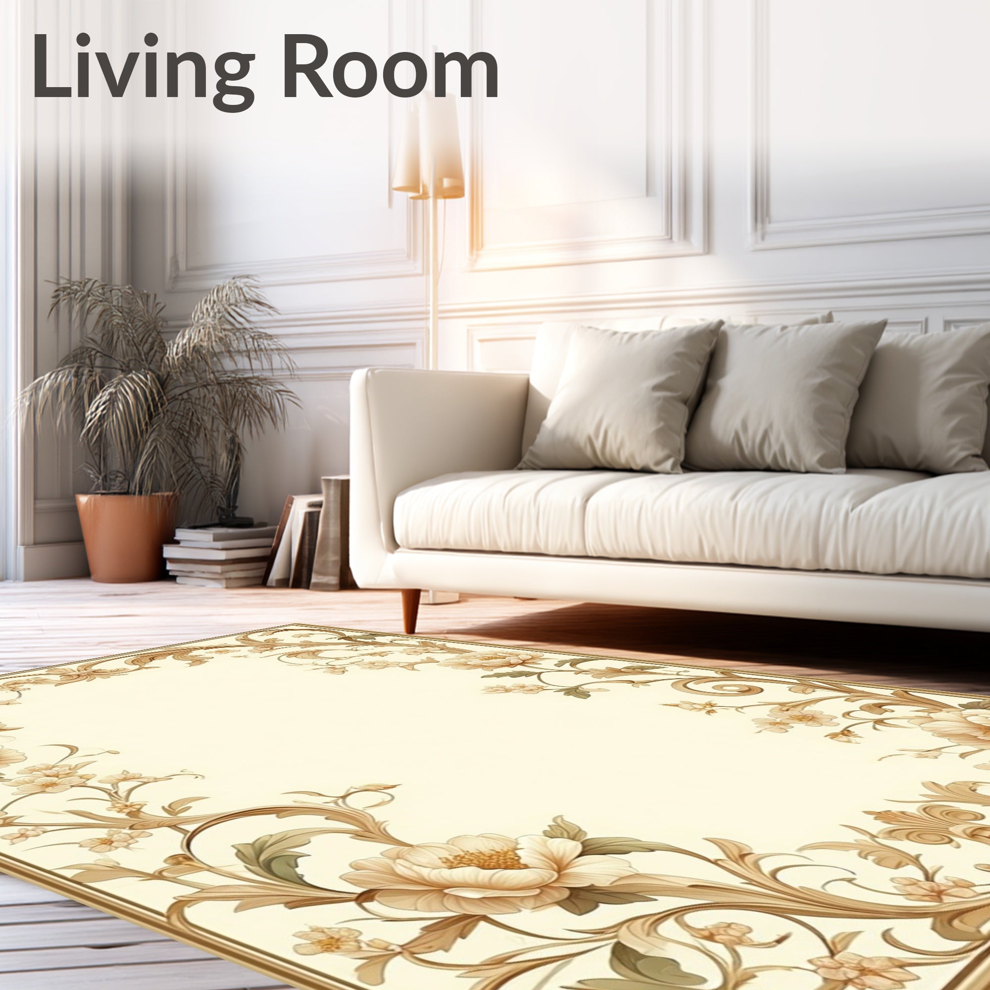 Flatwoven High Traffic Area Rug, Artisan Inspired Mouse with Vintage Beige Garden Motif and Scroll Border, Non Slip, Stain Resistant, Washable Area Rugs for Living Room, Bedroom (Beige) Overview: