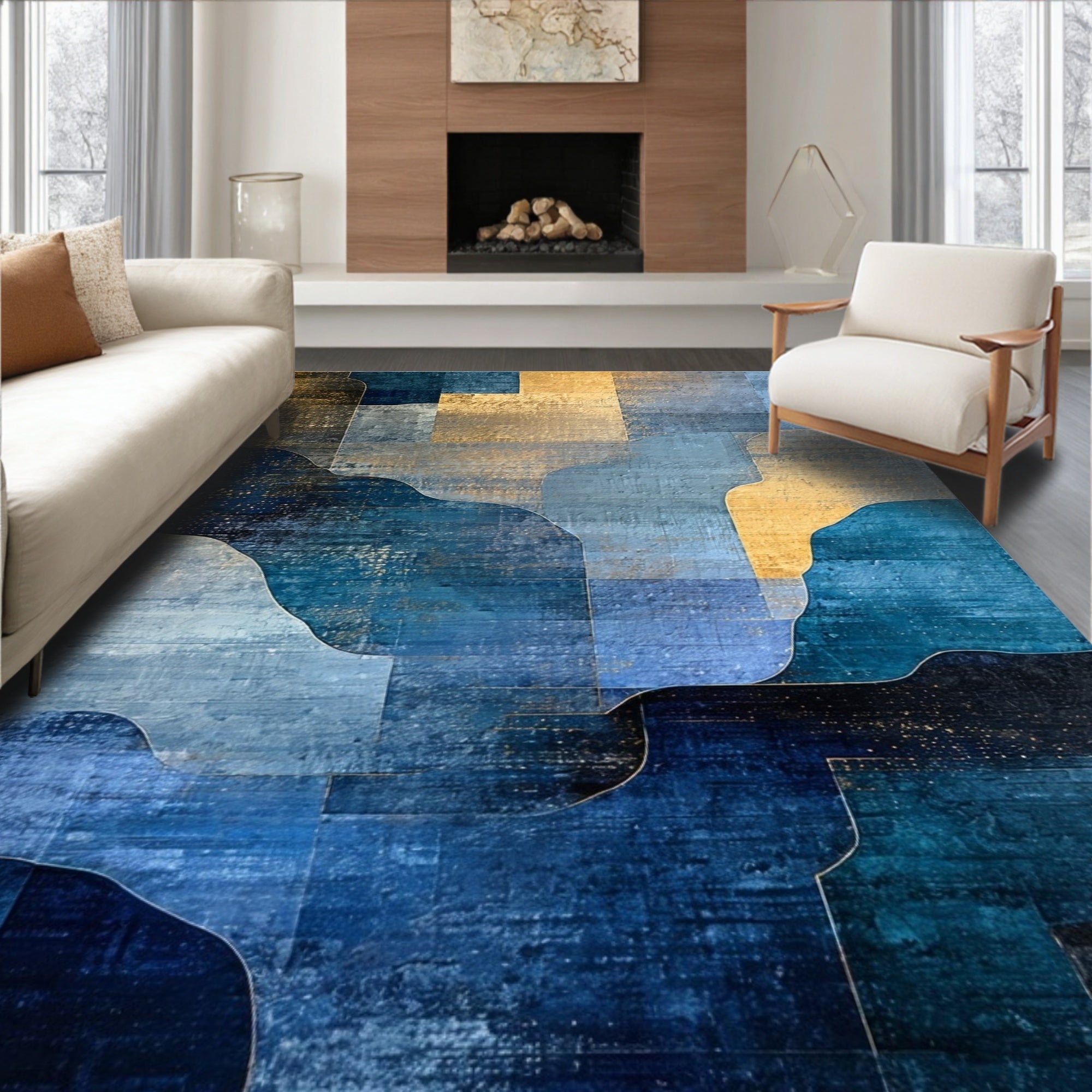 Ultra Soft Area Rug, Non Slip, Stain Resistant, Washable Area Rugs for Living Room, Bedroom, Aurora Flow Rug with Abstract Colorfields and Geometric Blue Gold Accents(Blue) Overview: