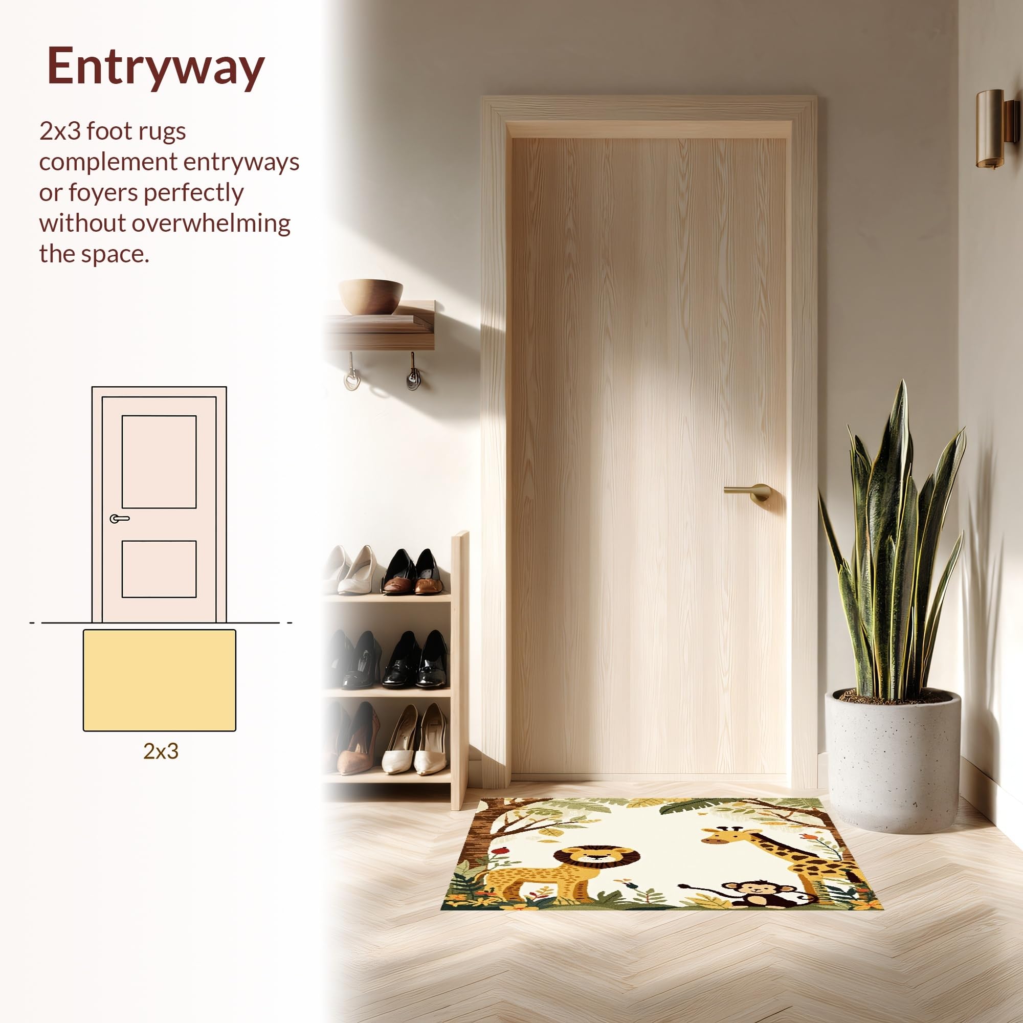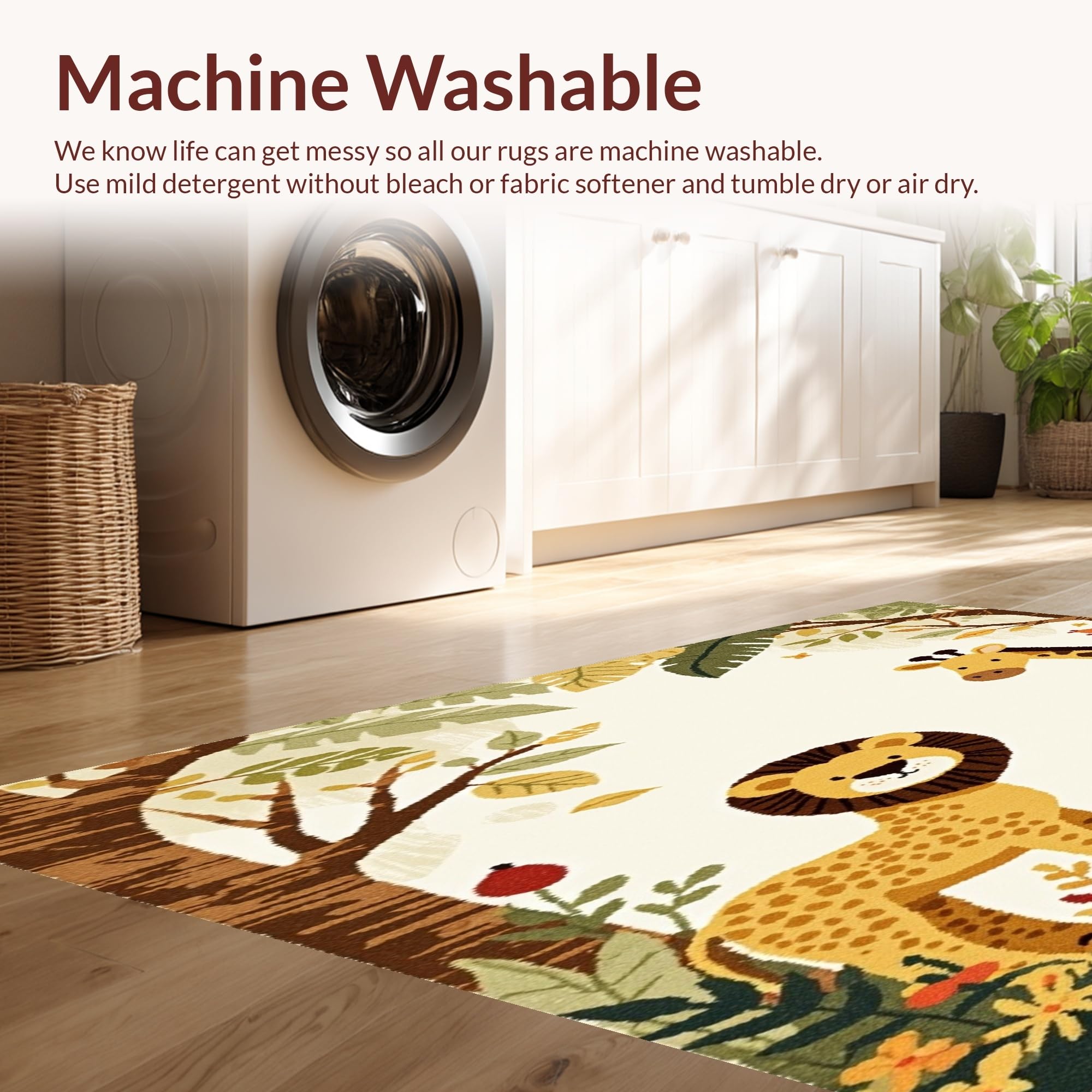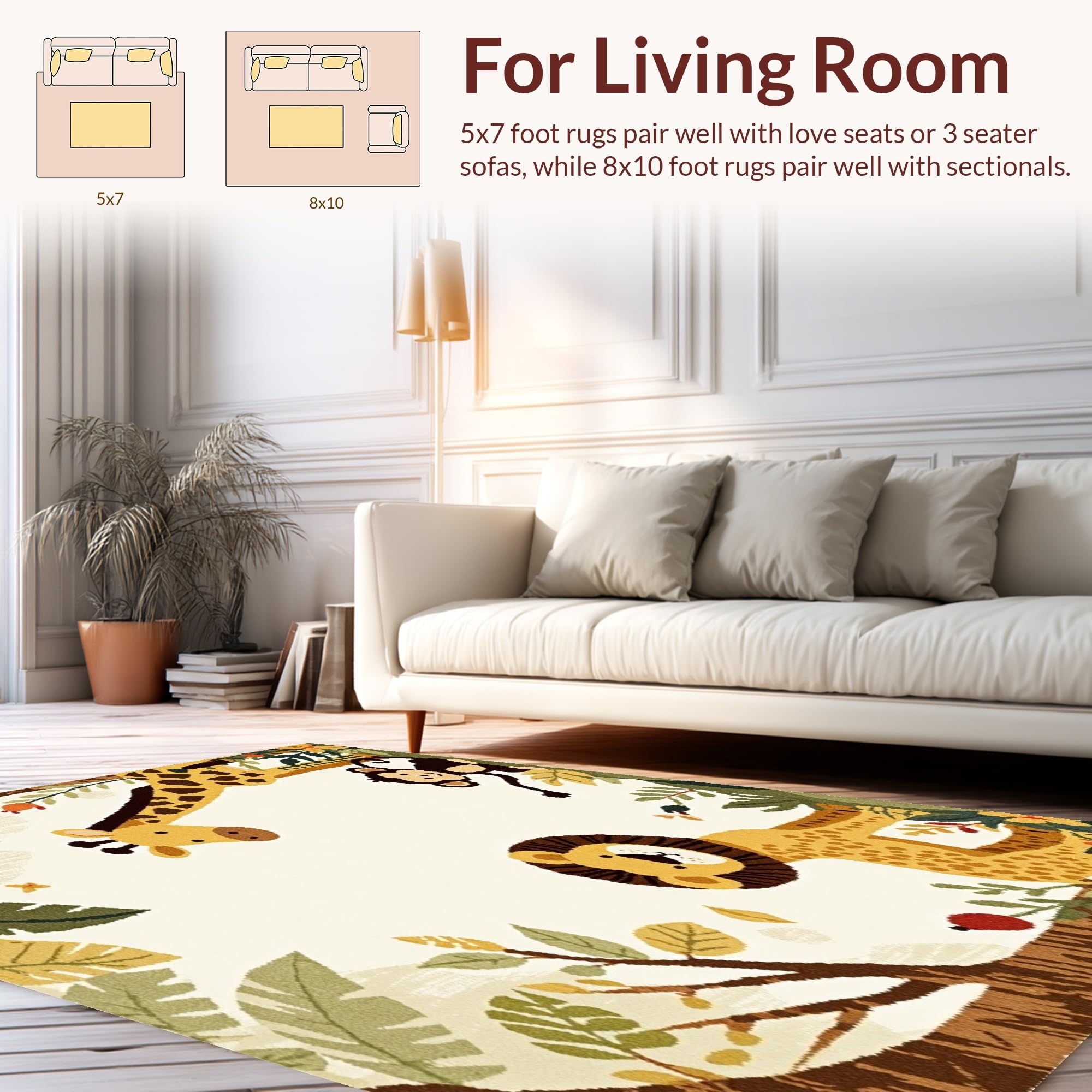 Ultra Soft Area Rug, Non Slip, Stain Resistant, Washable Area Rugs for Living Room, Bedroom, Beige Jungle Explorer Kids Friendly Lion Giraffe Monkey Artistic(Beige) Overview: