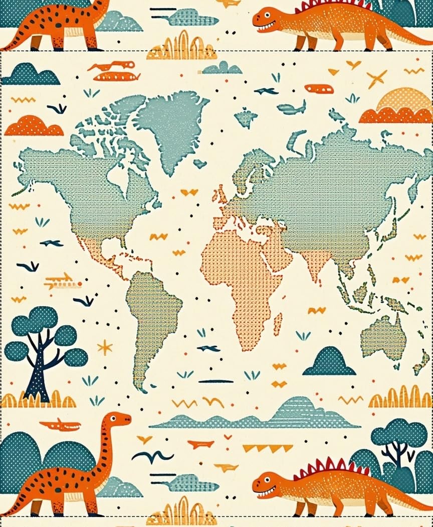 Beige with Cartoon Dinosaurs and Vintage Style World Map(Beige)