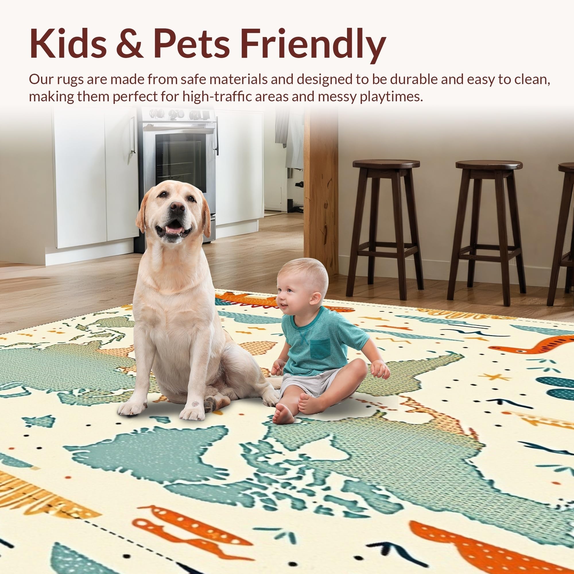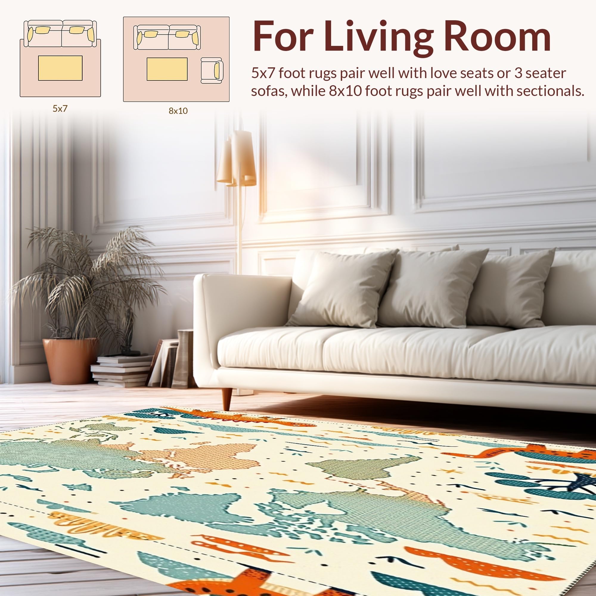 Ultra Soft Area Rug, Non Slip, Stain Resistant, Washable Area Rugs for Living Room, Bedroom, Beige with Cartoon Dinosaurs and Vintage Style World Map(Beige) Overview: