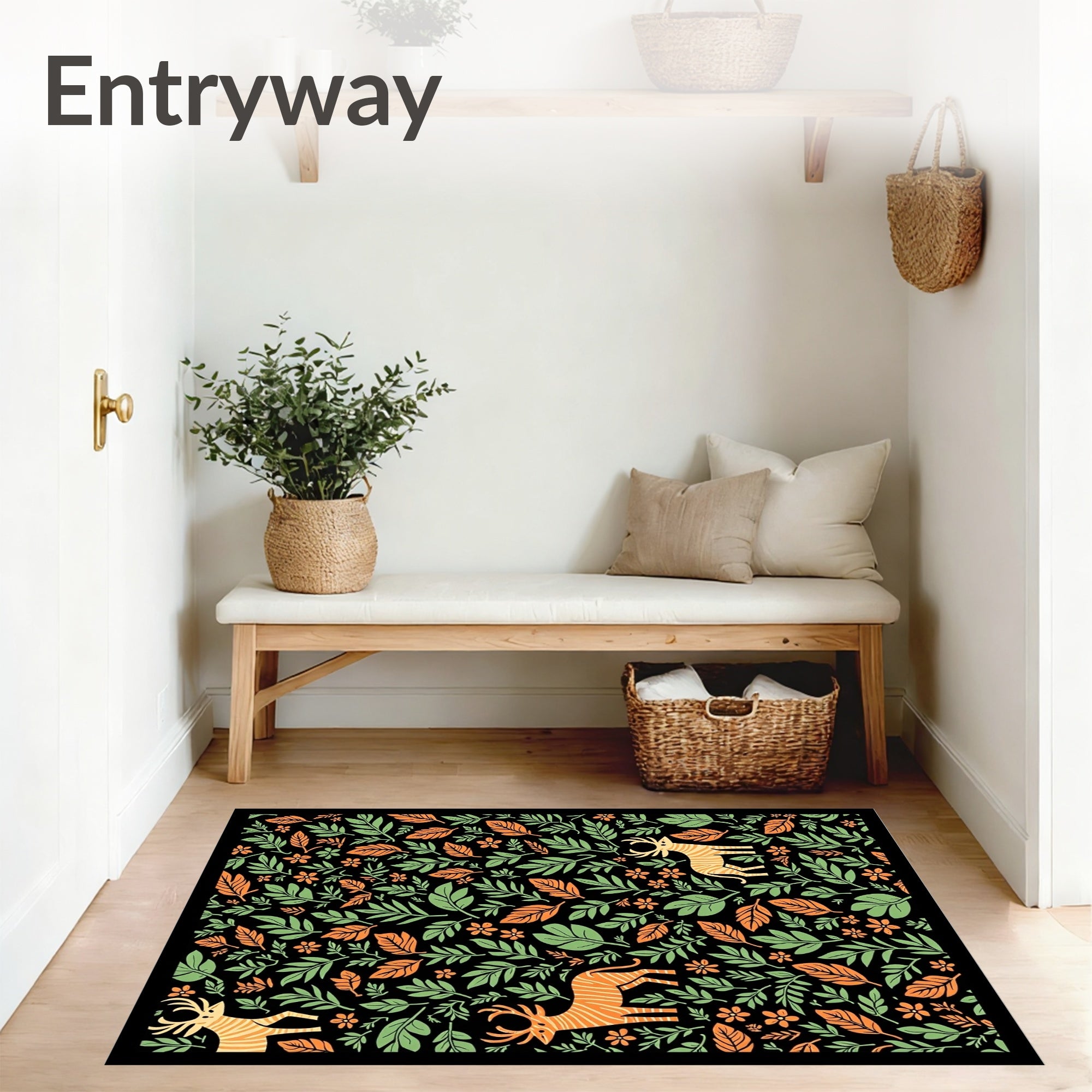 Ultra Soft Area Rug, Non Slip, Stain Resistant, Washable Area Rugs for Living Room, Bedroom, Boho Jungle Adventure with Whimsical Fauna and Falling Leaves(Black) Overview: