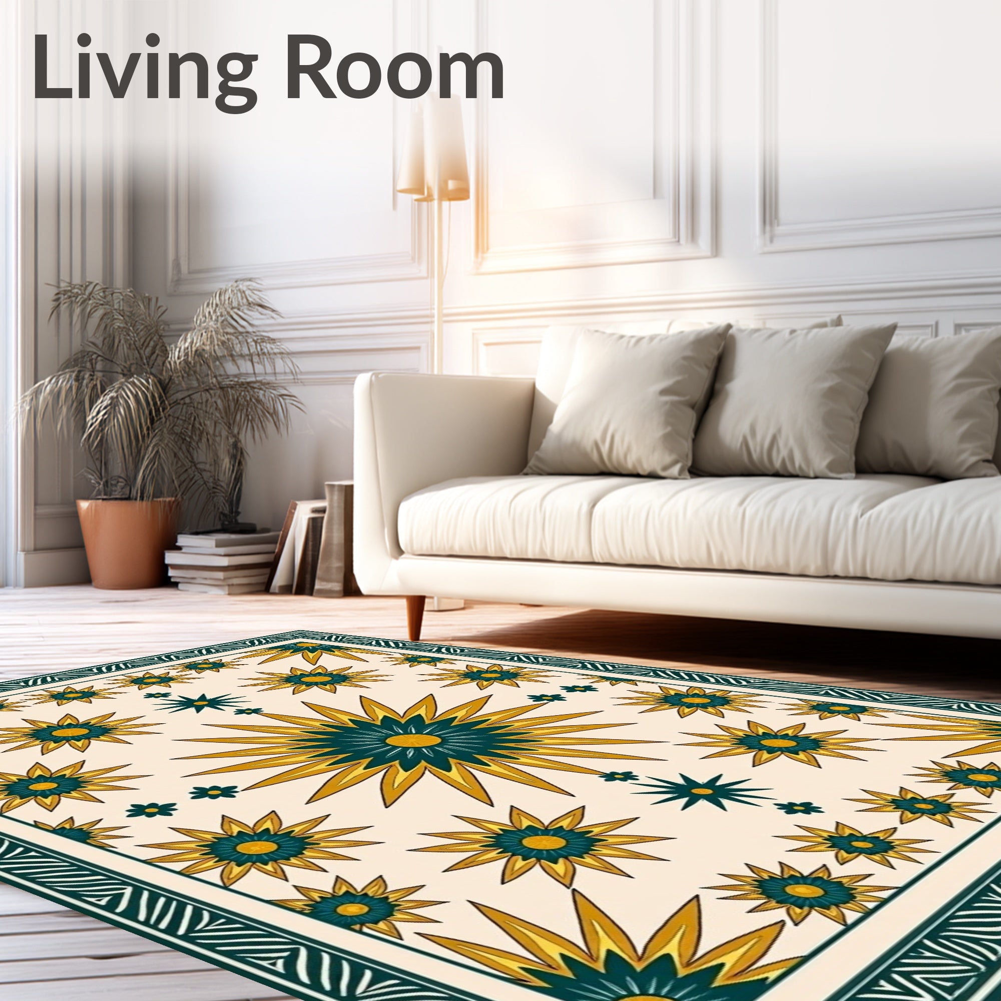 Ultra Soft Area Rug, Non Slip, Stain Resistant, Washable Area Rugs for Living Room, Bedroom, Boho Sunburst Mosaic with Ornate Floral Medallions(Beige) Overview:
