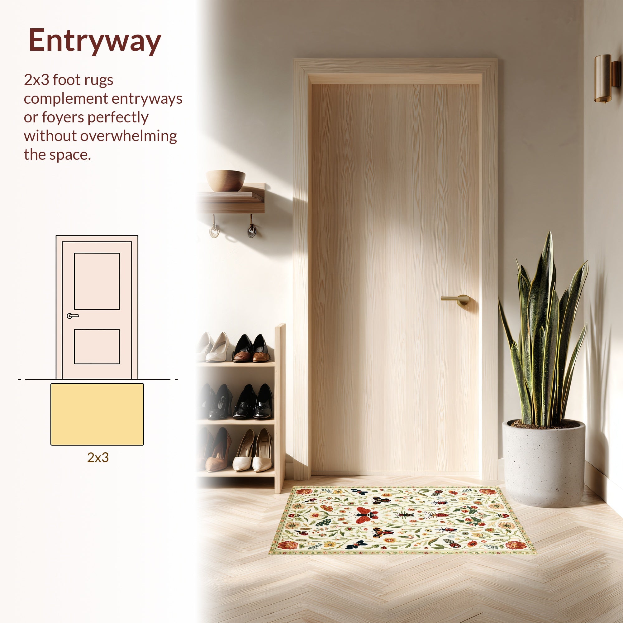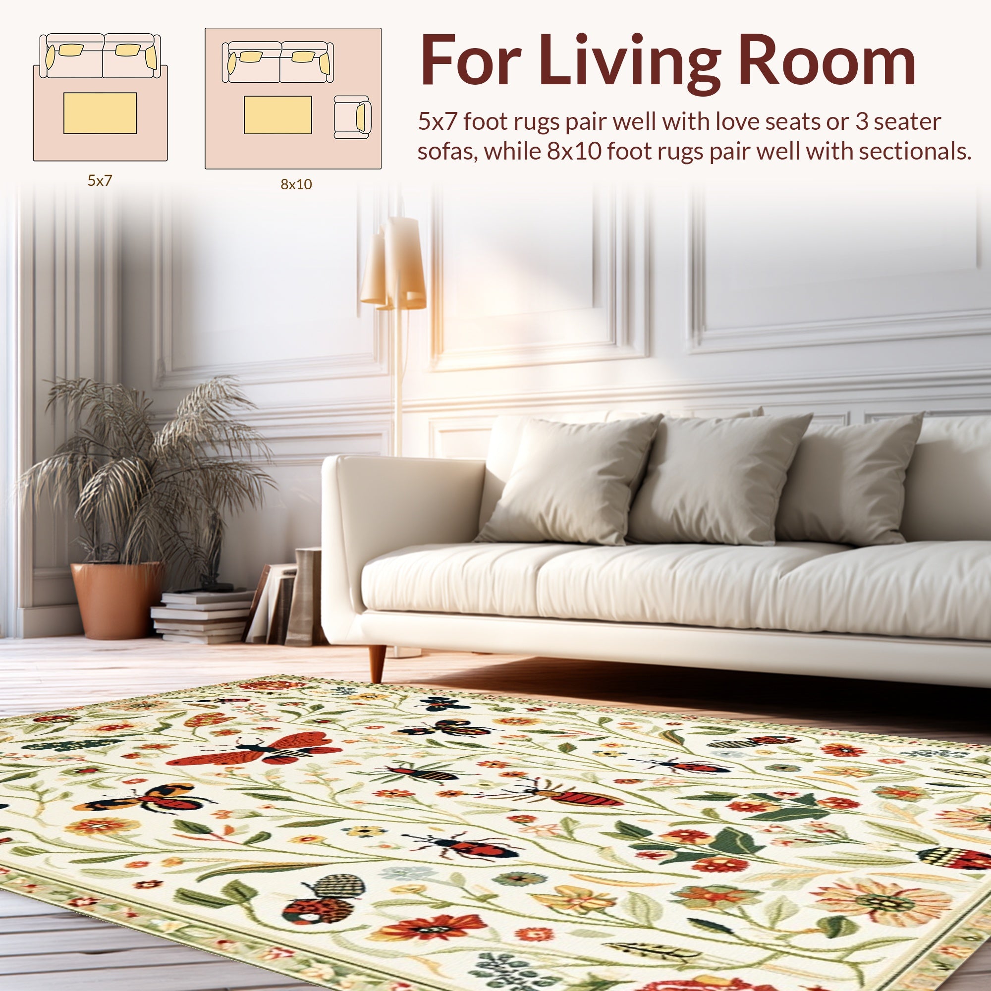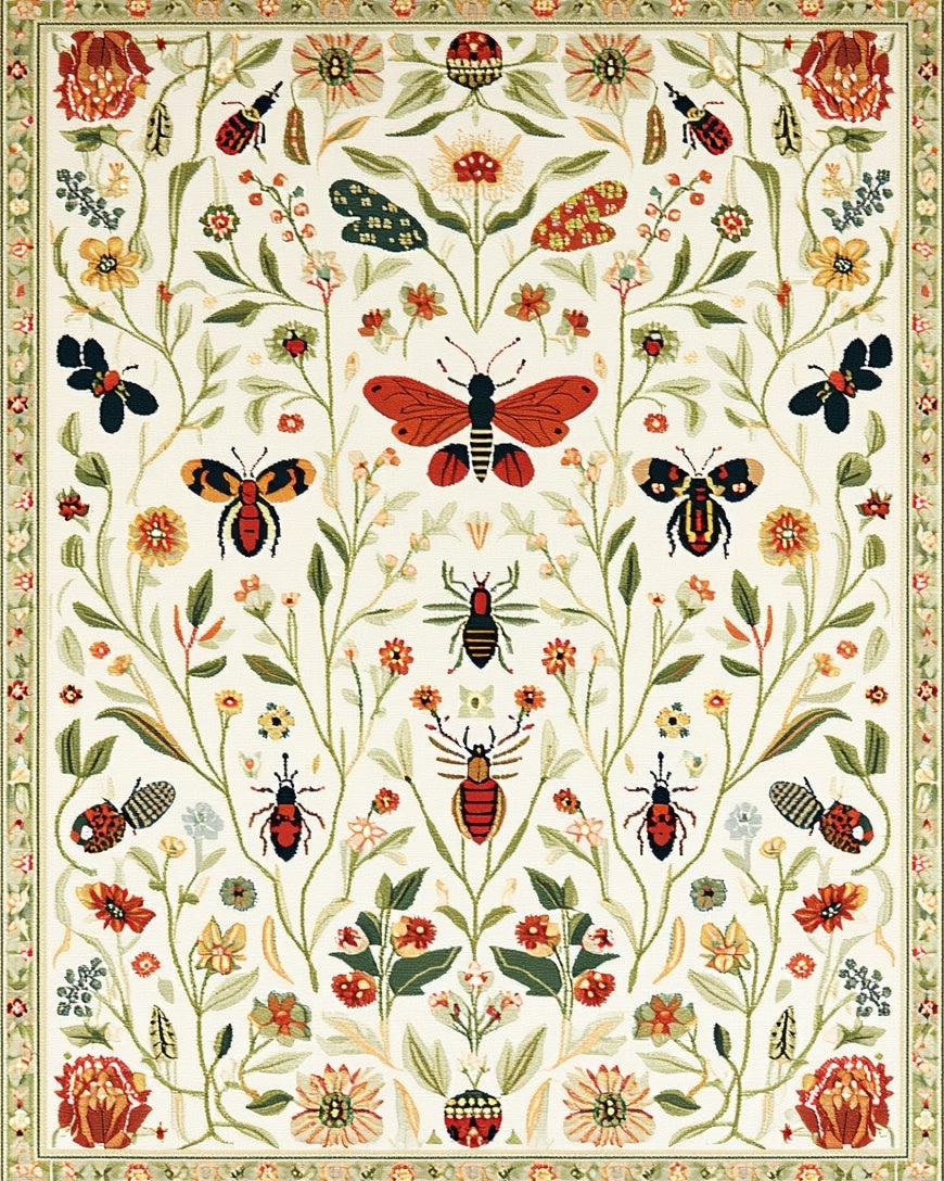 Flatwoven High Traffic Area Rug, Botanical Bug with Floral Insect Illustrations, Non Slip, Stain Resistant, Washable Area Rugs for Living Room, Bedroom (Ivory) Overview: