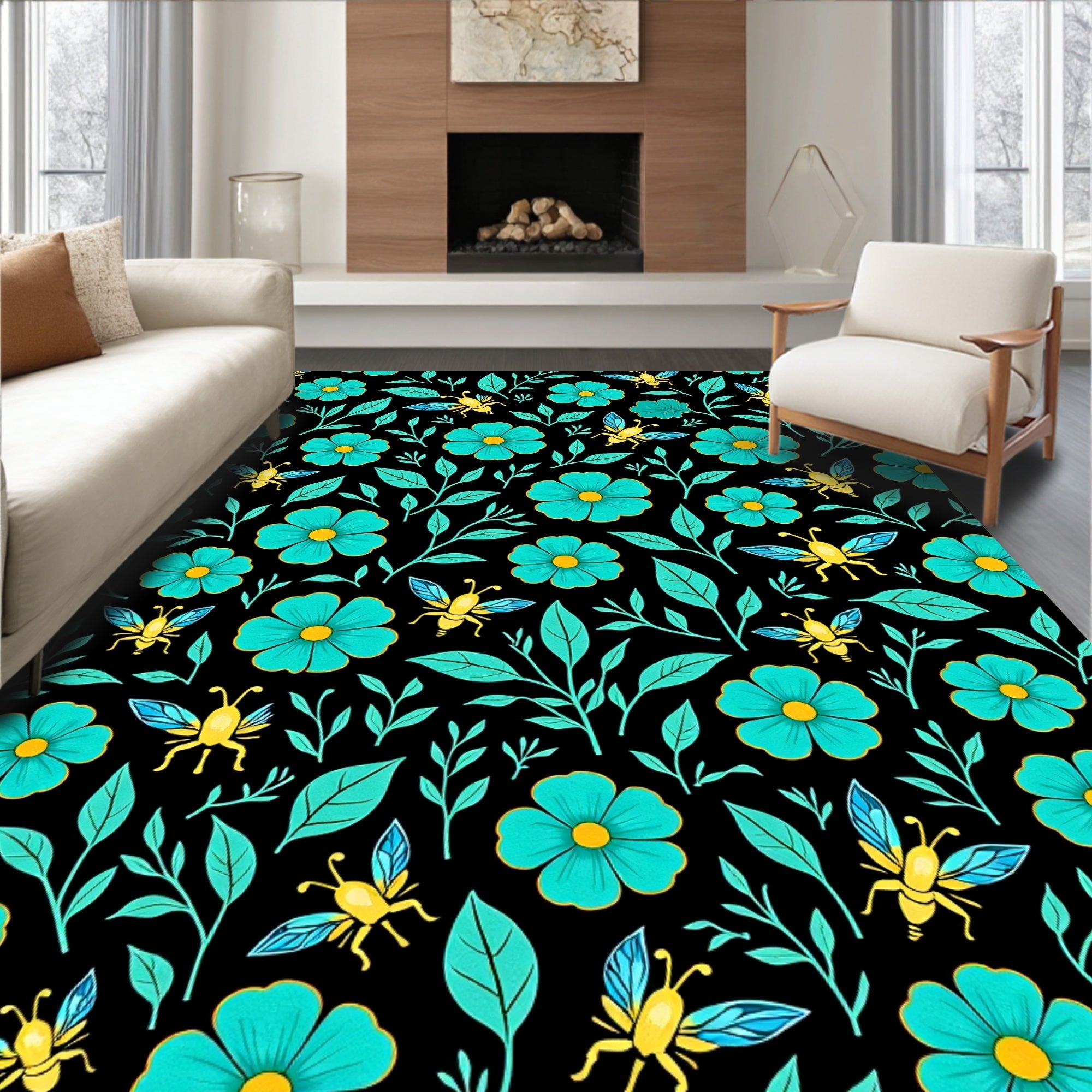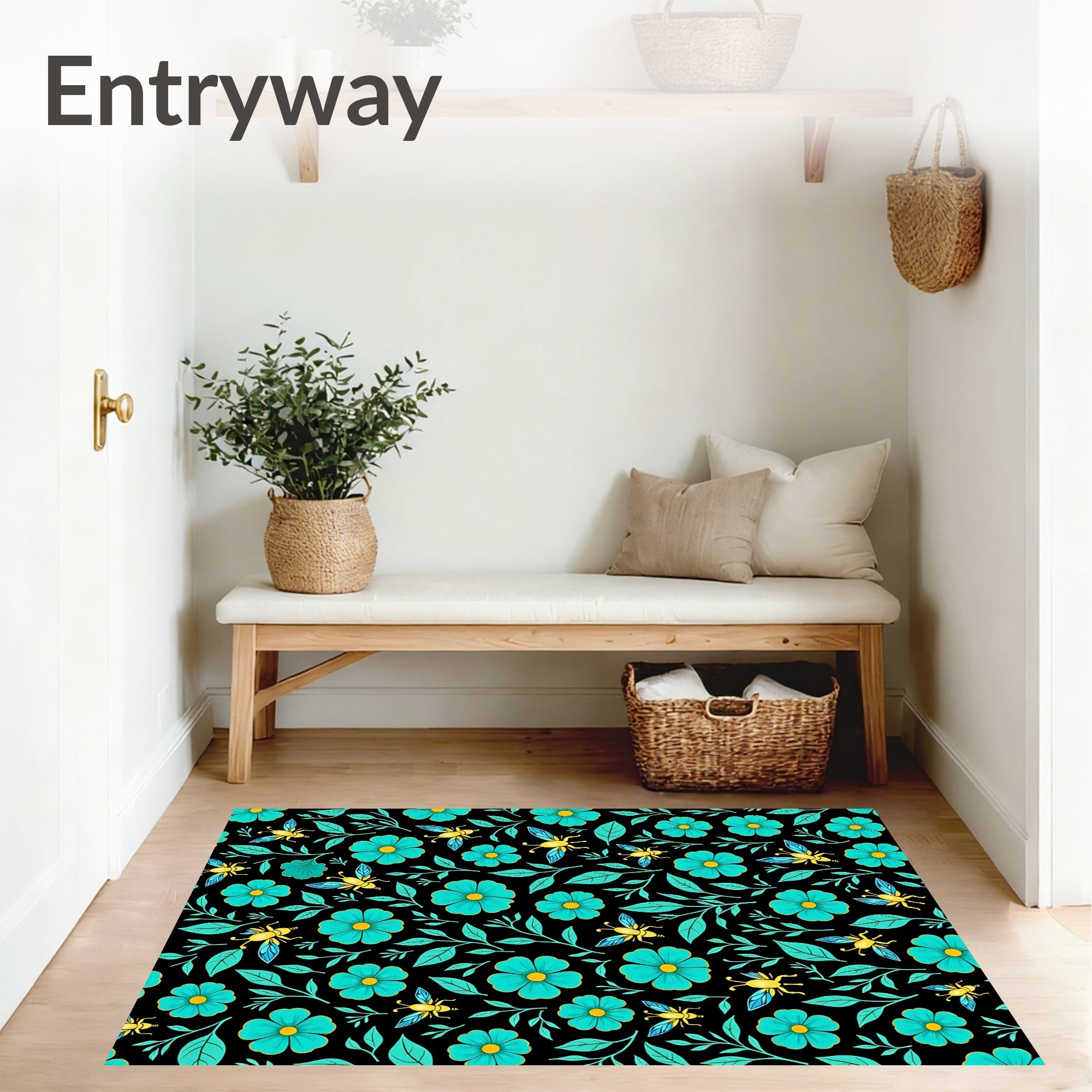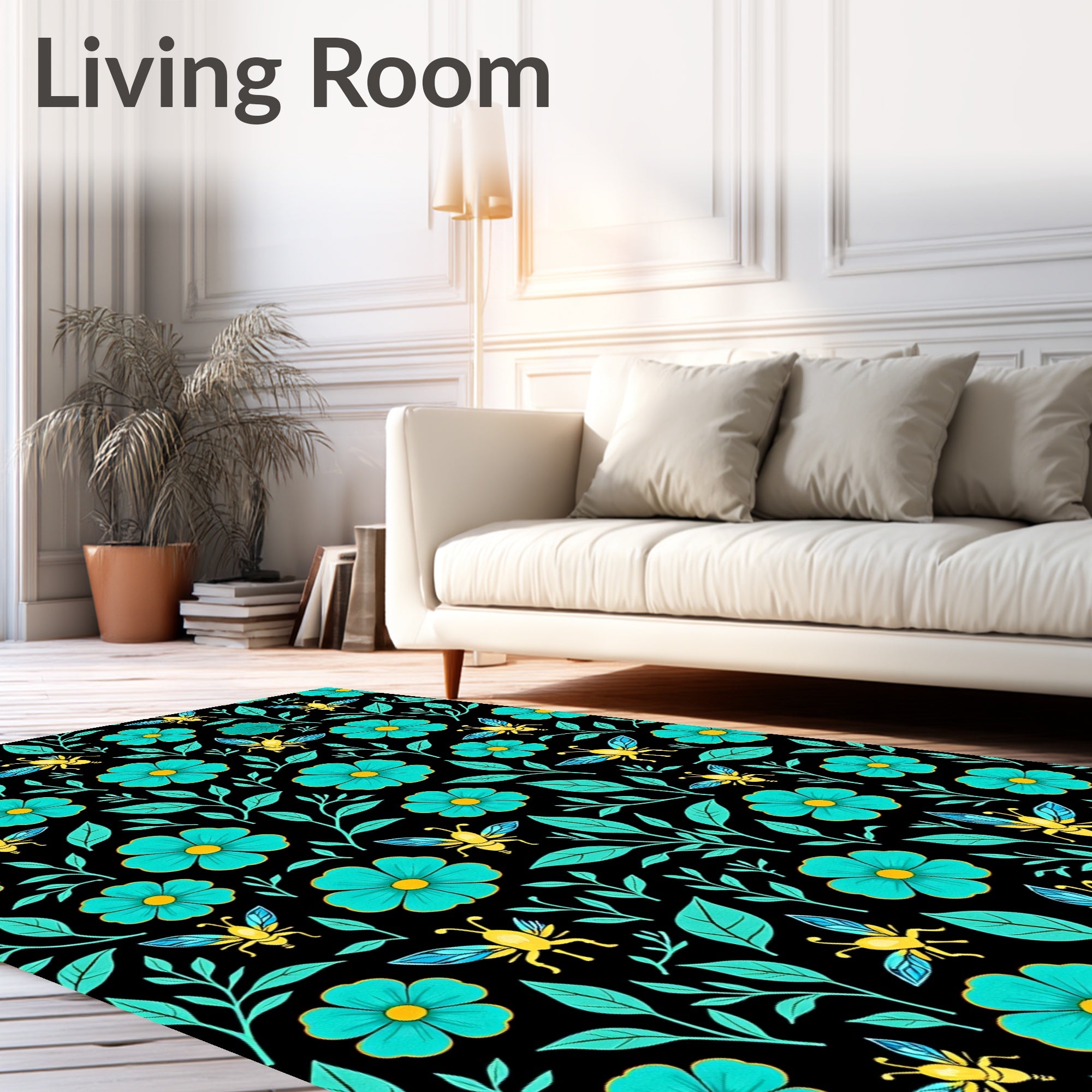 Flatwoven High Traffic Area Rug, Botanical Enchanted Meadow Insect Floral Decorative, Non Slip, Stain Resistant, Washable Area Rugs for Living Room, Bedroom (Black) Overview: