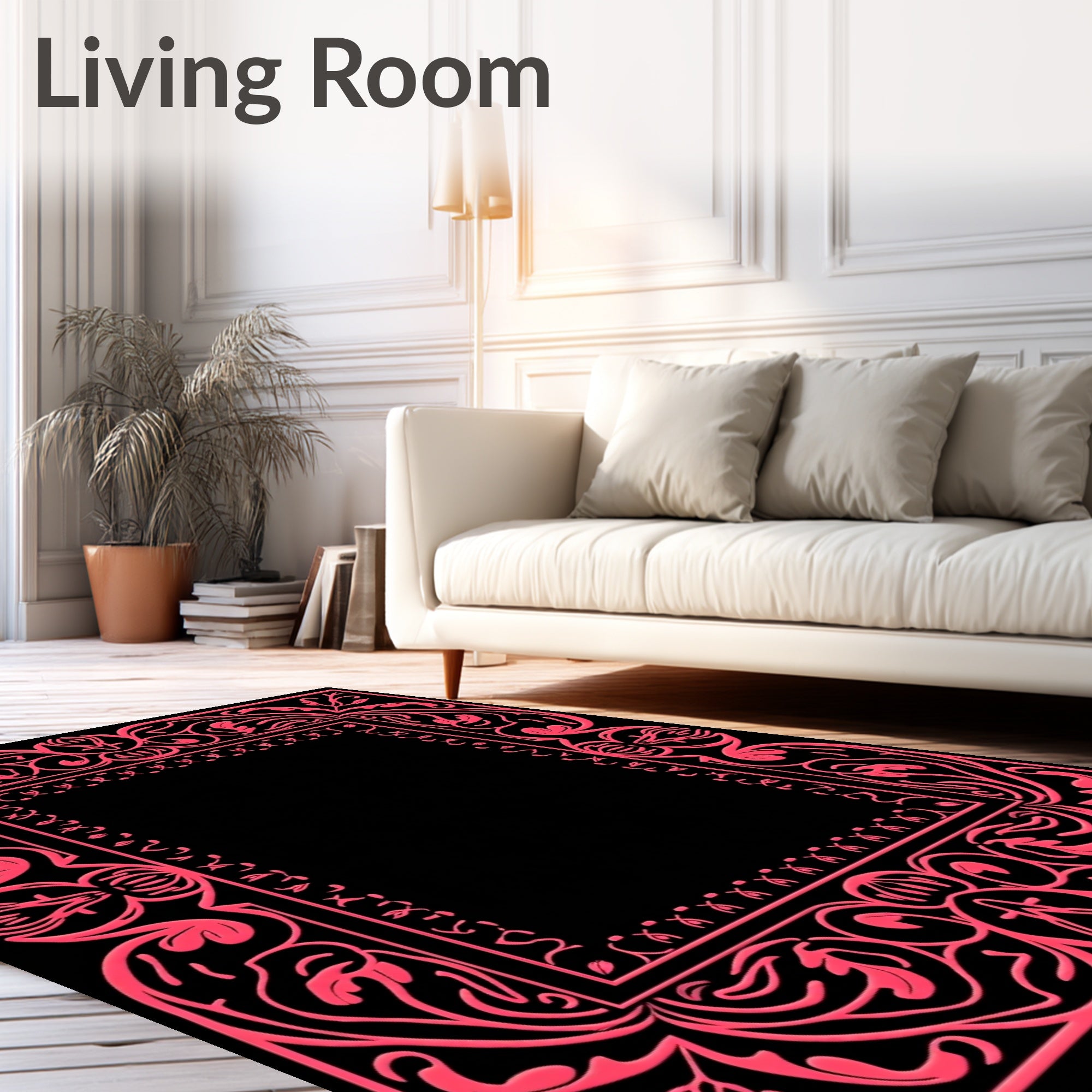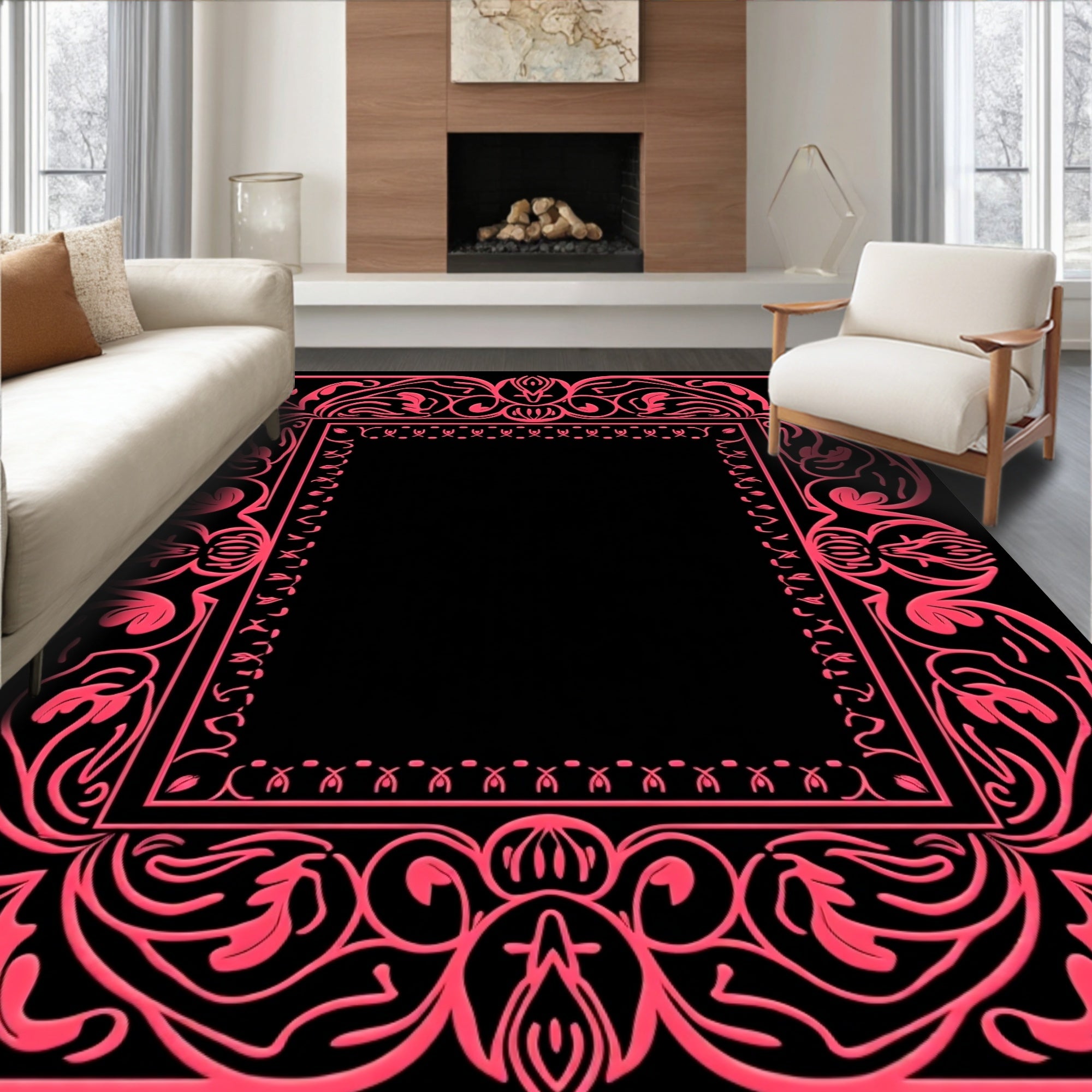 Ultra Soft Area Rug, Non Slip, Stain Resistant, Washable Area Rugs for Living Room, Bedroom, Botanical Vine Tapestry with Petal Embellishments and Interlocking Filigree(Black) Overview: