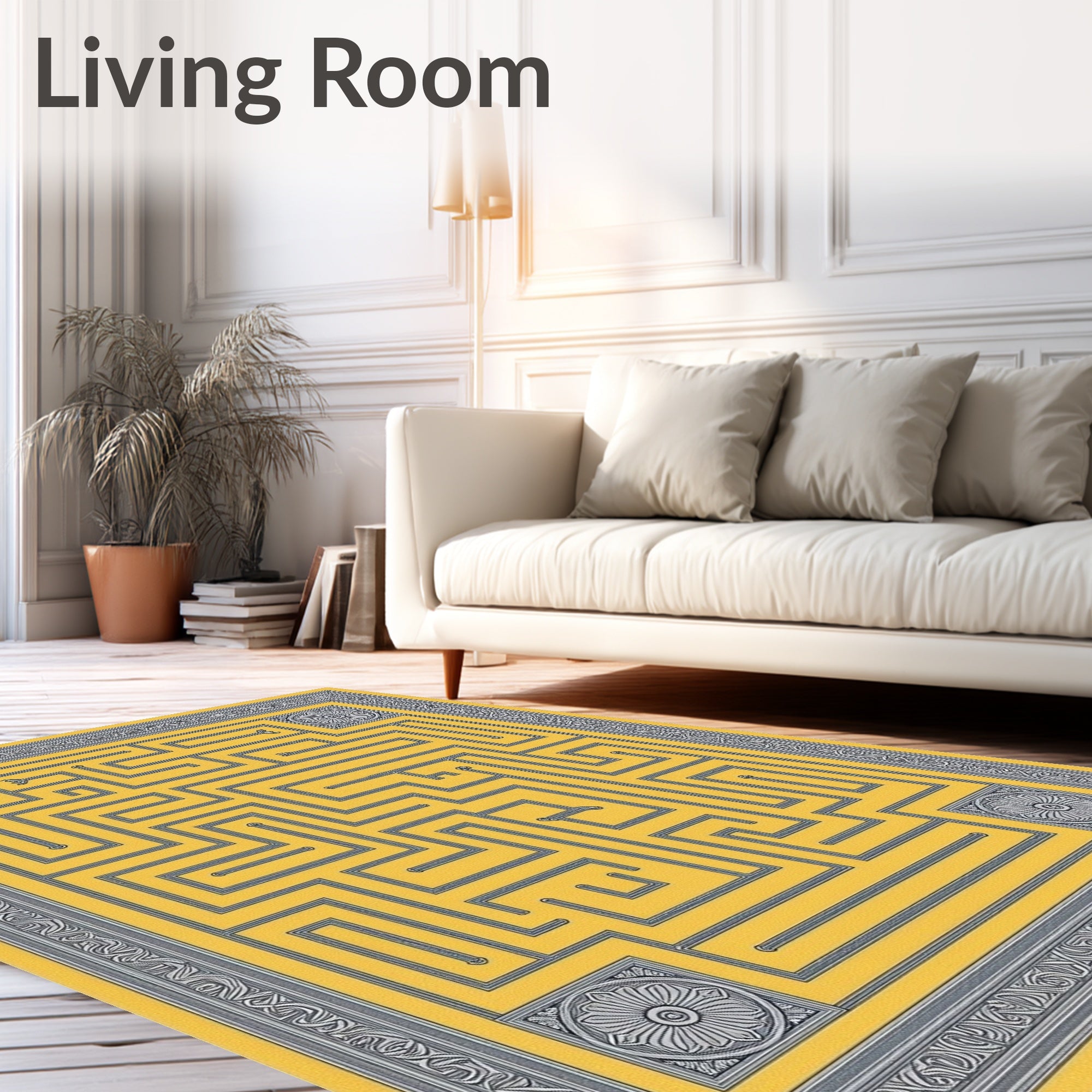 Ultra Soft Area Rug, Non Slip, Stain Resistant, Washable Area Rugs for Living Room, Bedroom, Byzantine Labyrinth Ornate Embellished(Yellow) Overview: