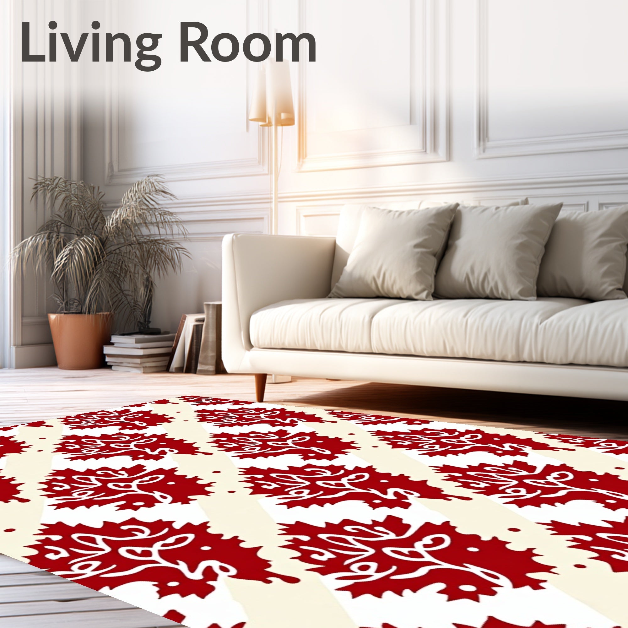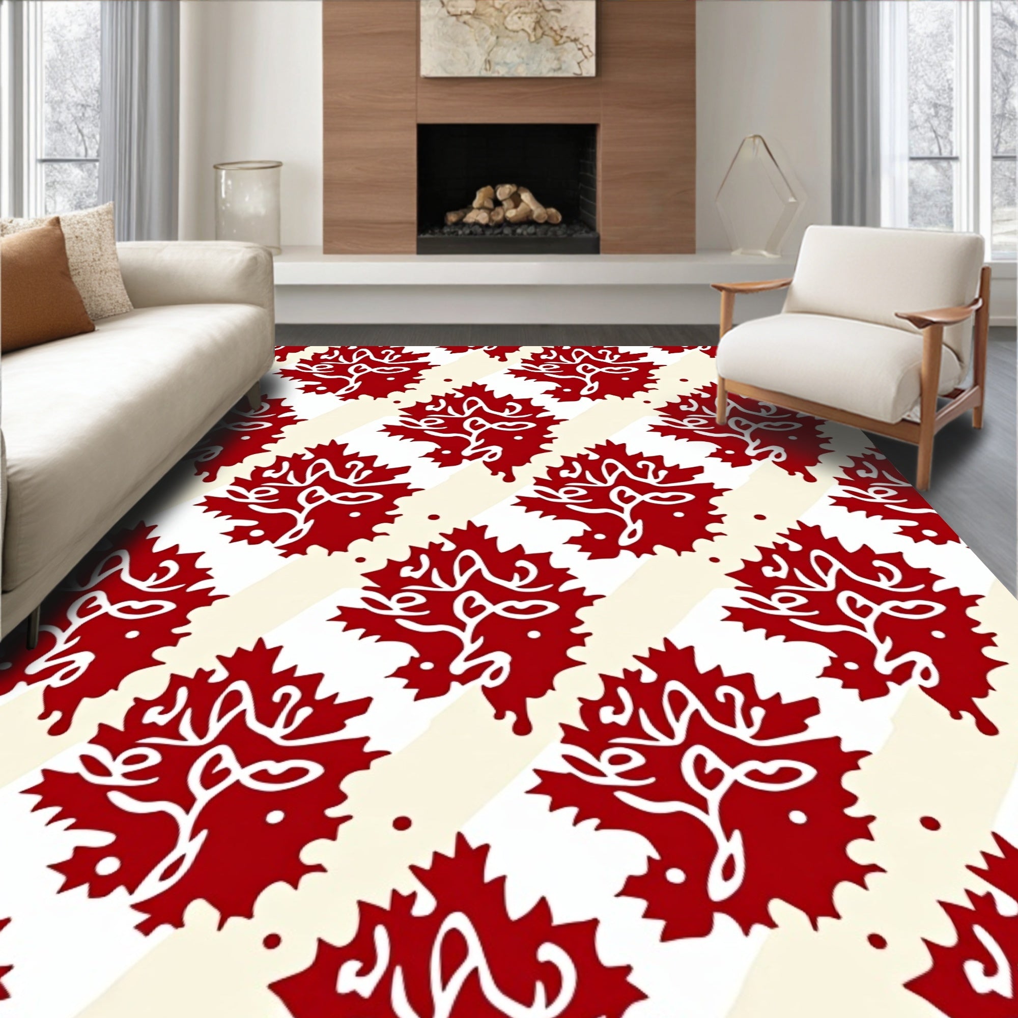 Ultra Soft Area Rug, Non Slip, Stain Resistant, Washable Area Rugs for Living Room, Bedroom, Cane Swirl with Holly Leaf Motif and Festive Berry(Red) Overview:
