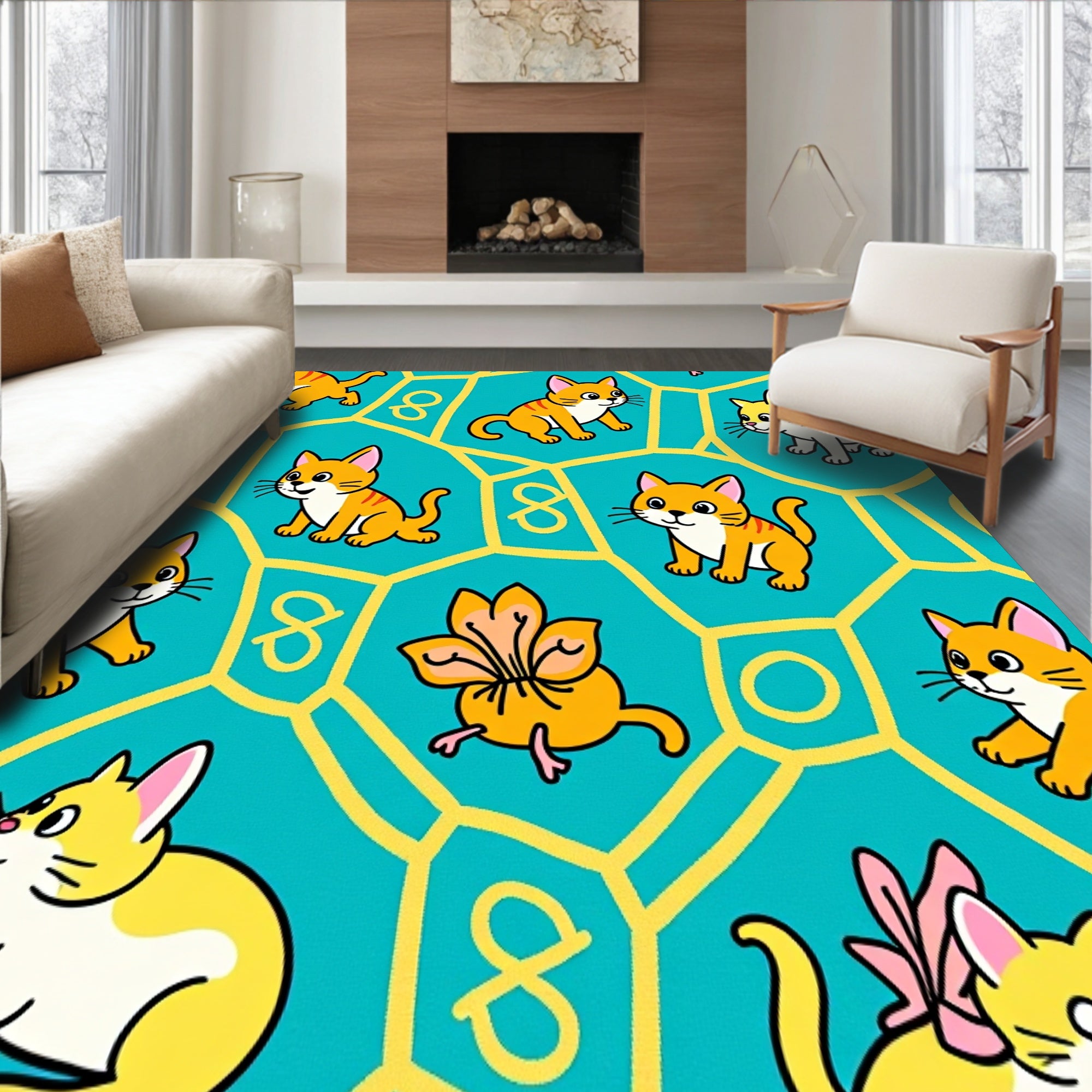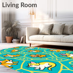 Ultra Soft Area Rug, Non Slip, Stain Resistant, Washable Area Rugs for Living Room, Bedroom, Cartoon Animal Friends Frolic with Interlocking Fishbone Motifs(Teal) Overview: