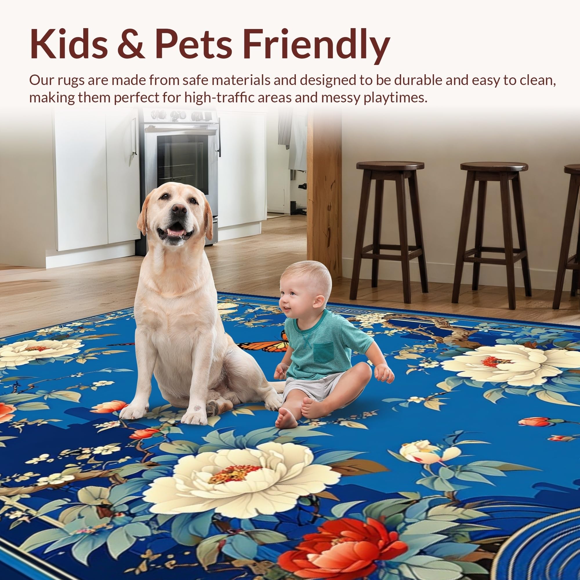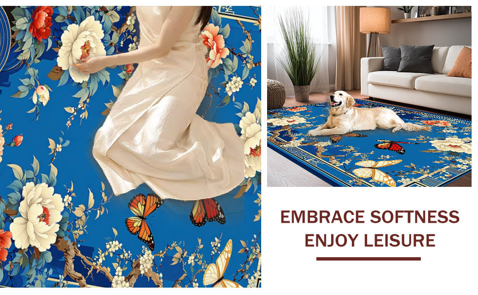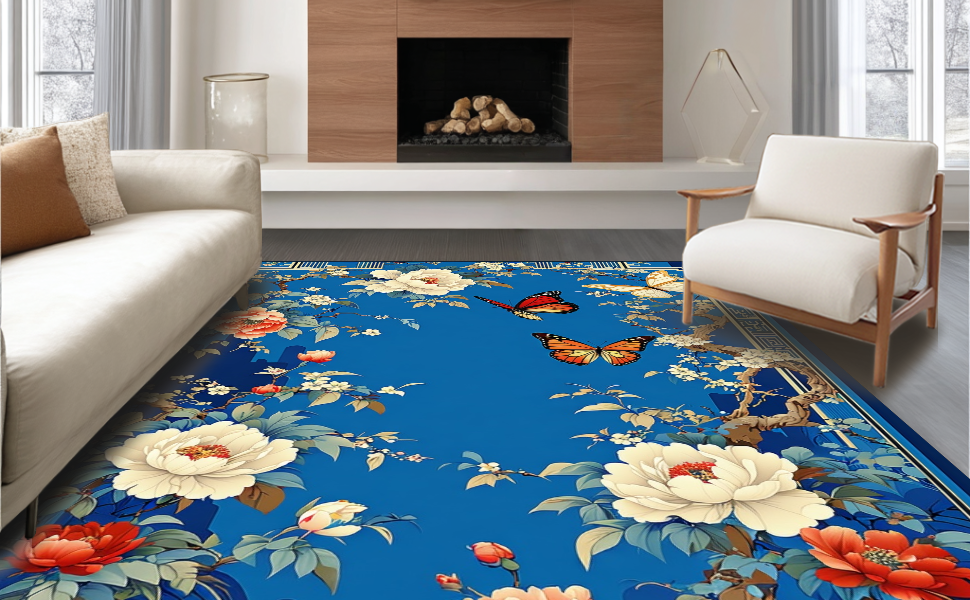 Ultra Soft Area Rug, Non Slip, Stain Resistant, Washable Area Rugs for Living Room, Bedroom, Charming Butterfly and Blossom Theme(Blue) Overview: