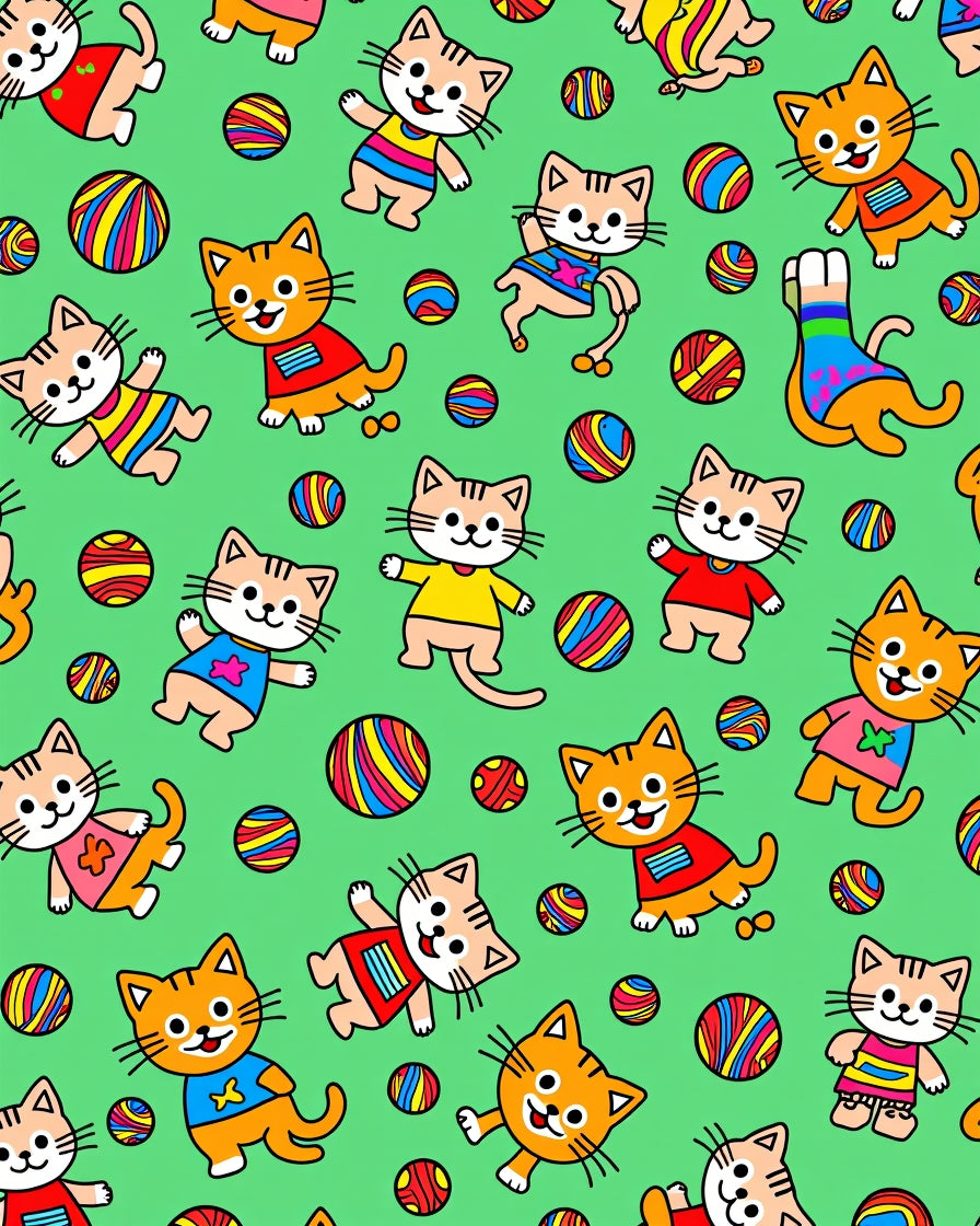 Charming Kitty Parade Motif Artwork With Yarn Accents(Green)