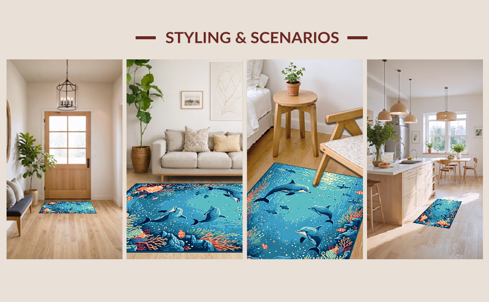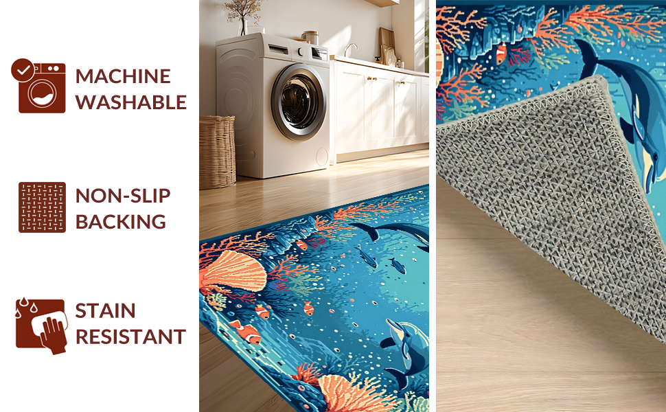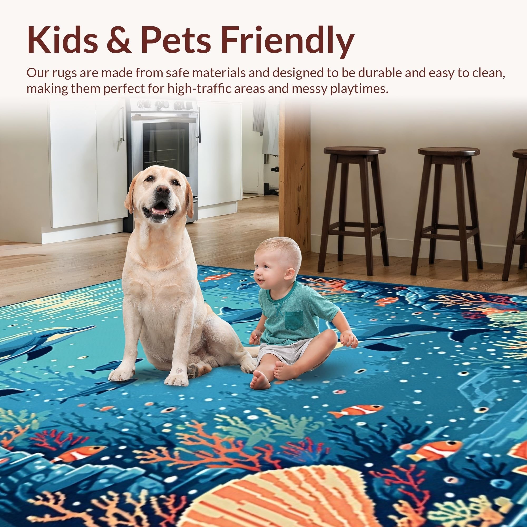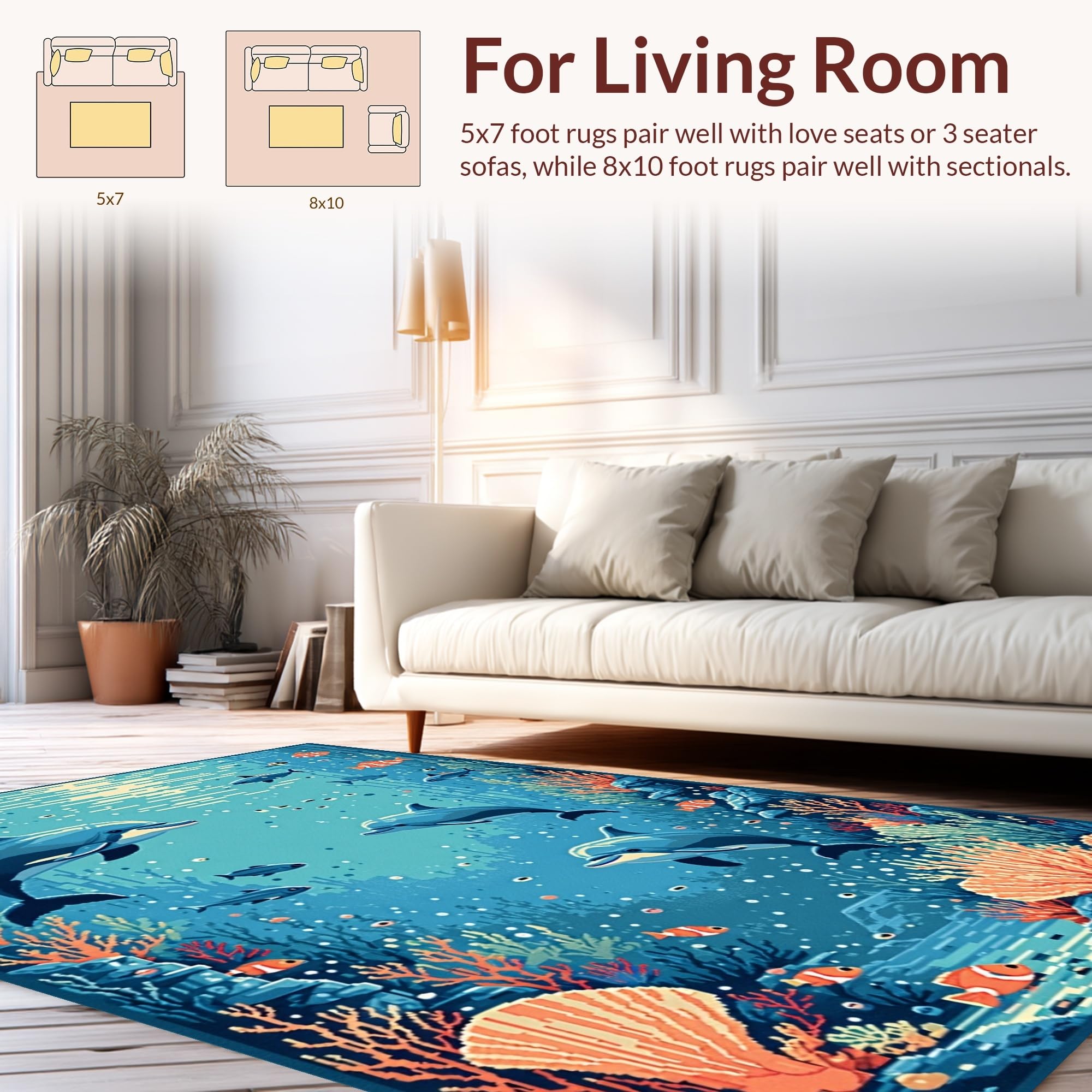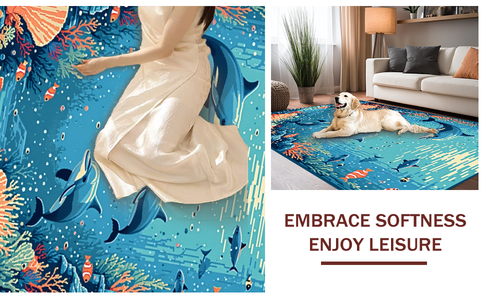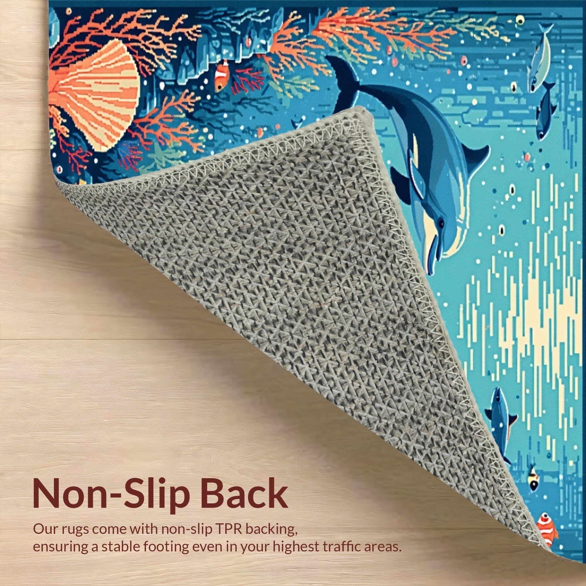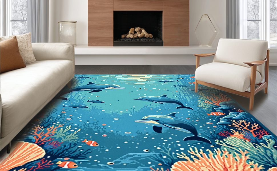 Ultra Soft Area Rug, Non Slip, Stain Resistant, Washable Area Rugs for Living Room, Bedroom, Charming Whimsical Dolphin Theme(Blue) Overview: