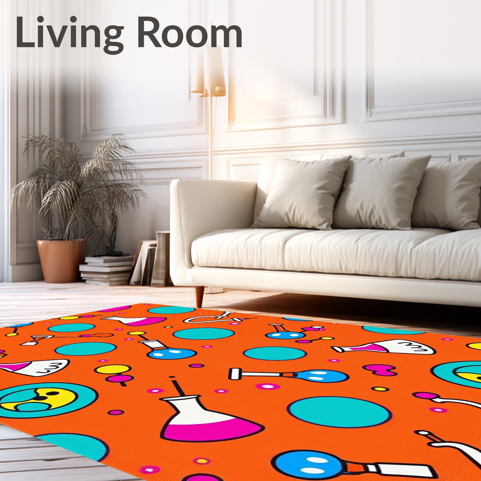 Ultra Soft Area Rug, Non Slip, Stain Resistant, Washable Area Rugs for Living Room, Bedroom, Chemistry Lab Equipment Humor Poster Style Floor Decoration with Beakers(Orange) Overview: