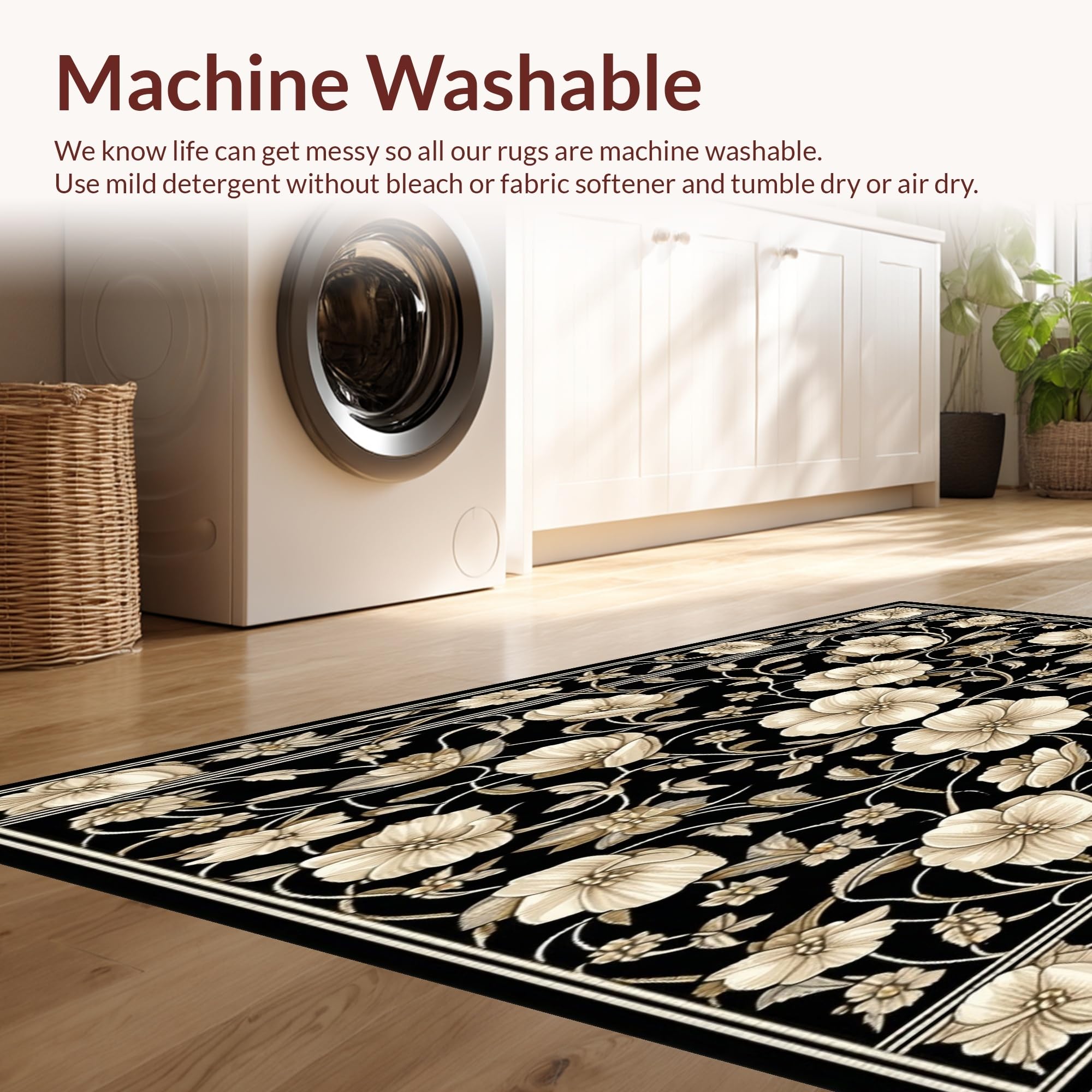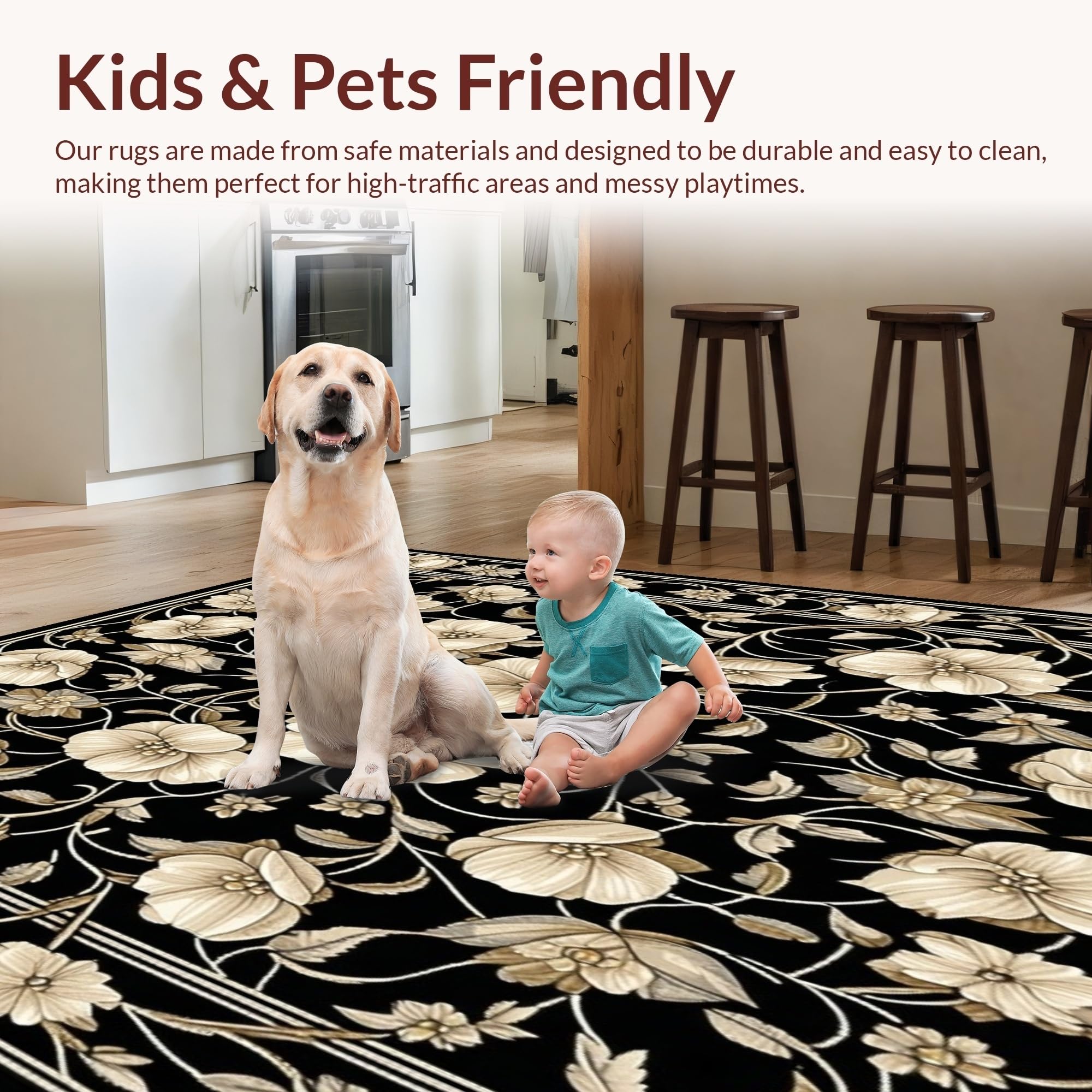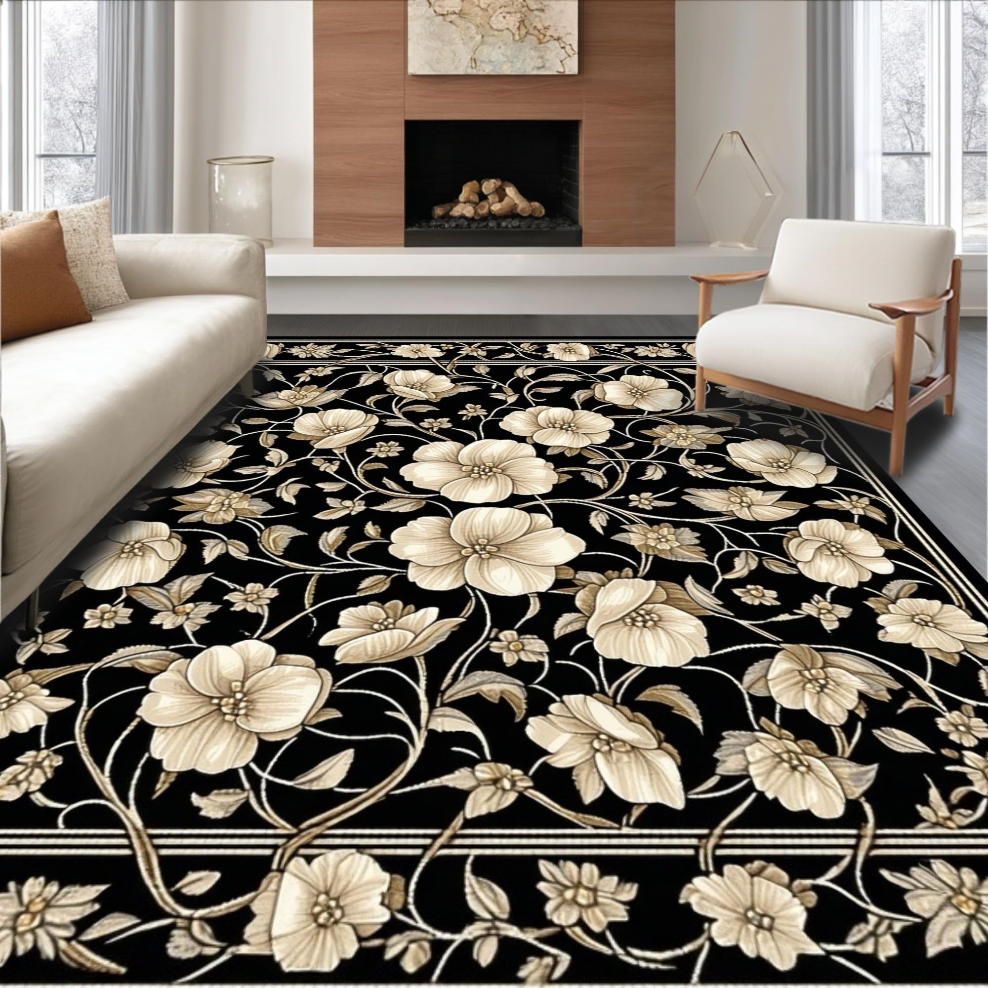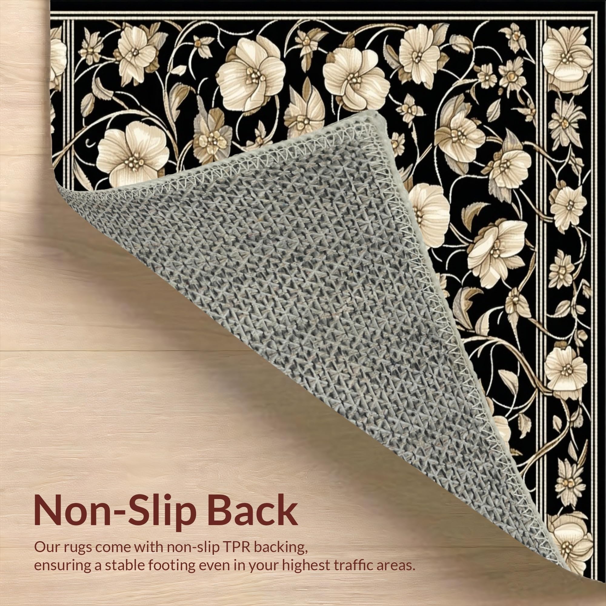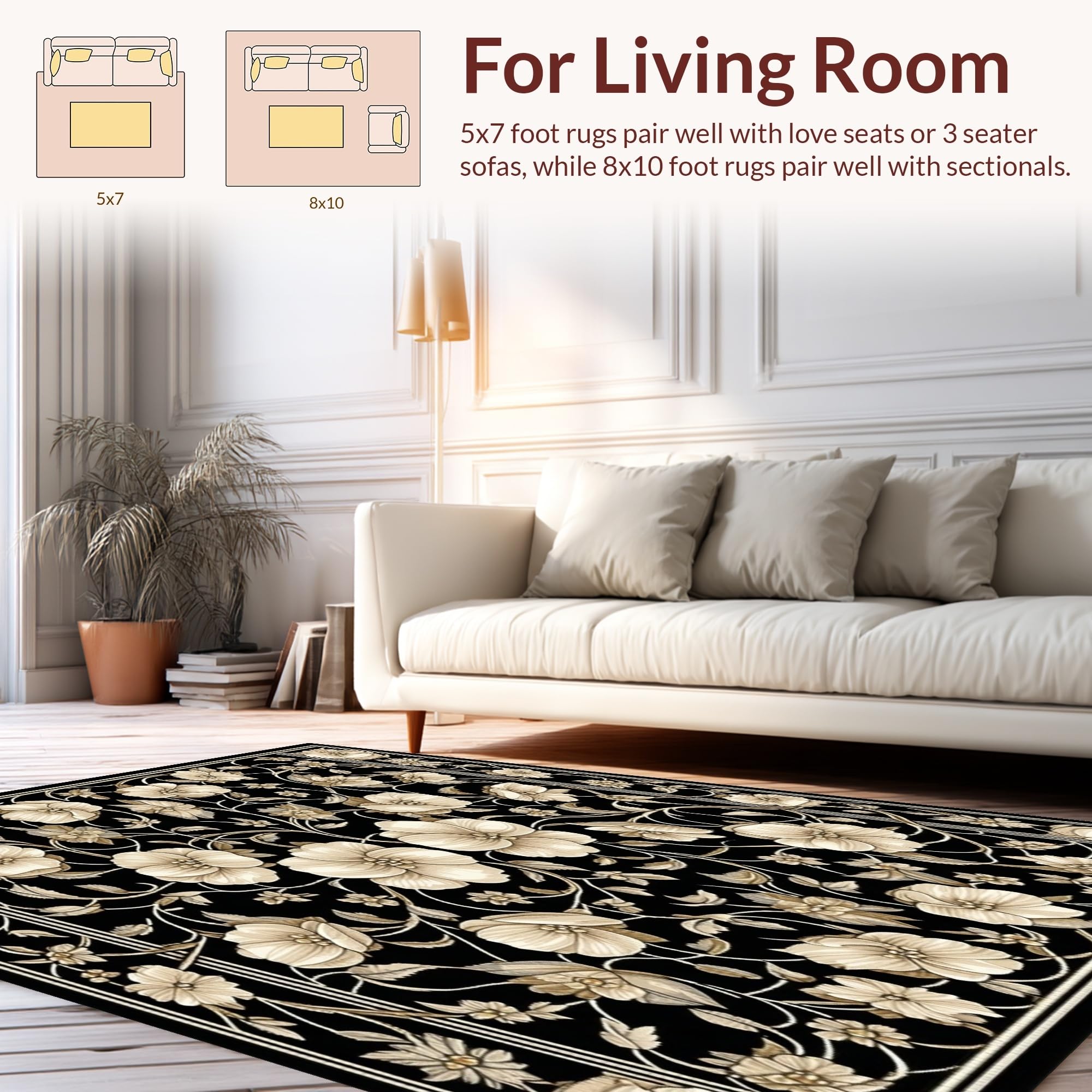 Ultra Soft Area Rug, Non Slip, Stain Resistant, Washable Area Rugs for Living Room, Bedroom, Chic Black and Beige Area with Vintage Floral Accents(Black) Overview: