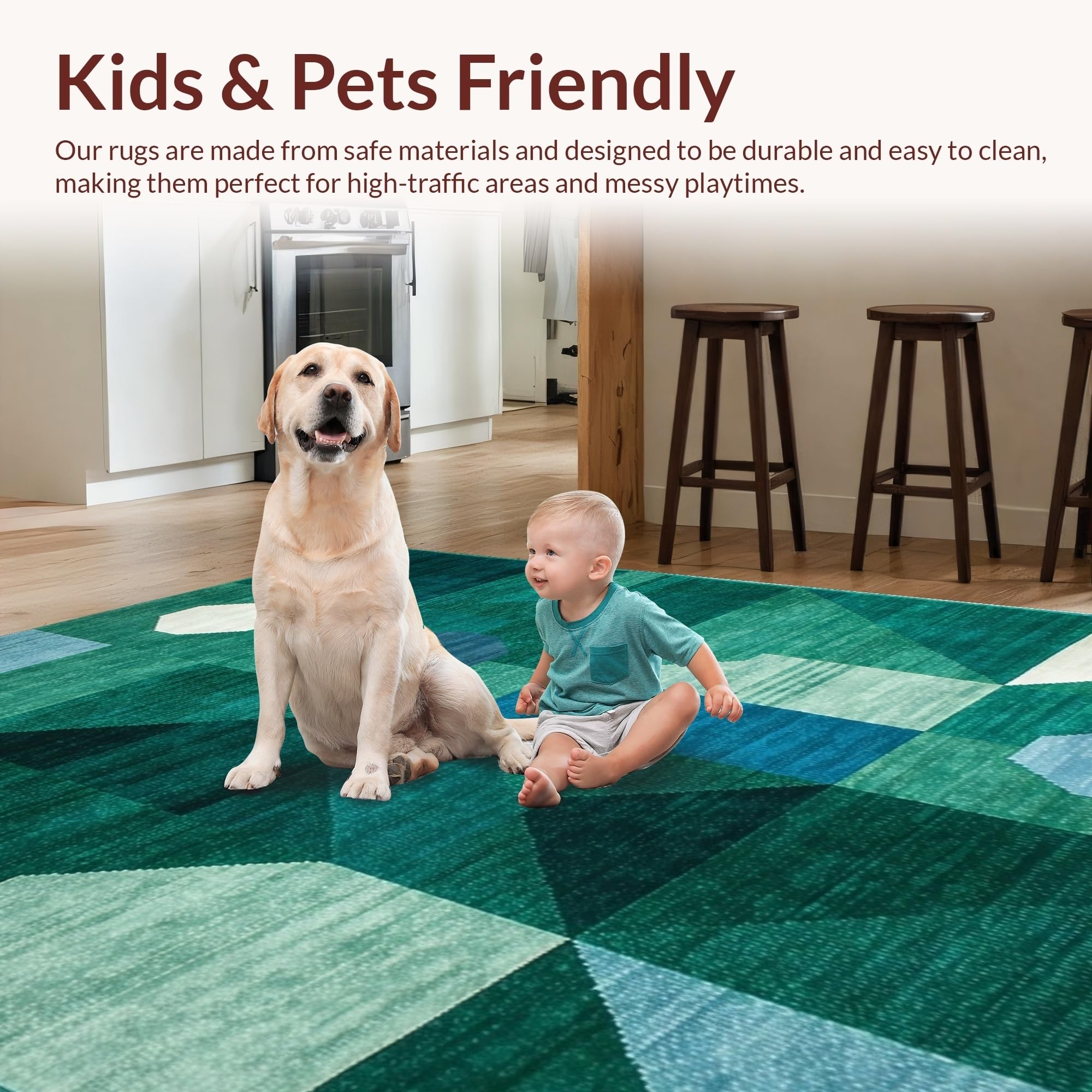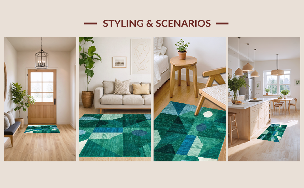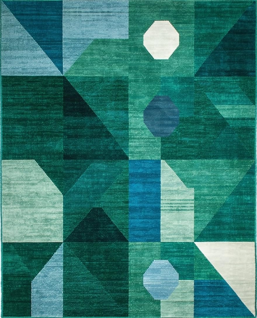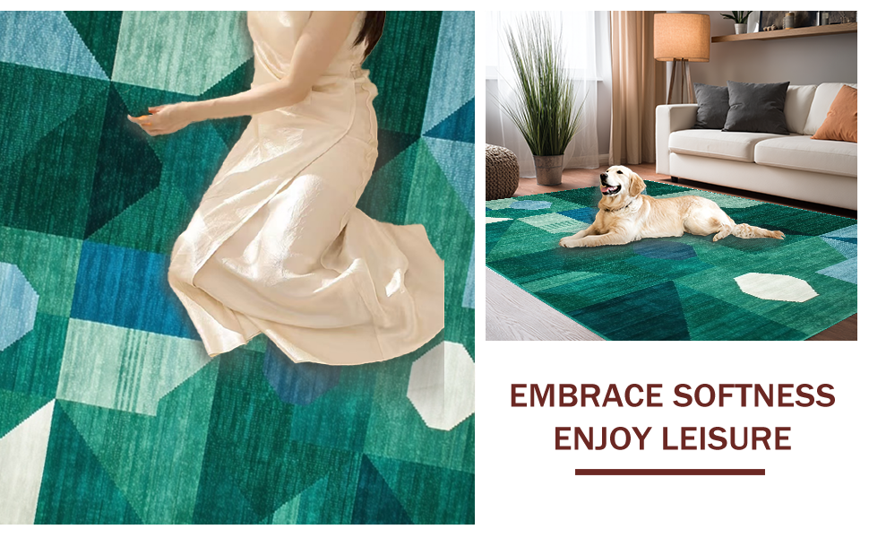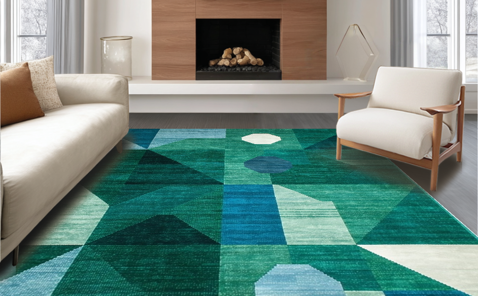 Ultra Soft Area Rug, Non Slip, Stain Resistant, Washable Area Rugs for Living Room, Bedroom, Chic Curved Line Composition in Cool Tones(Green) Overview: