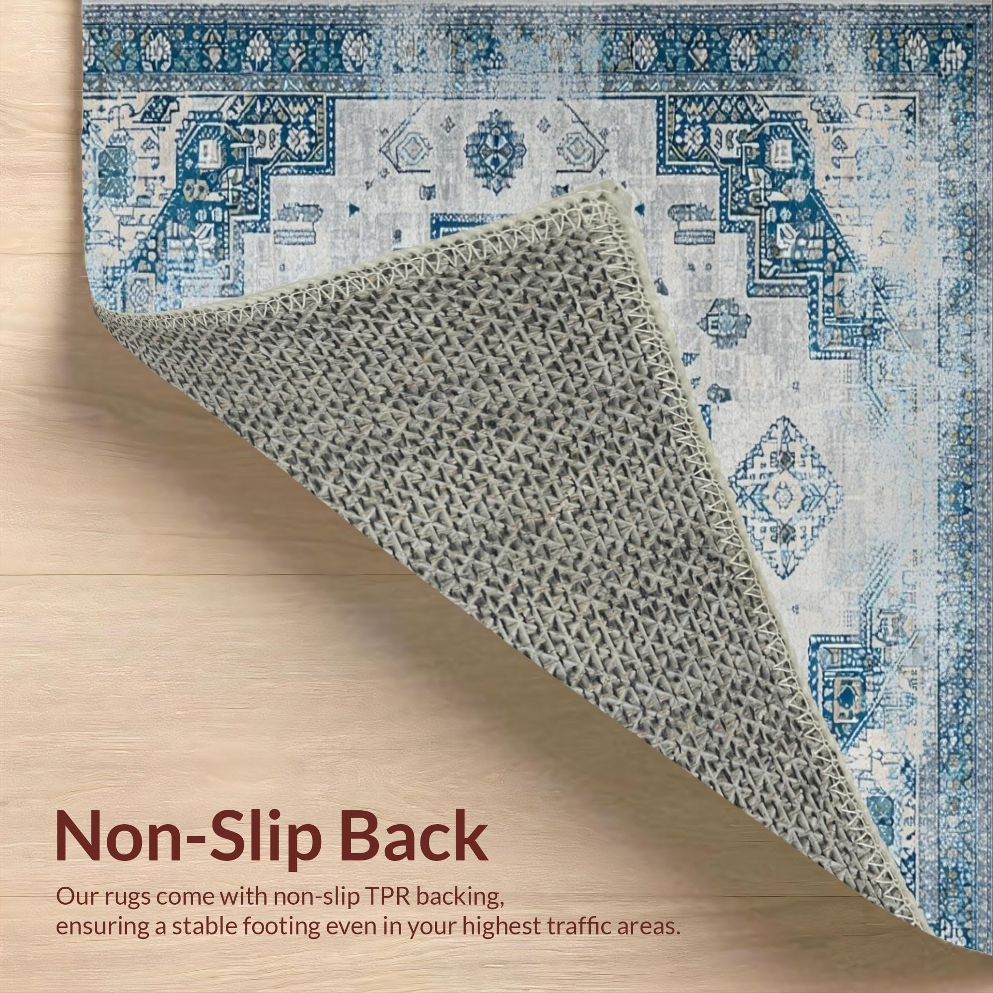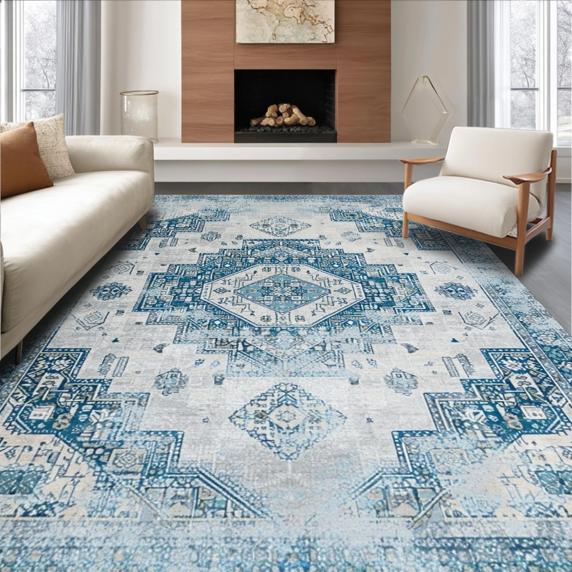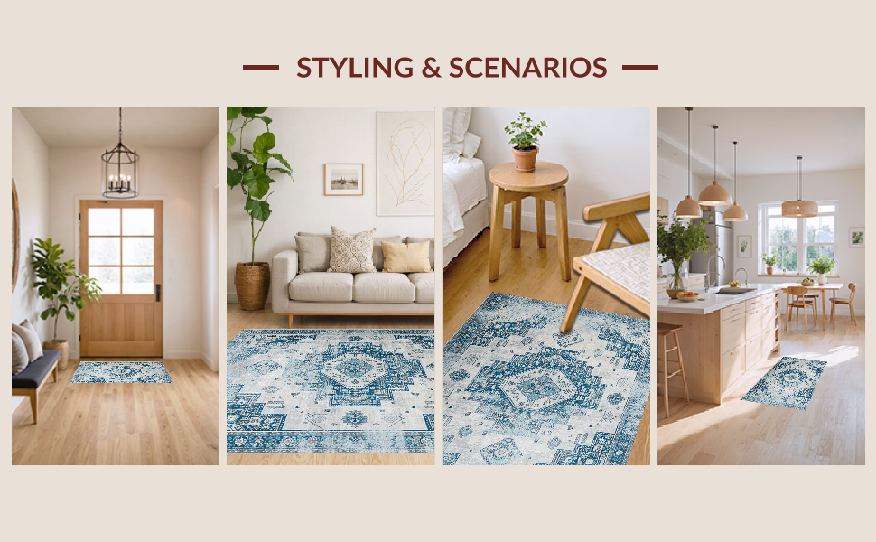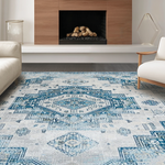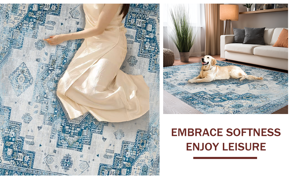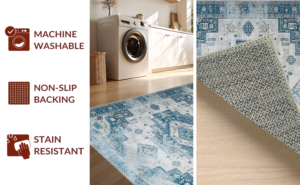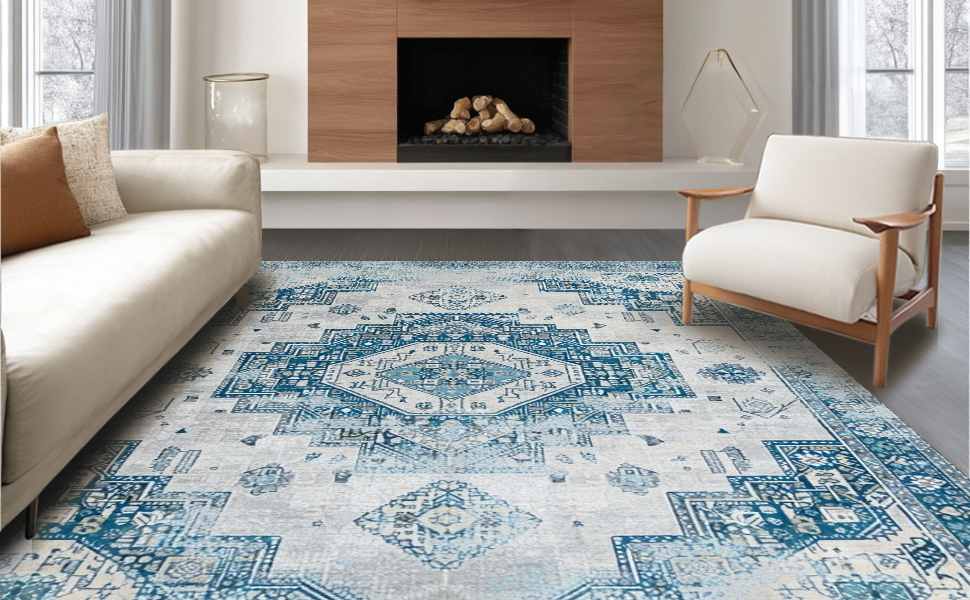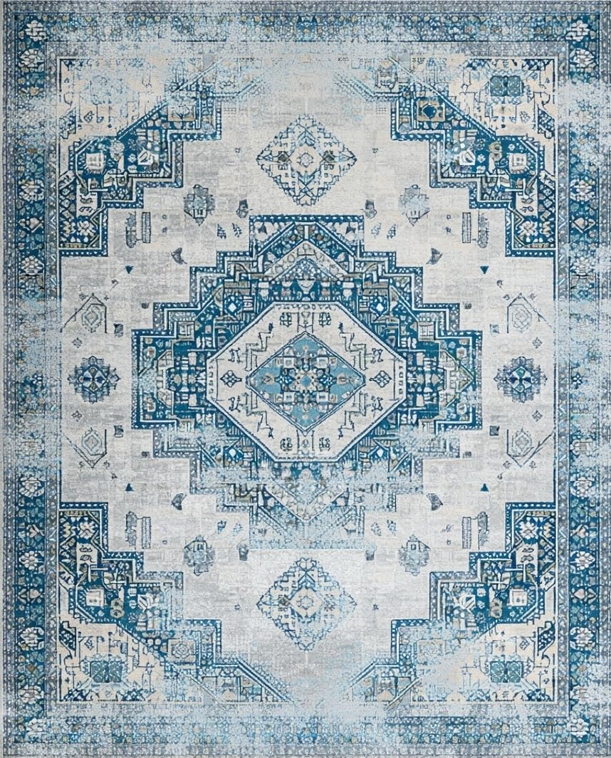 Ultra Soft Area Rug, Non Slip, Stain Resistant, Washable Area Rugs for Living Room, Bedroom, Chic Distressed Tiled Design(Blue) Overview: