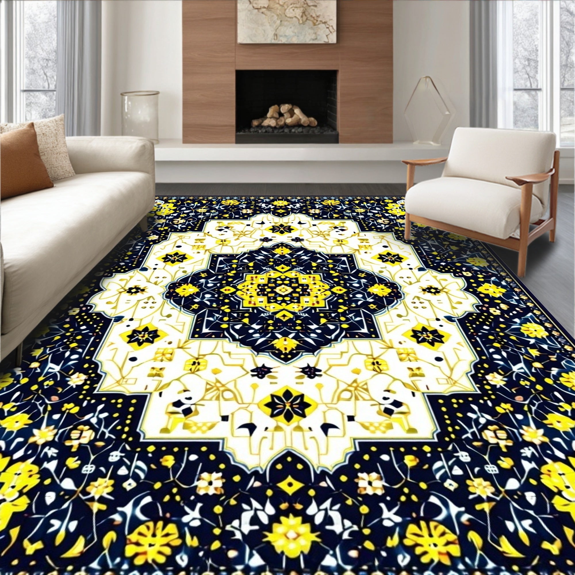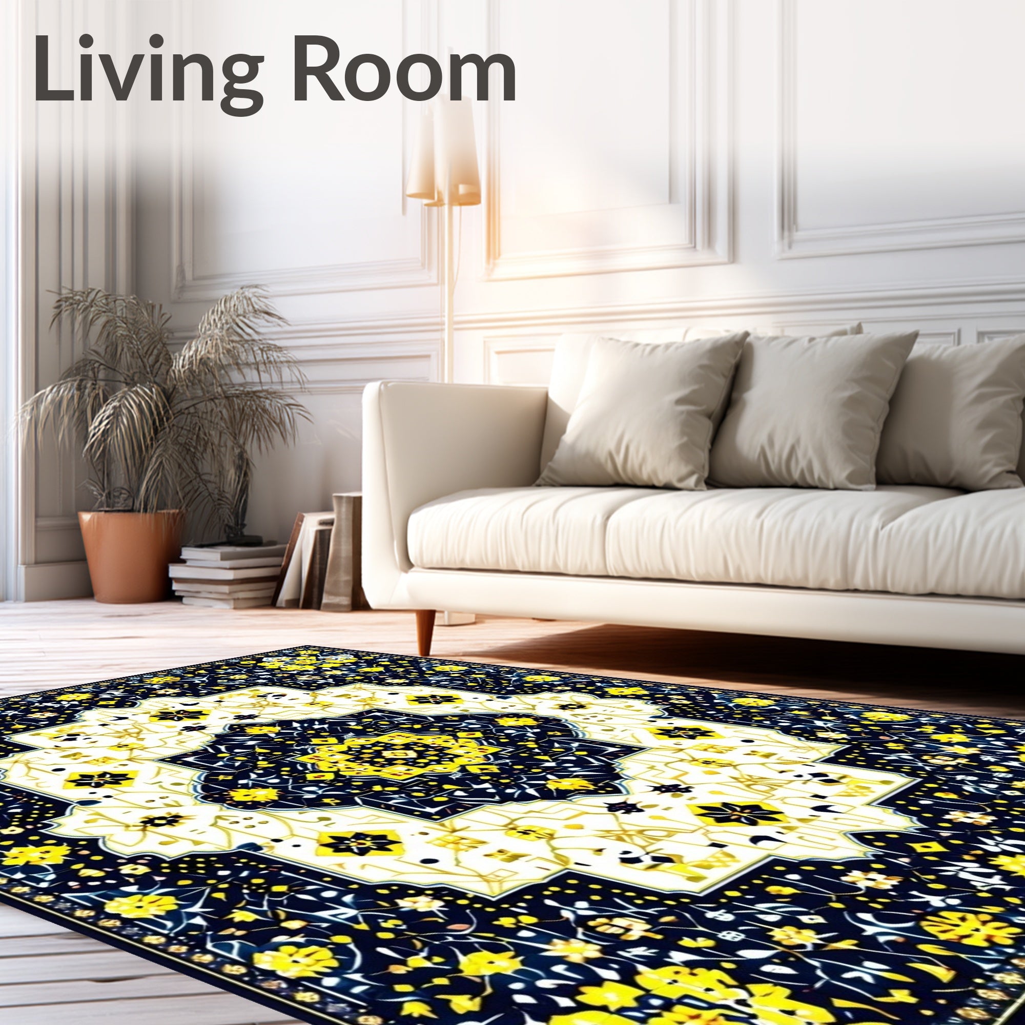 Ultra Soft Area Rug, Non Slip, Stain Resistant, Washable Area Rugs for Living Room, Bedroom, Chic Geometric Area Showcasing Navy and Mustard Decorative Elements(Blue) Overview: