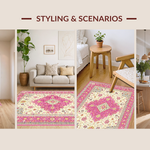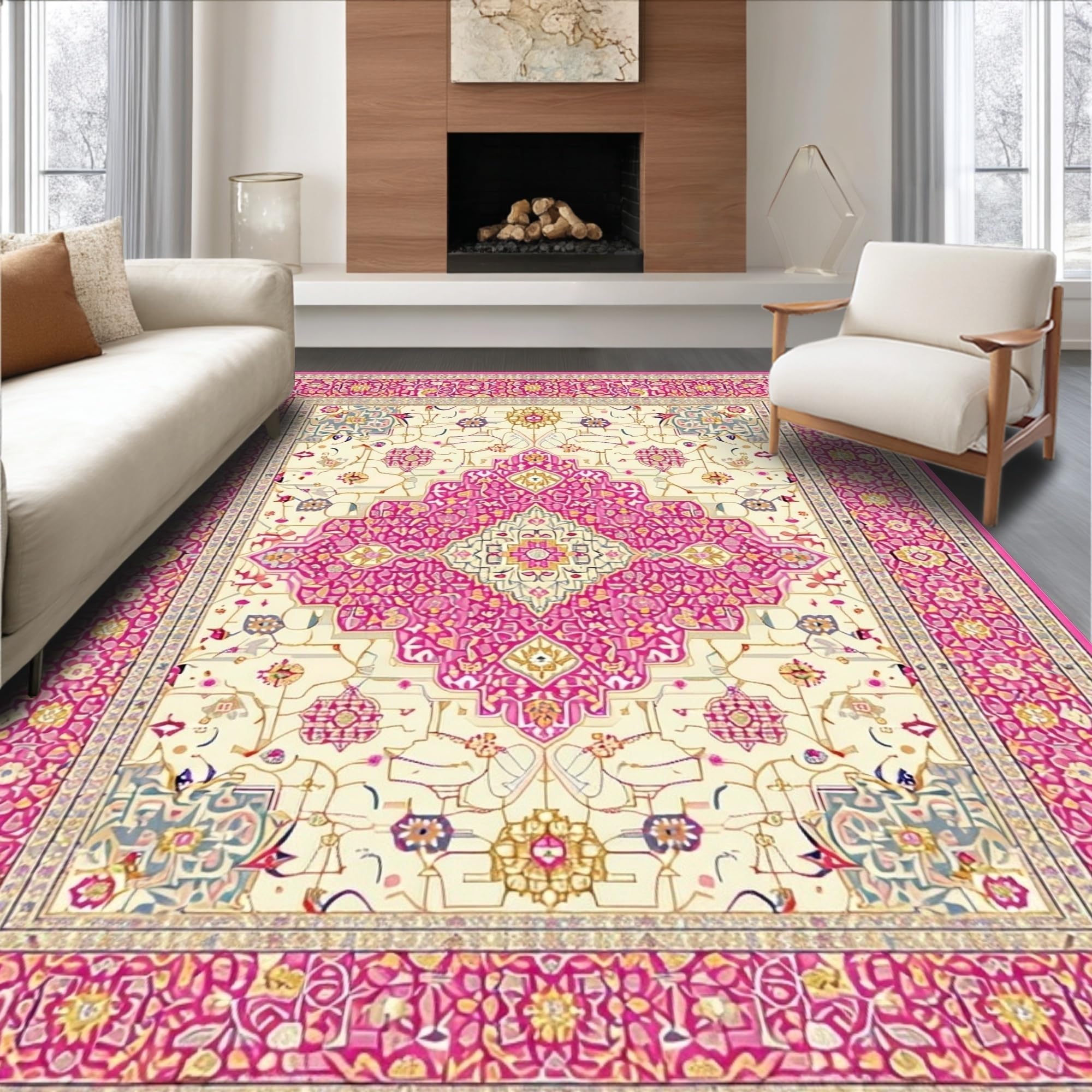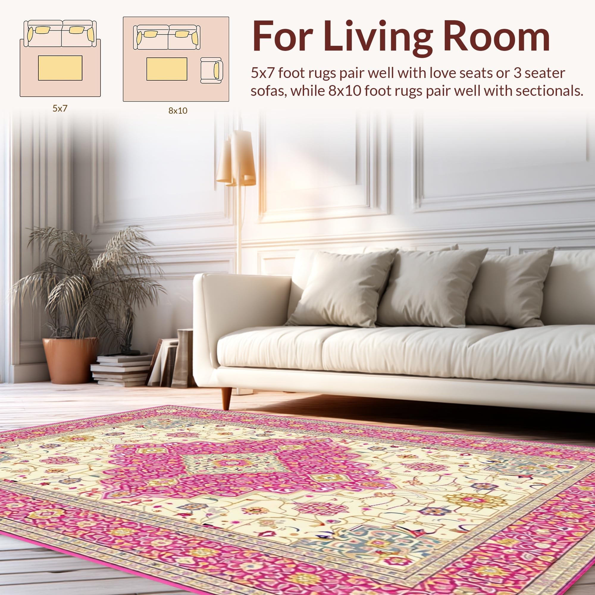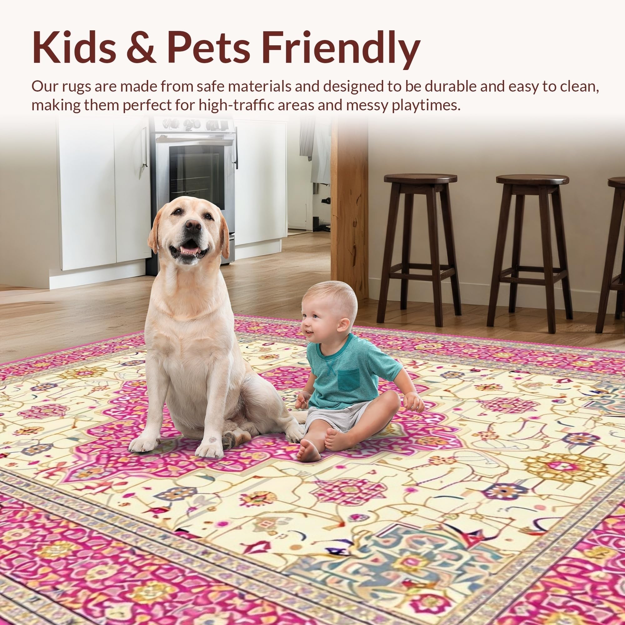 Ultra Soft Area Rug, Non Slip, Stain Resistant, Washable Area Rugs for Living Room, Bedroom, Chic Gold Trimmed Medallion Design(Ivory) Overview: