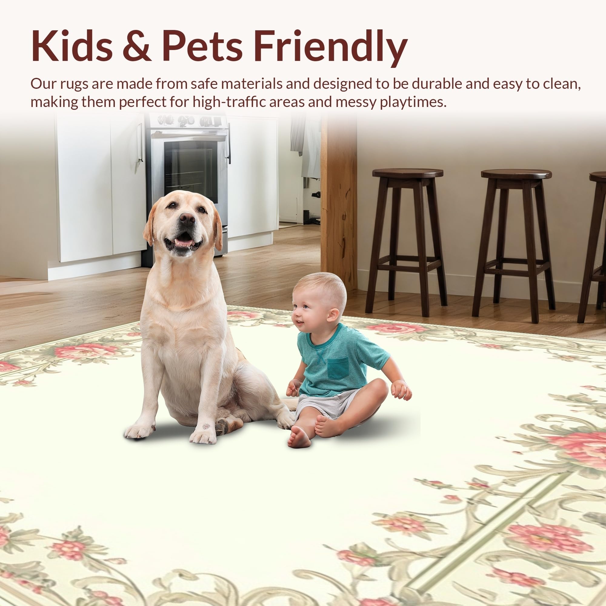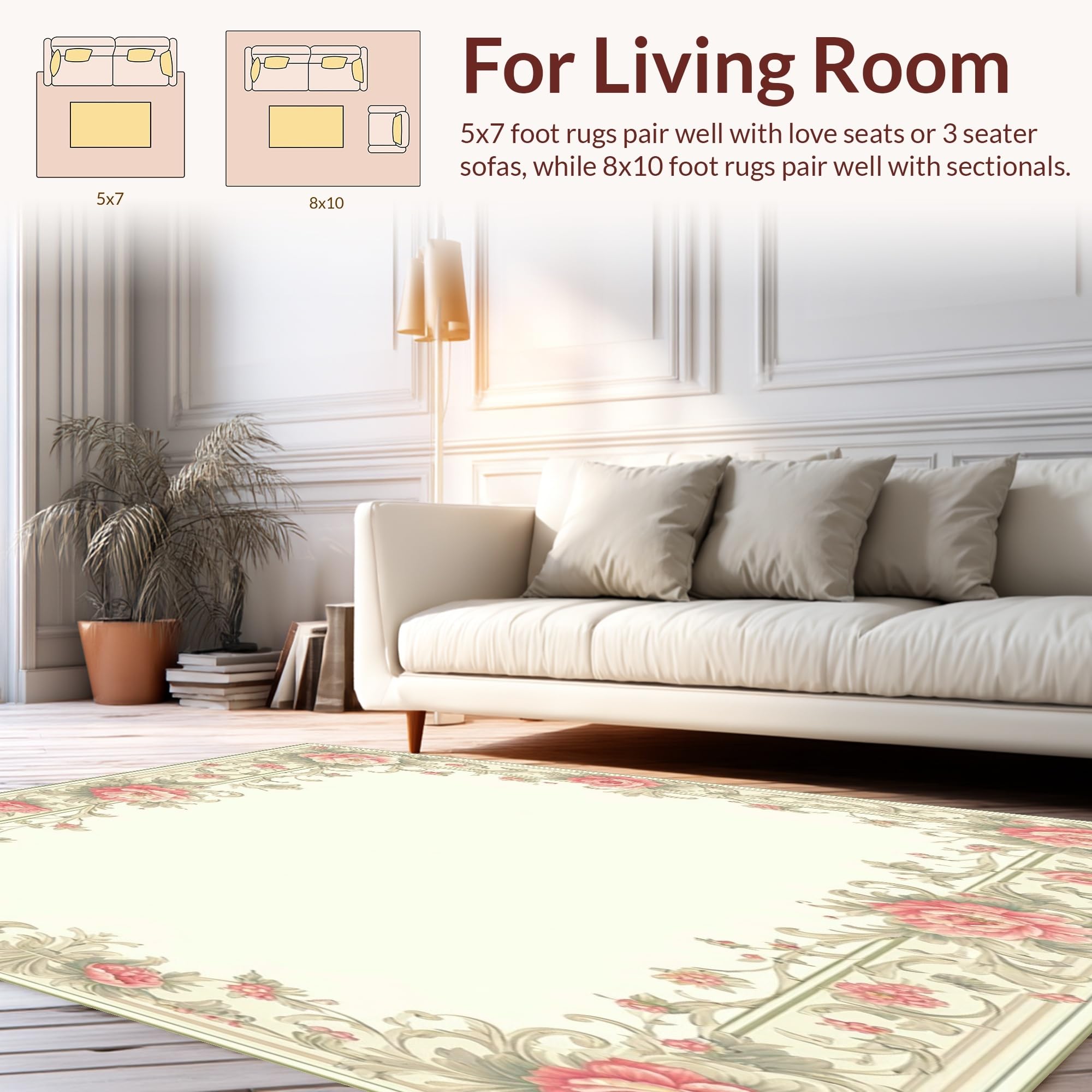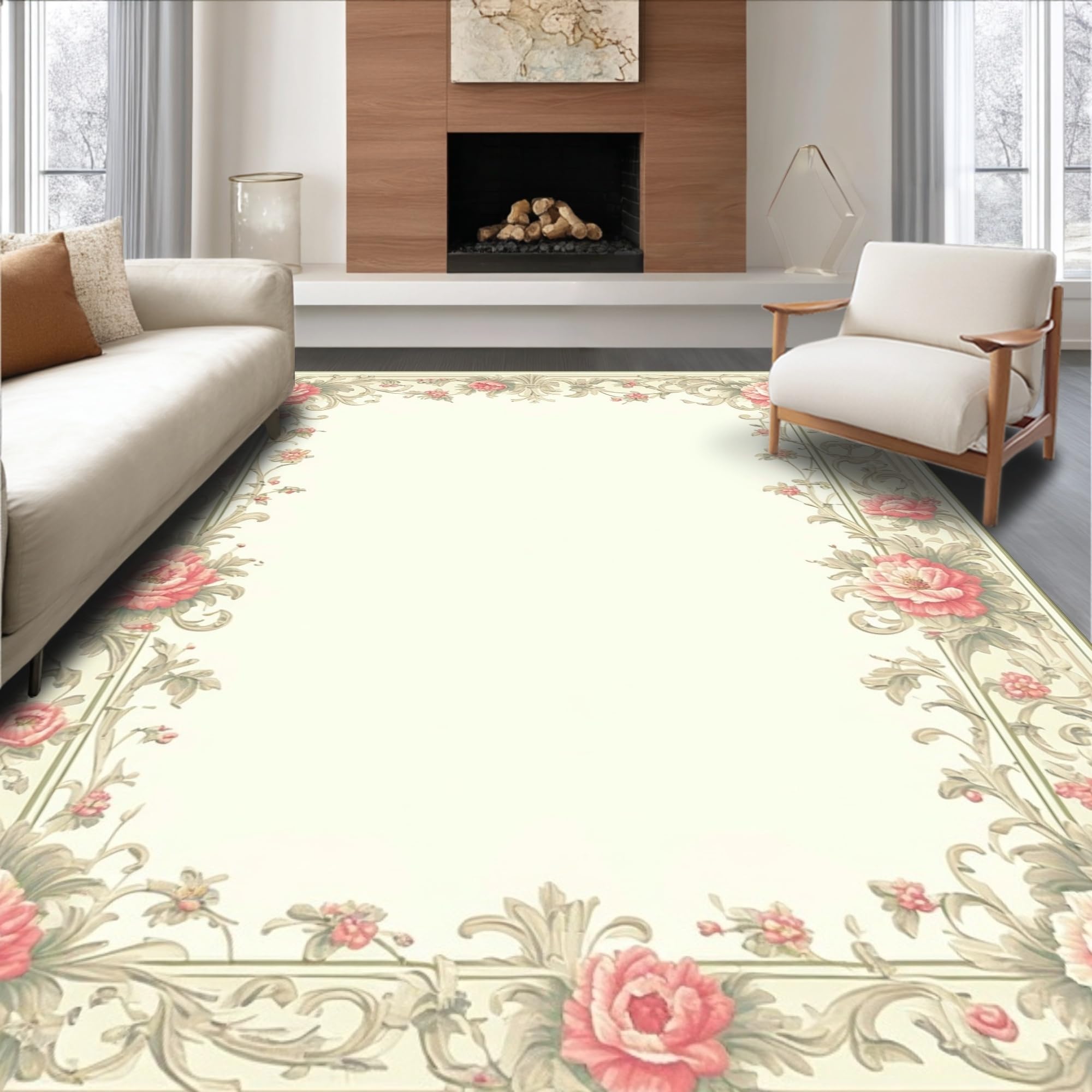 Ultra Soft Area Rug, Non Slip, Stain Resistant, Washable Area Rugs for Living Room, Bedroom, Chic Kitchen with Intricate Floral Borders(Beige) Overview: