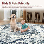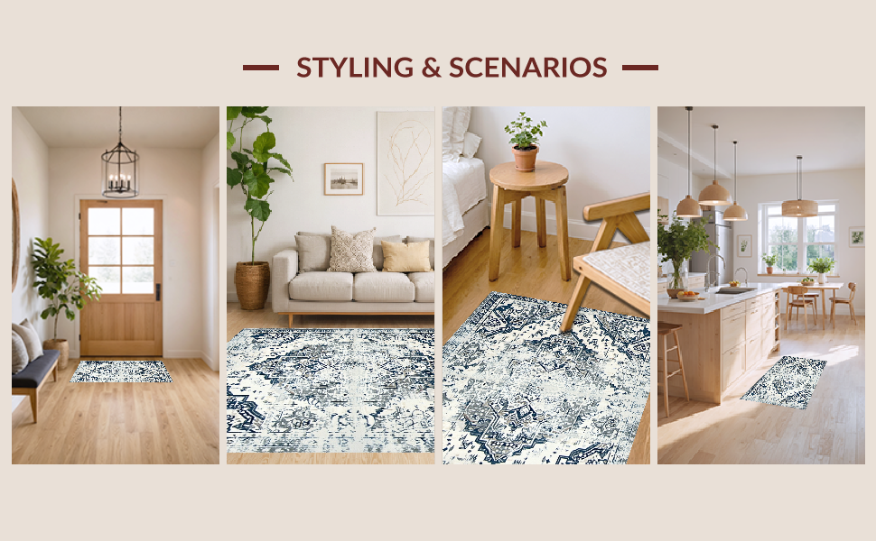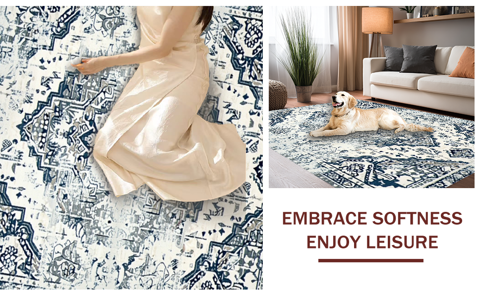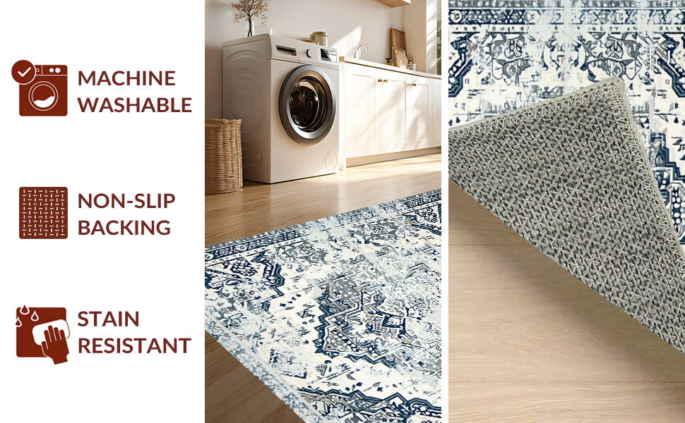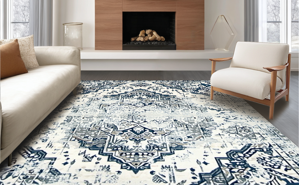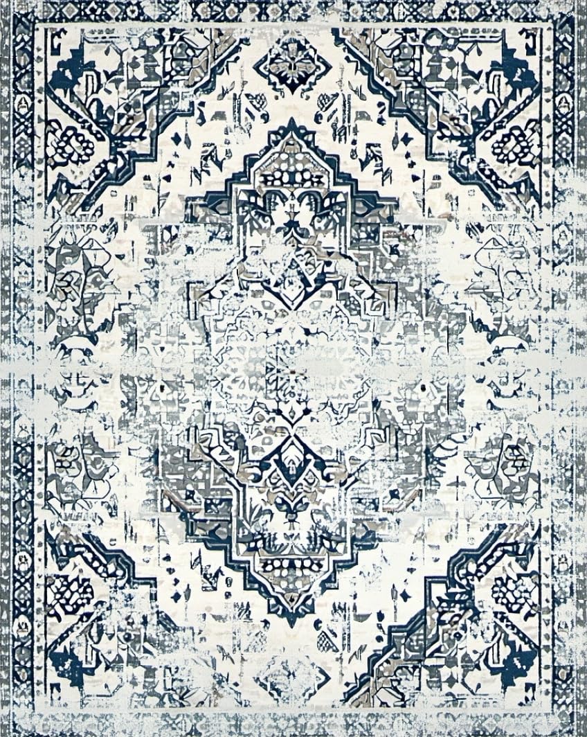 Ultra Soft Area Rug, Non Slip, Stain Resistant, Washable Area Rugs for Living Room, Bedroom, Chic Low-Contrast Distressed Design(Blue) Overview: