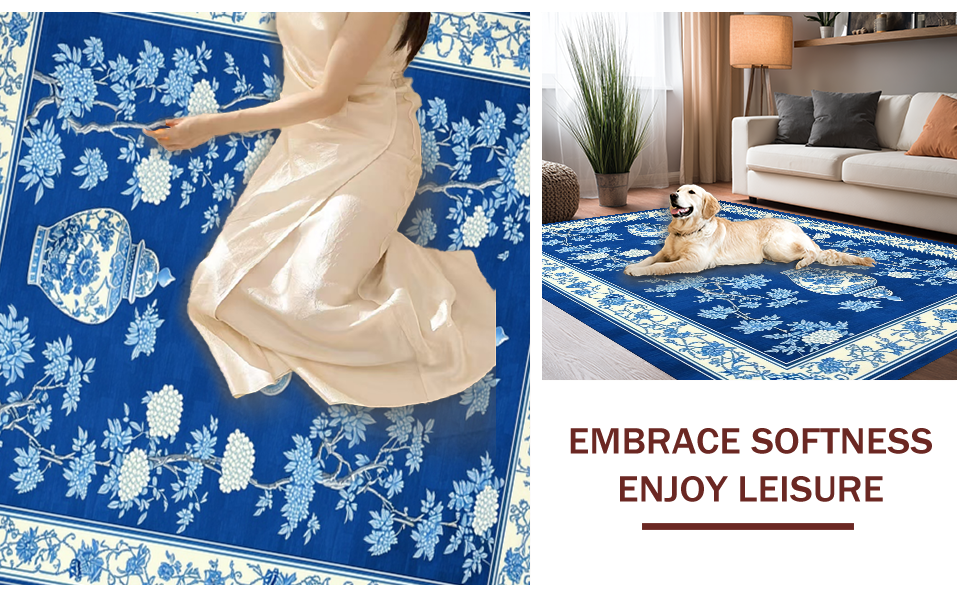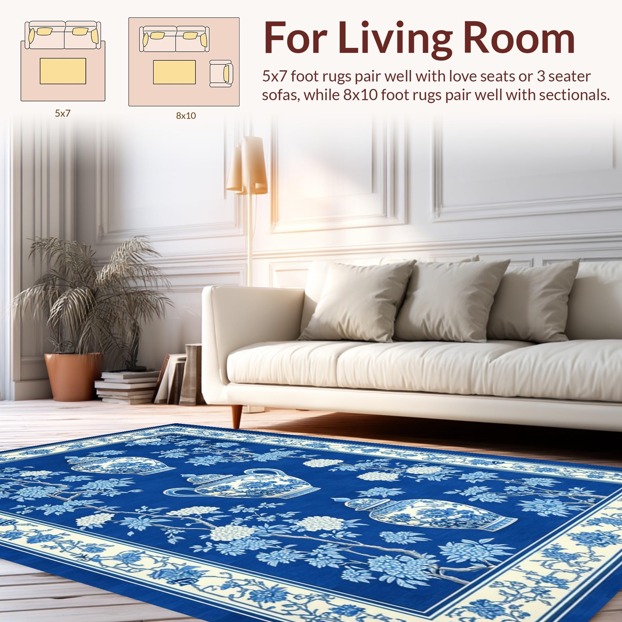 Ultra Soft Area Rug, Non Slip, Stain Resistant, Washable Area Rugs for Living Room, Bedroom, Chic Minimalist White Botanical Pattern(Blue) Overview: