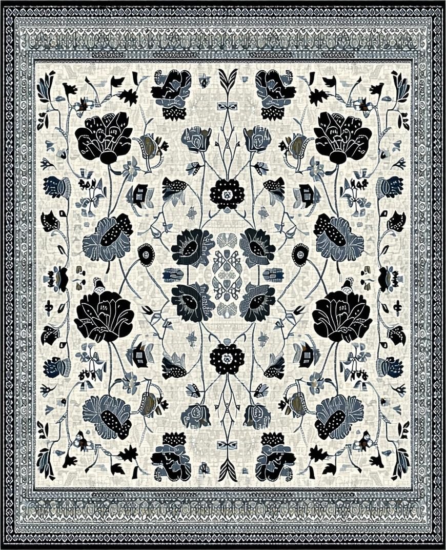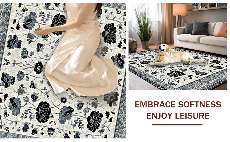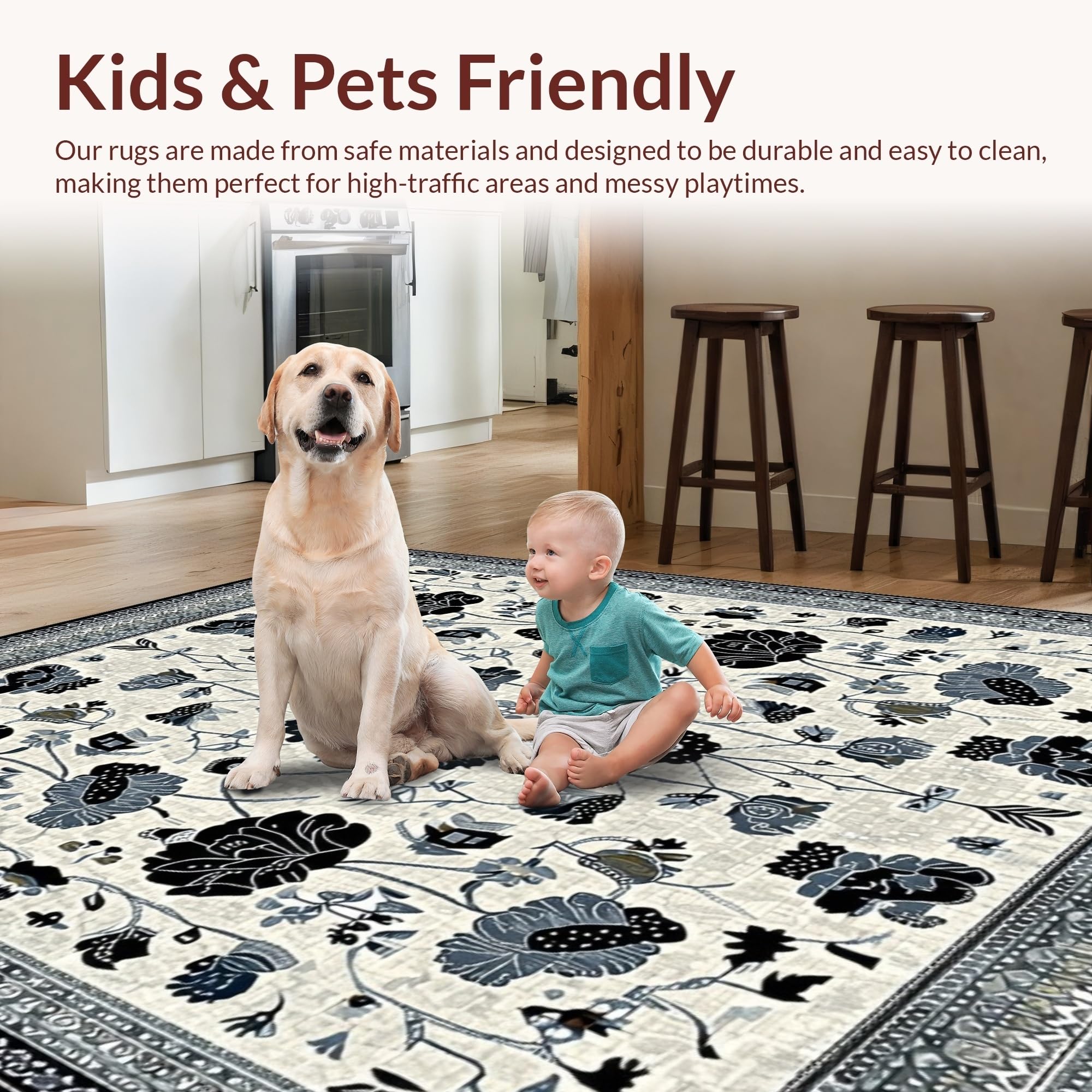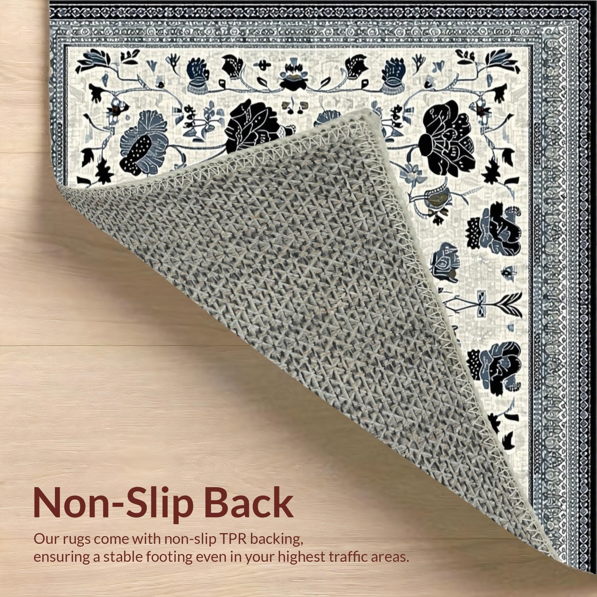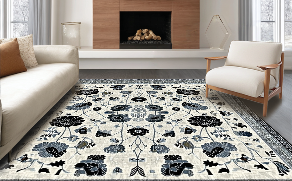 Ultra Soft Area Rug, Non Slip, Stain Resistant, Washable Area Rugs for Living Room, Bedroom, Chic Monochrome Floral Design(Ivory) Overview: