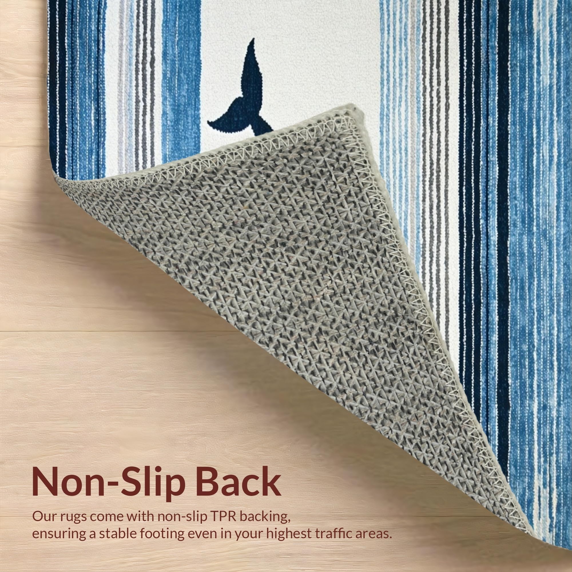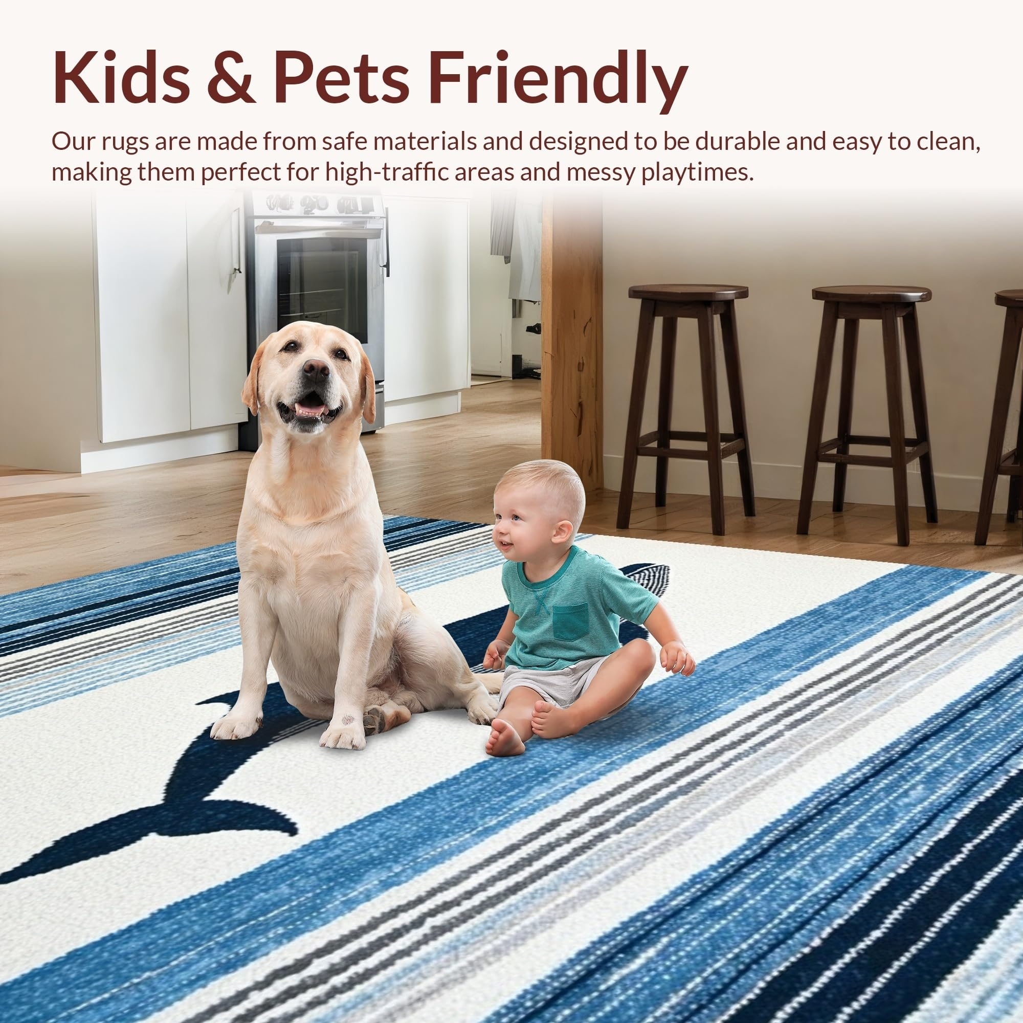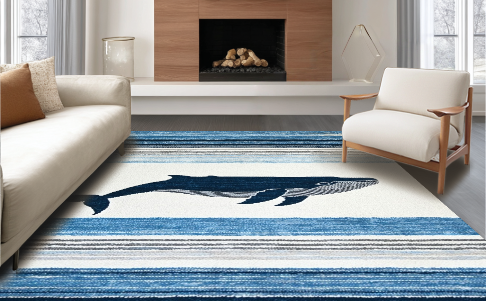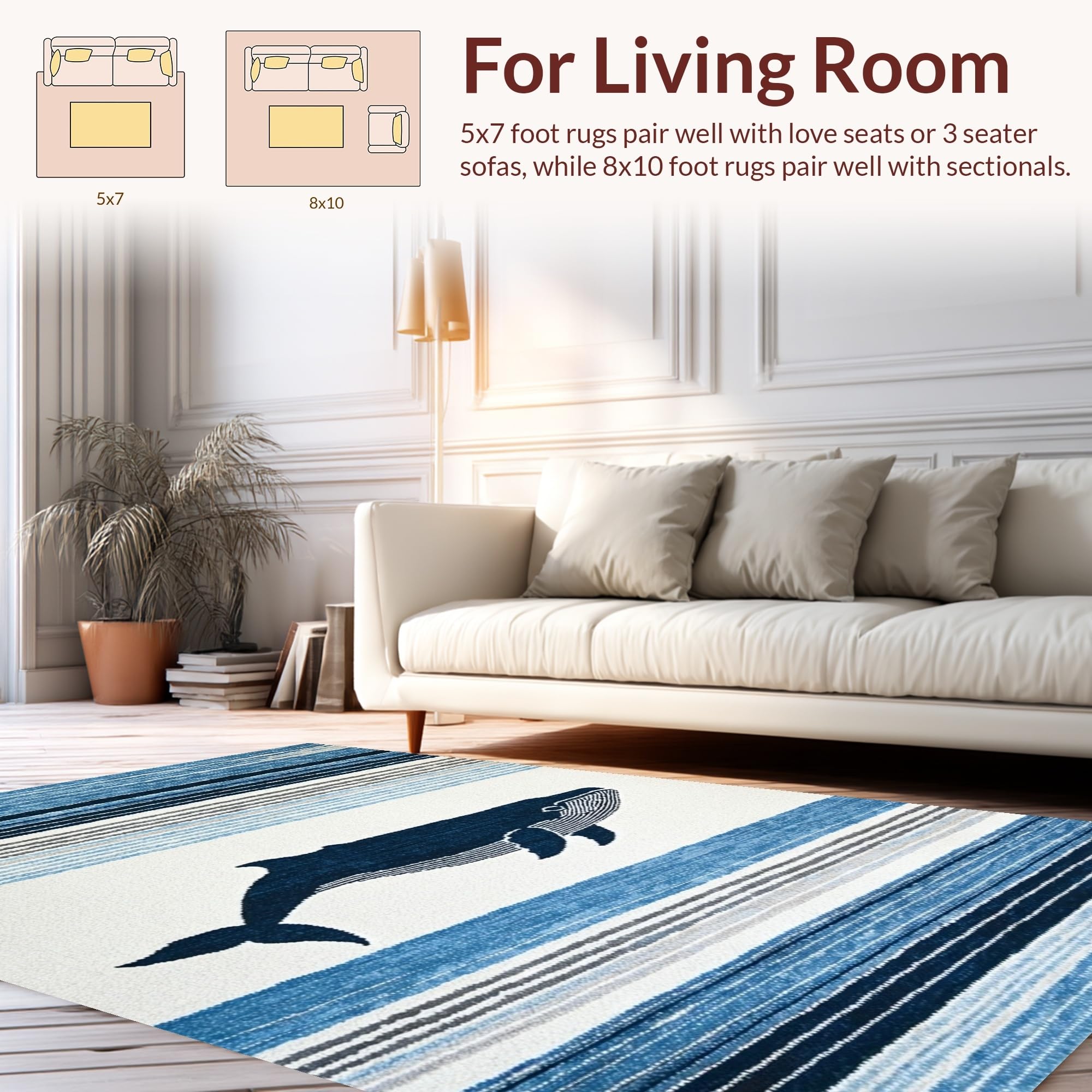 Ultra Soft Area Rug, Non Slip, Stain Resistant, Washable Area Rugs for Living Room, Bedroom, Chic Nautical Whale Aesthetic(Blue) Overview: