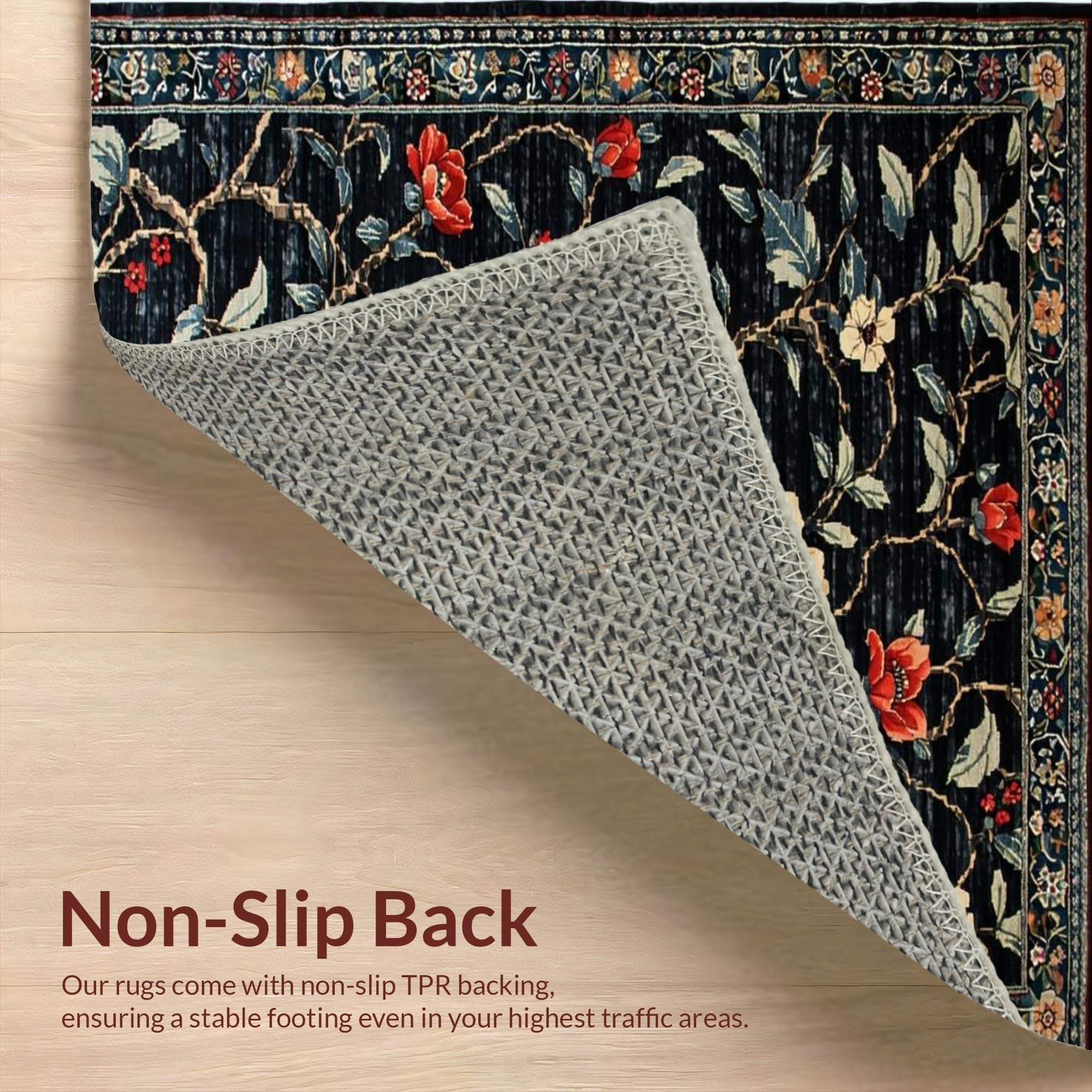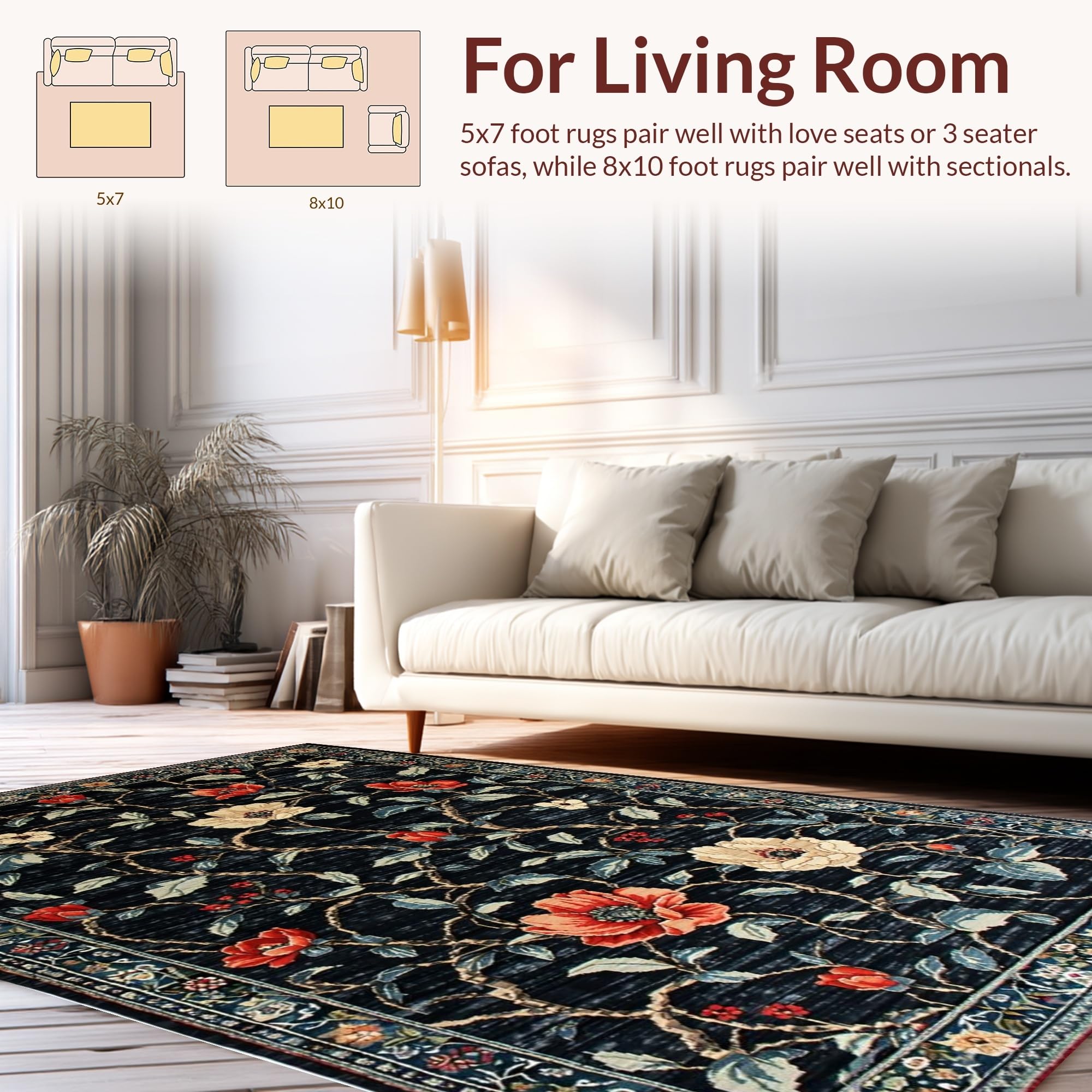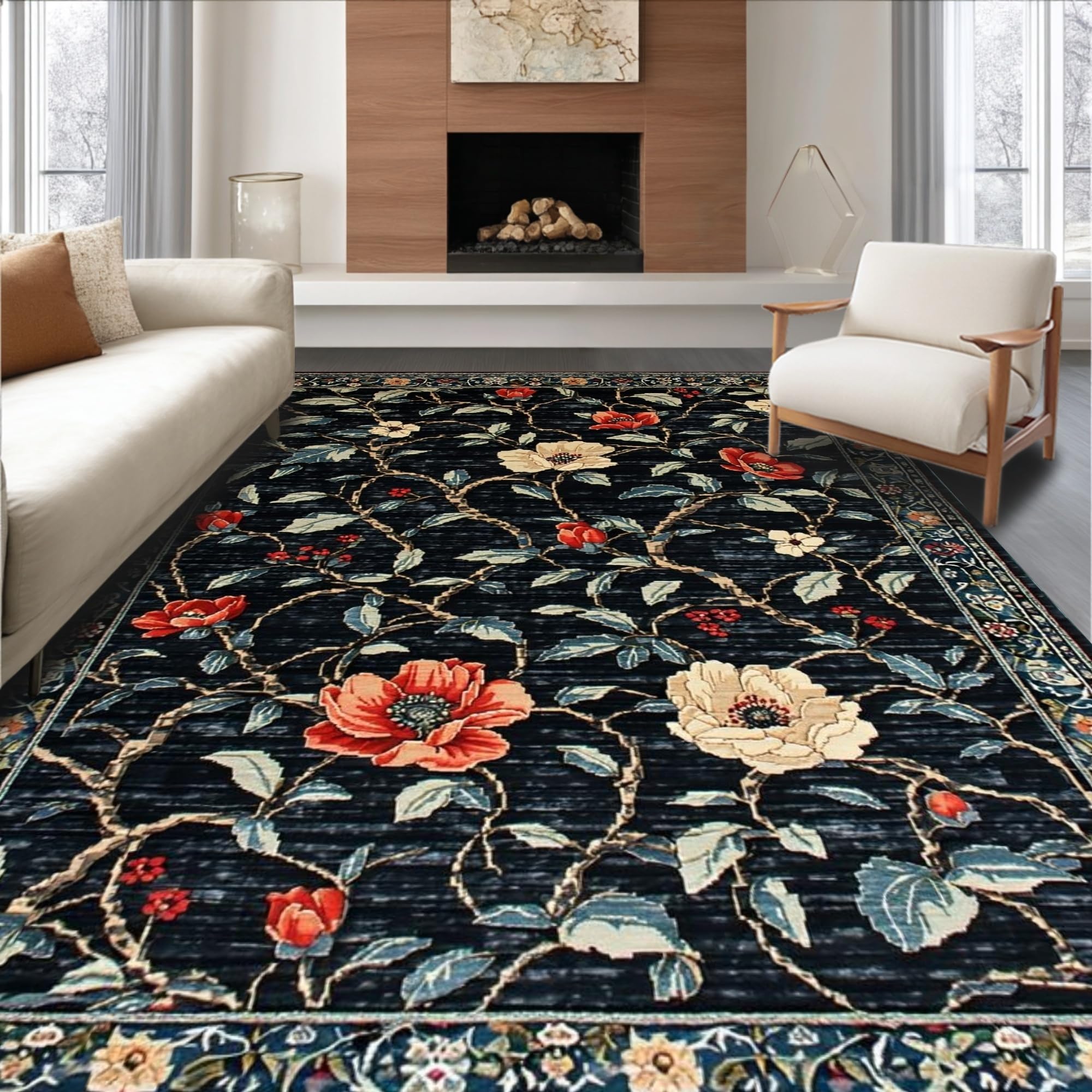 Ultra Soft Area Rug, Non Slip, Stain Resistant, Washable Area Rugs for Living Room, Bedroom, Chic Rustic Floral Accents(Black) Overview: