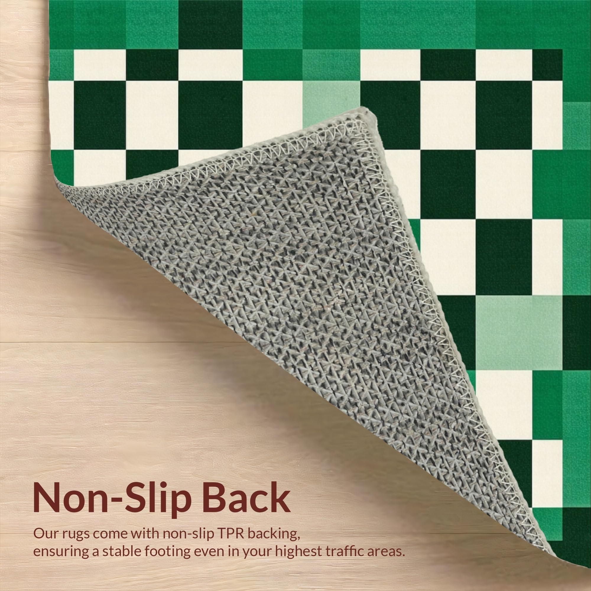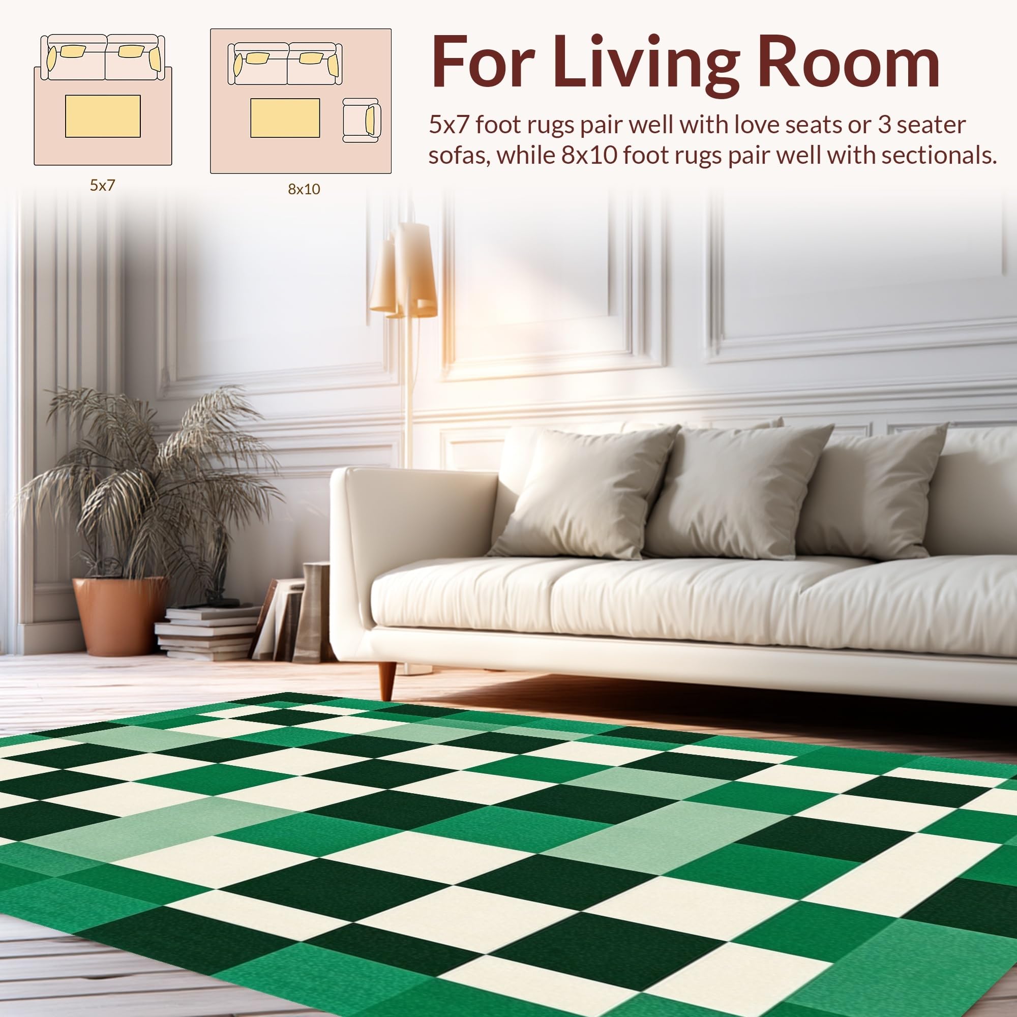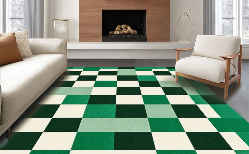 Ultra Soft Area Rug, Non Slip, Stain Resistant, Washable Area Rugs for Living Room, Bedroom, Chic Textured Retro Checker Motif(Green) Overview: