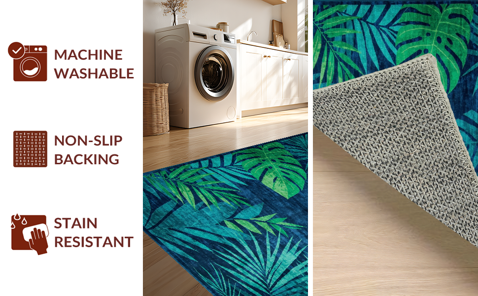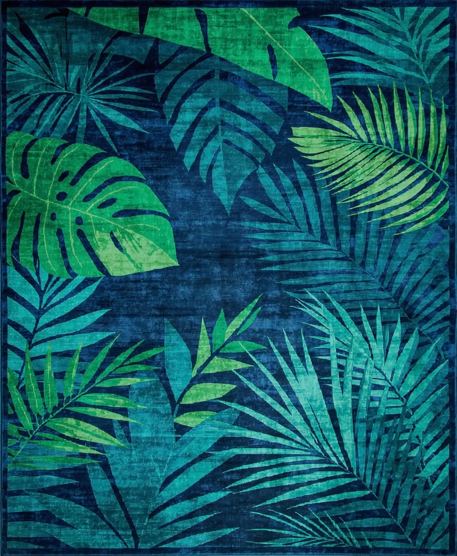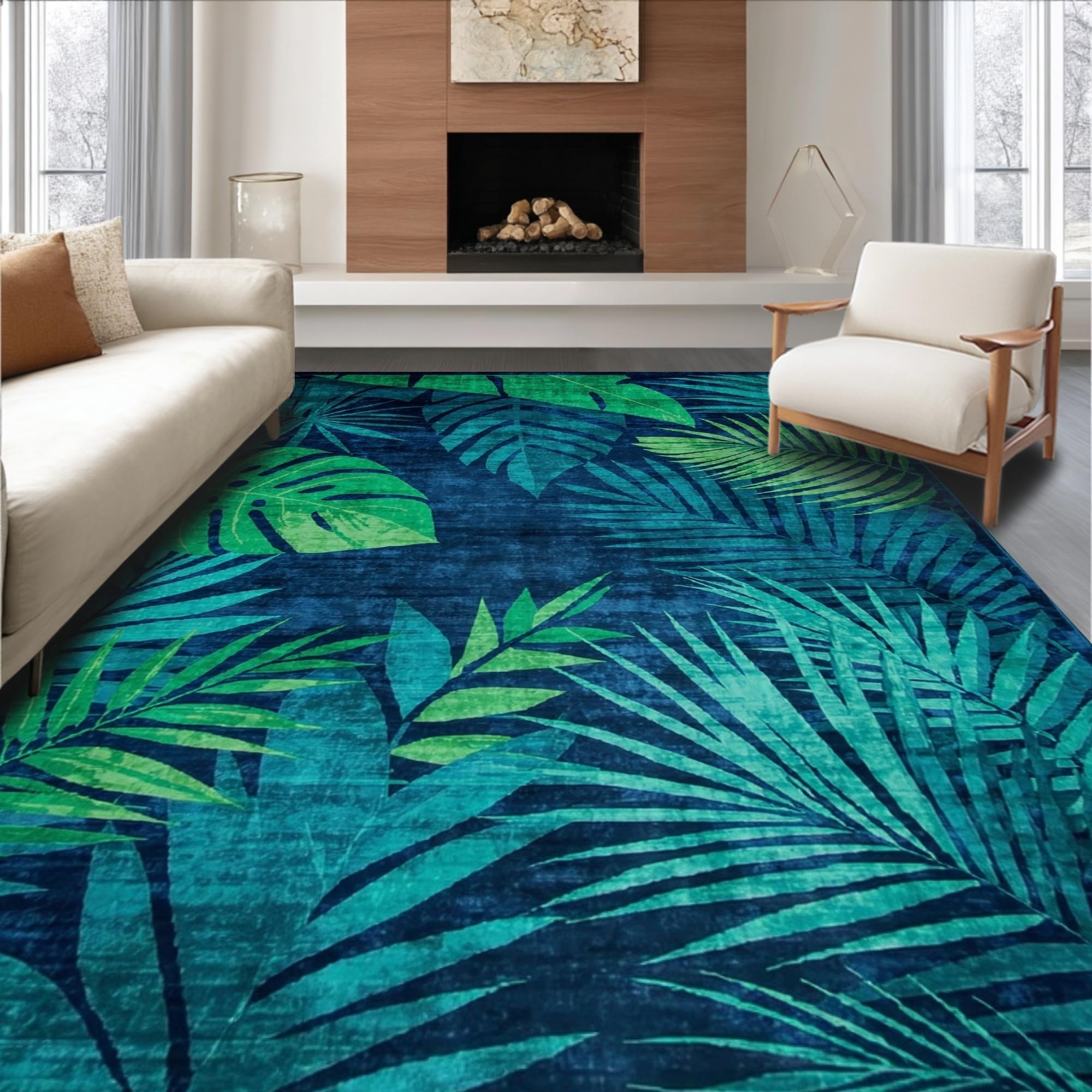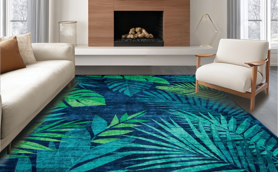 Ultra Soft Area Rug, Non Slip, Stain Resistant, Washable Area Rugs for Living Room, Bedroom, Chic Tropical Linear Elements(Blue) Overview: