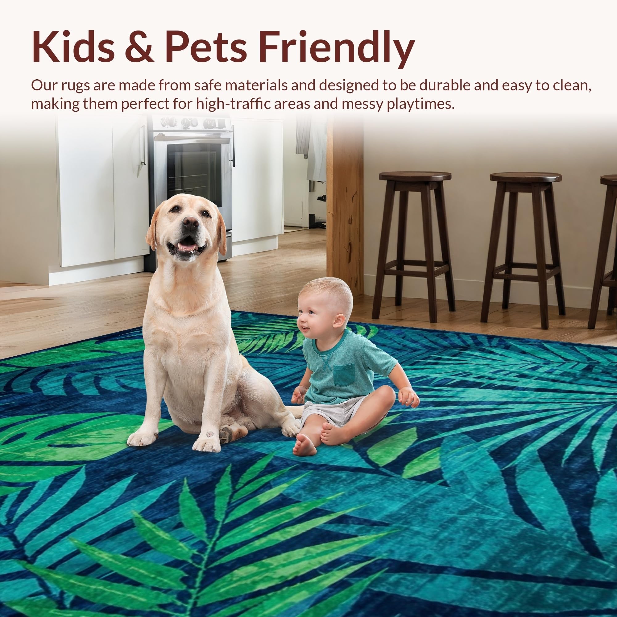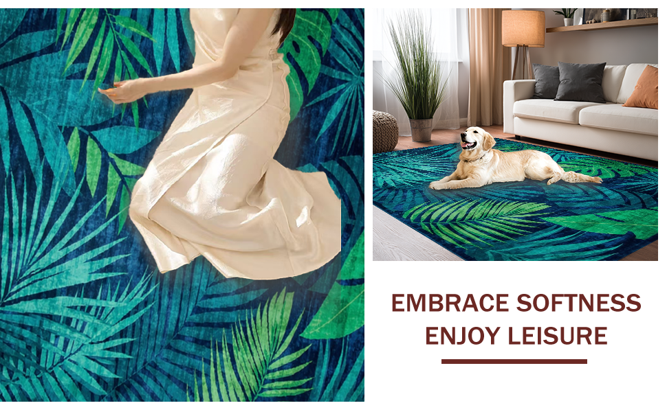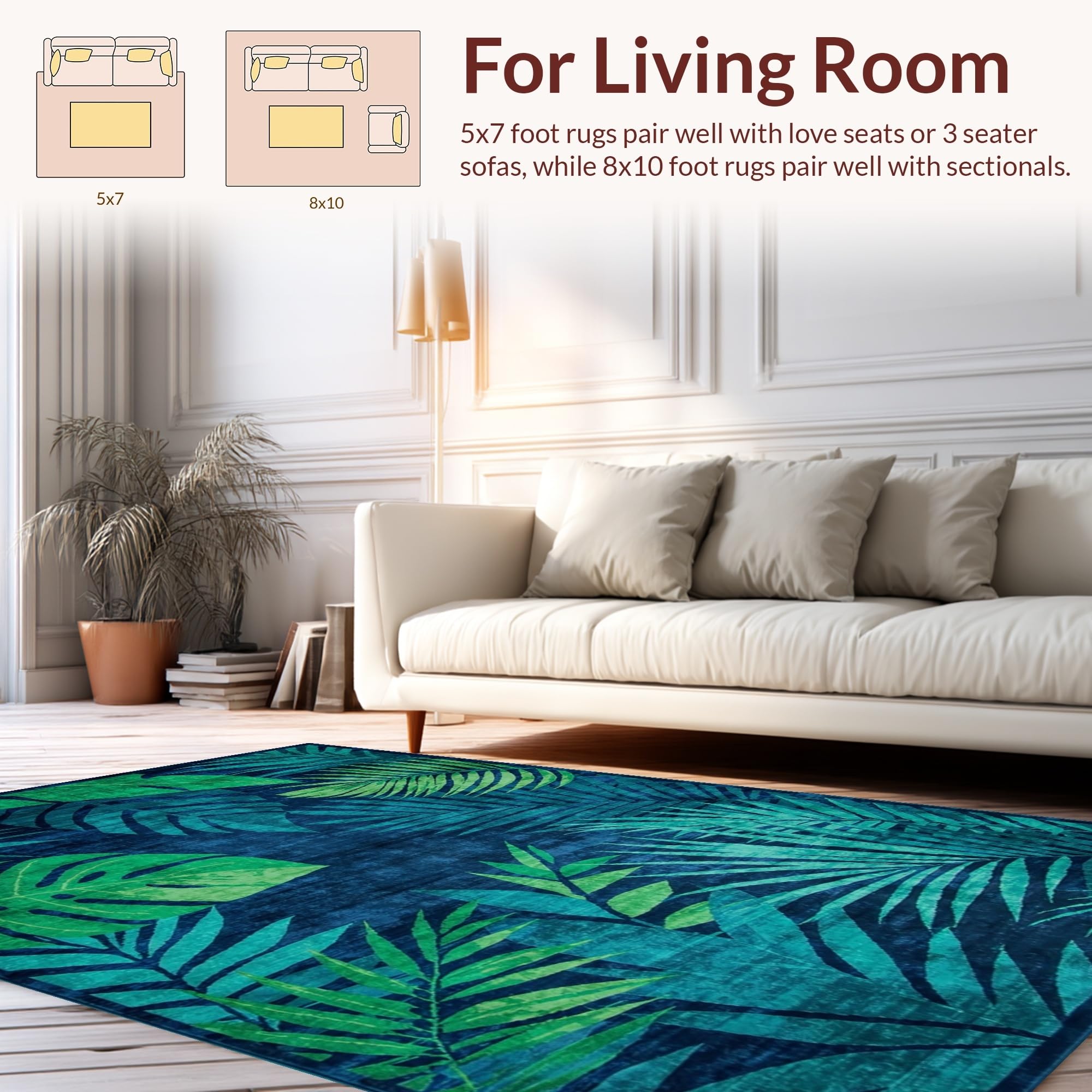 Ultra Soft Area Rug, Non Slip, Stain Resistant, Washable Area Rugs for Living Room, Bedroom, Chic Tropical Linear Elements(Blue) Overview: