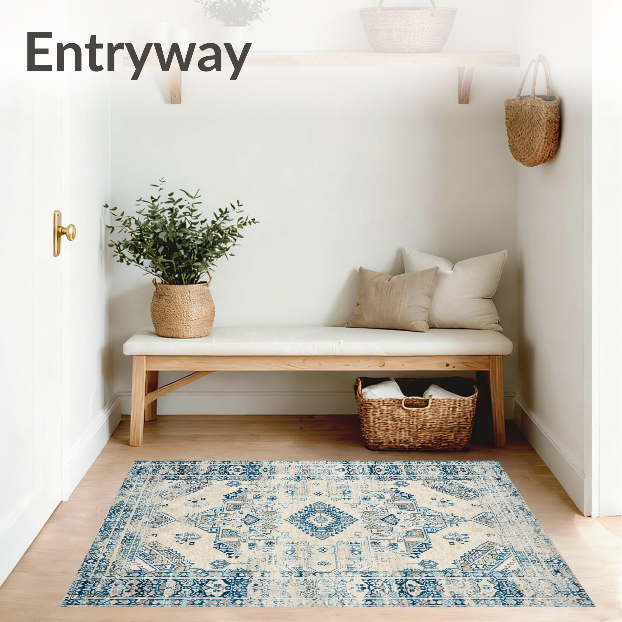 Ultra Soft Area Rug, Non Slip, Stain Resistant, Washable Area Rugs for Living Room, Bedroom, Chic Vintage Boho Area Neutral Beige Blue(Beige) Overview: